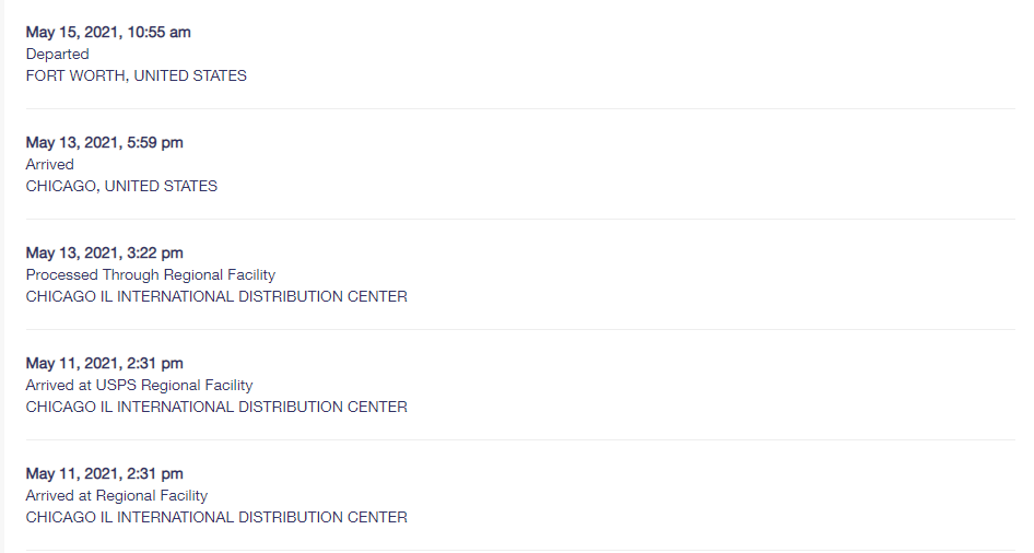 근데 27일 이후에 업데이트가 계속 안되었다. 뭐 이딴... 5월 둘째주 부터 매일 트래킹을 추적하는게 일과처럼 되었다. 마침내 11일 부터 업데이트가 되었고 쭉쭉 만족스러운 업데이트가 이루어 졌다. 시카고에 갔다가 출발은 왜 포트워스에서 했는지 모르겠지만...