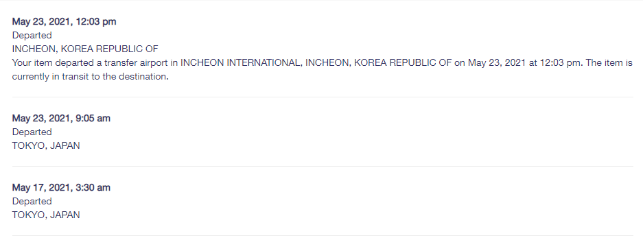 근데 갑자기 일본이 찍혔다. 내 물건이 일본으로 간 것이다. 알아보니 USPS First class는 저렴한 대신에 일본 경유를 종종 한다고 한다. 아니 난 17달러나 냈는데.... 여기서 17일날 하네다에서 도쿄로 갔다가 도쿄에서 인천으로 23일 출발했다.