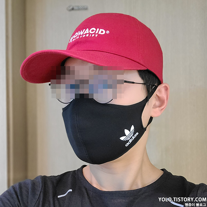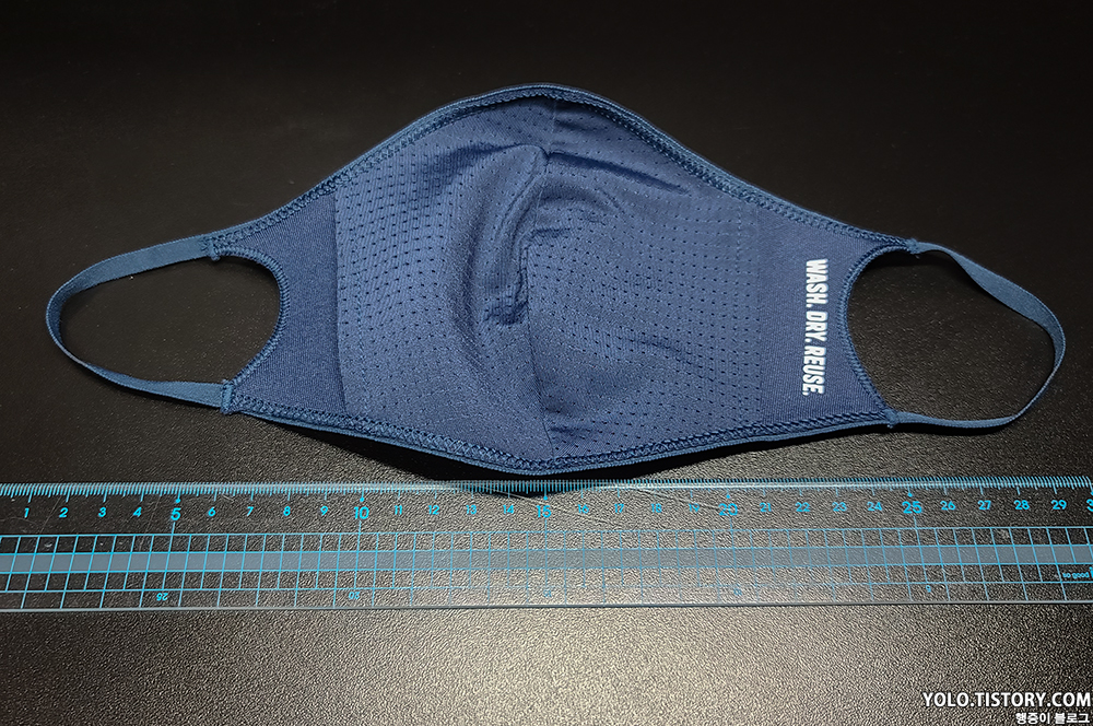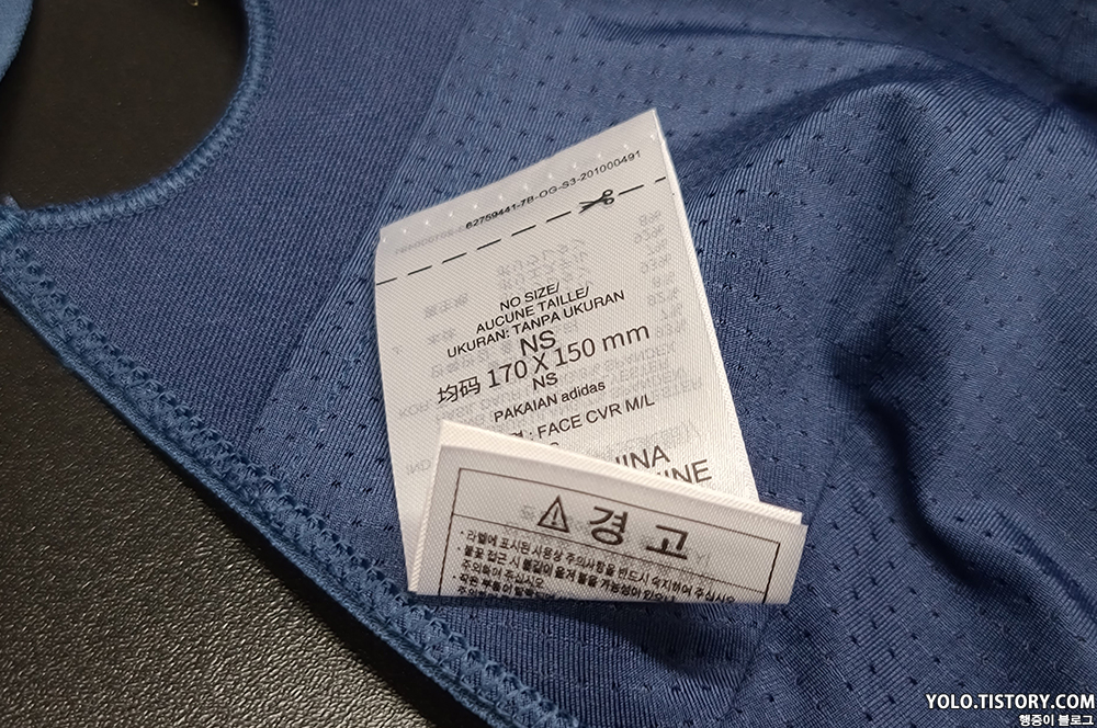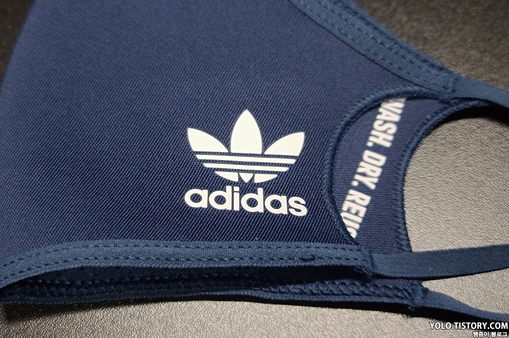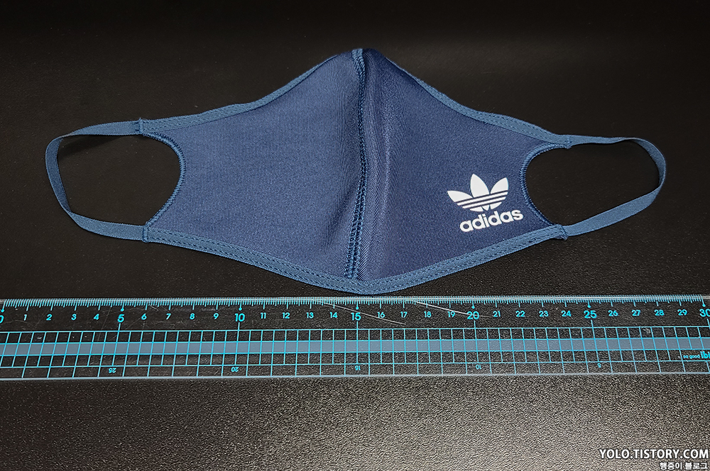 마스크의 가로 사이즈는 쫙 펼치면 약 30cm 정도 나온다. 겉면에는 아디다스 로고가, 안쪽에는 재사용이 가능하다는 안내 문구가 새겨져 있다. 왠지 몇번 빨면 다 떨어질 것 같아 보인다.