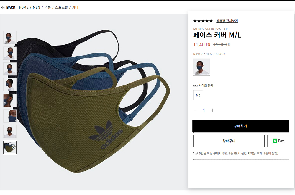 페이스 커버 말고, 데일리 마스크가 있던데 무슨 차인지는 모르겠고 판매하는 색상이 다르다. 내가 산 아디다스 페이스 커버는 블랙, 네이비, 카키 3가지 색상이다.