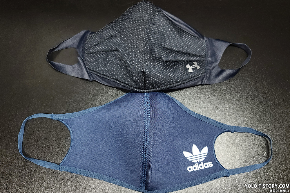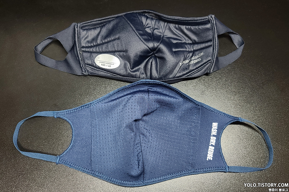 이전에 구매했던 언더아머 M 사이즈 마스크랑 비교. 크기는 엇비슷하다. 언더아머 마스크는 너무 두꺼워서 격한 운동시에 숨쉬기가 힘들어서 잘 사용하지 않고 있다.