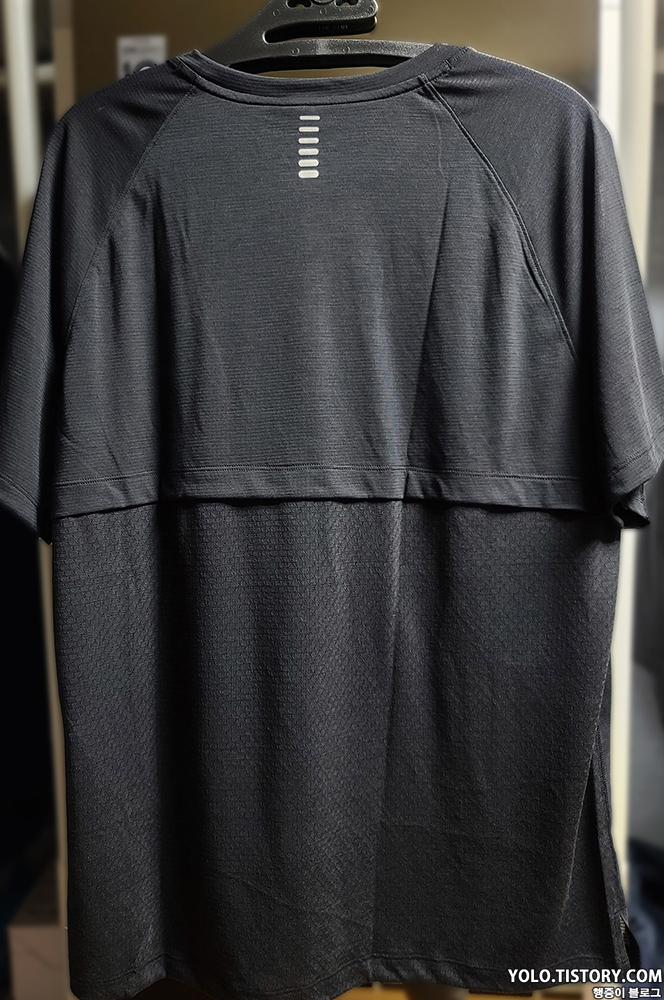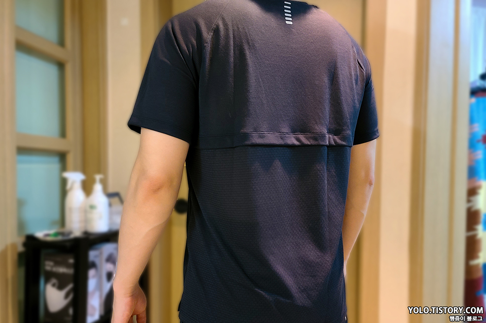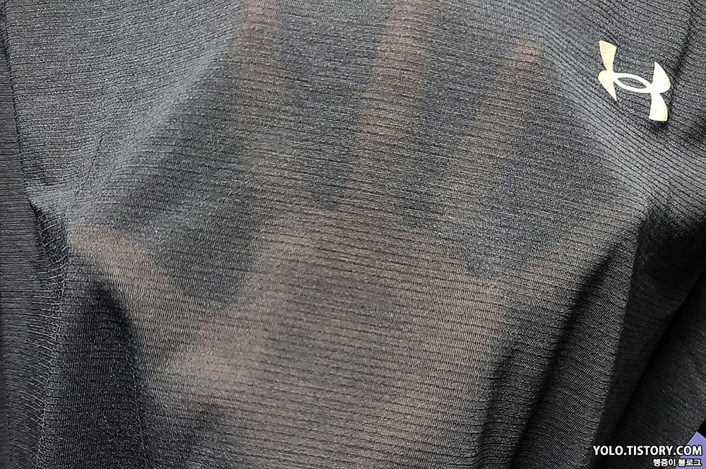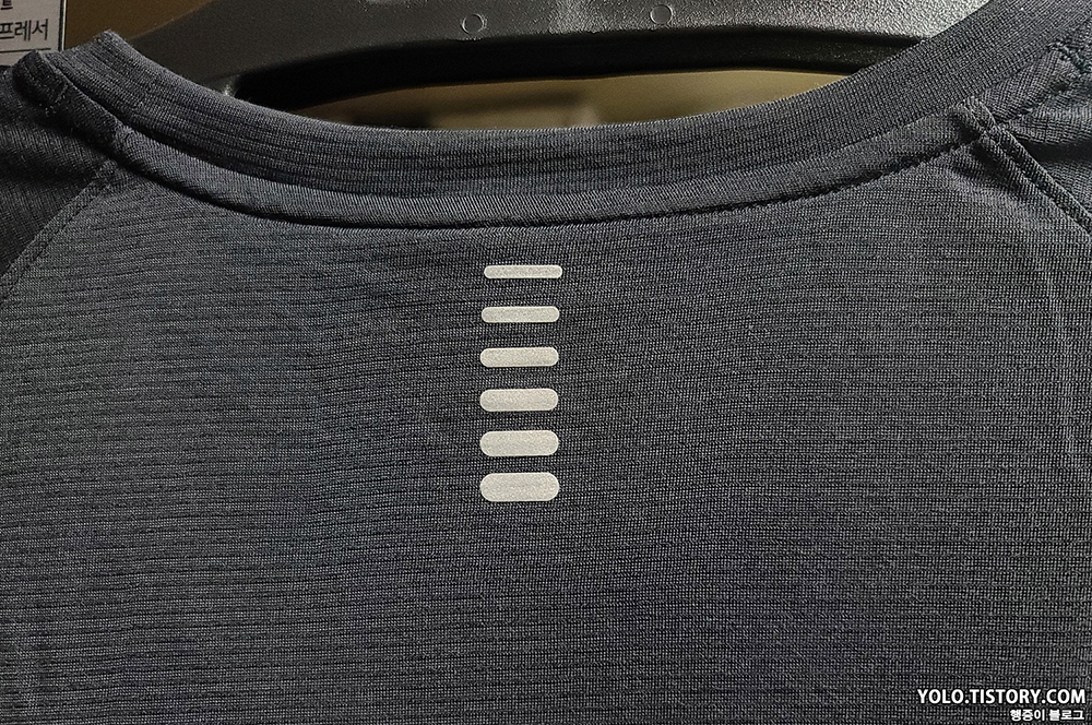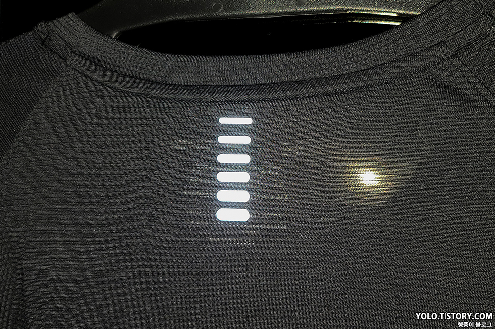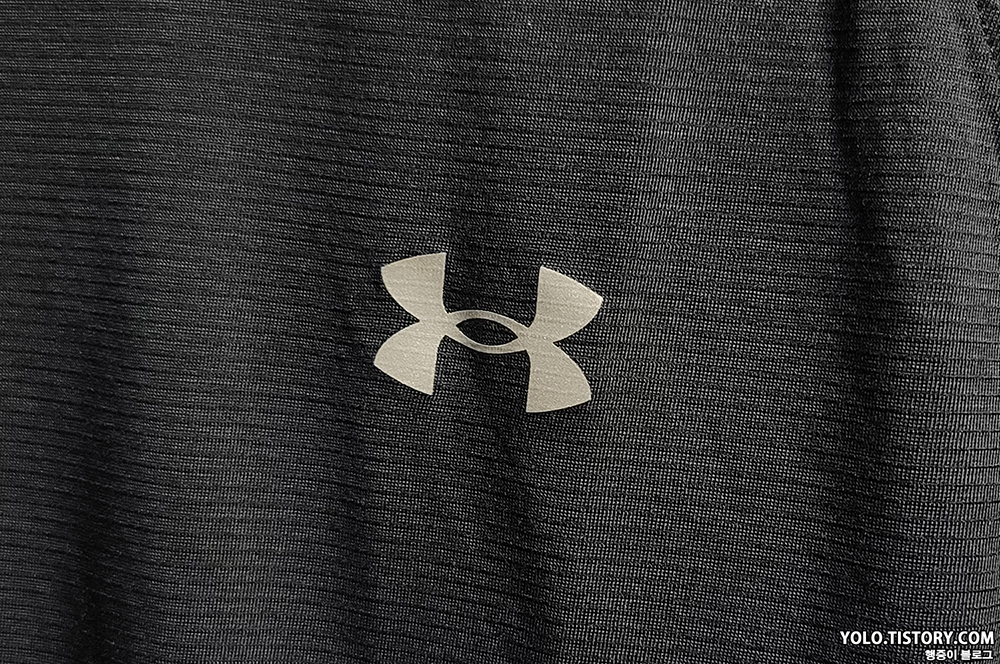 러닝 제품 답게 리플렉티브 디테일이 있다. 가슴 쪽 언더아머 로고와 목 쪽 부분에 빛을 비추면 반사되어 빛난다.