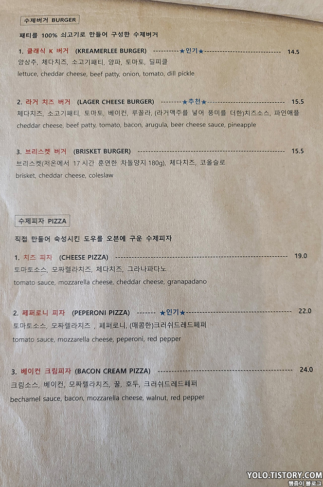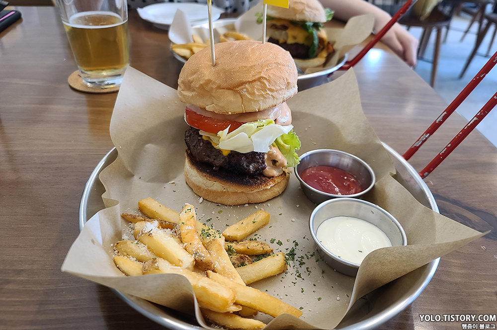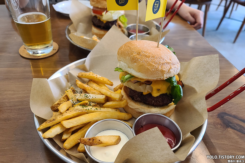 느끼한 걸 좋아해서 그런지 개인 적으로 라거 치즈 버거가 더 맛있었던 것 같다. 대신 야채가 좀 부족해서 먹다보면 느끼할 수도. 클래식 K 버거는 피클과 양파가 있어서 느끼함을 좀 잡아주는데 양파 매운맛이 좀 났던 것 같다. 그래도 둘 다 맛있고 배부르게 잘 먹었다. 수제 버거와 맥주를 좋아하시는 분들이면 한번 쯤 가봐도 좋을 것 같다.