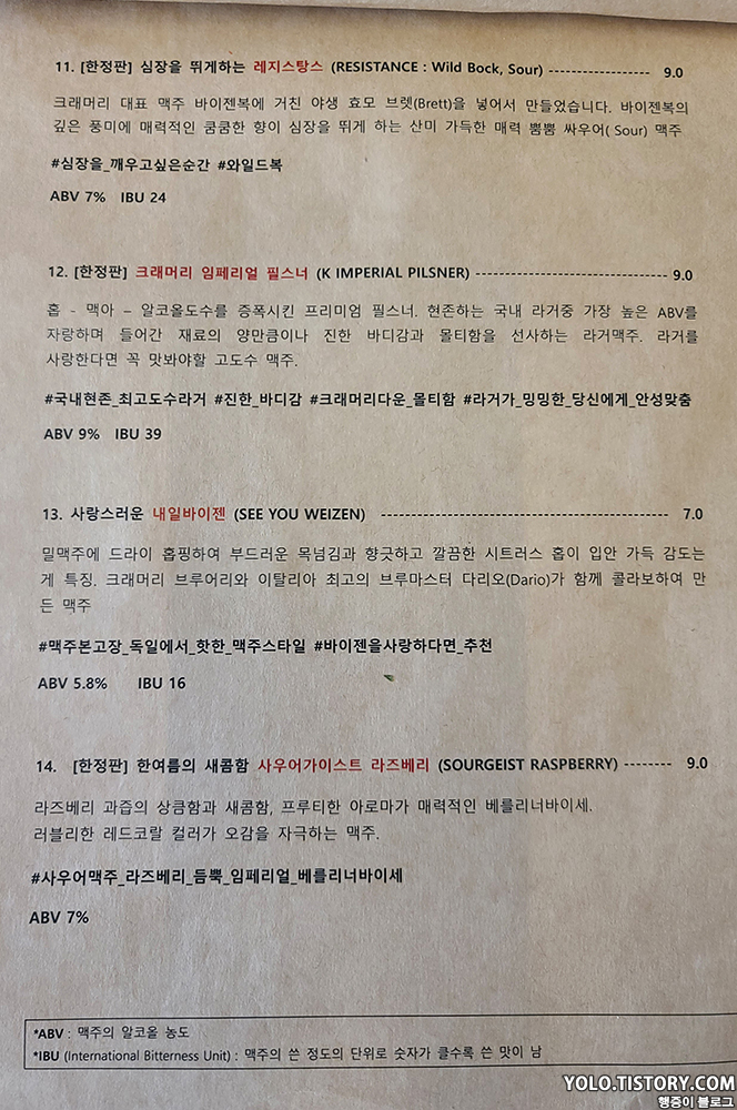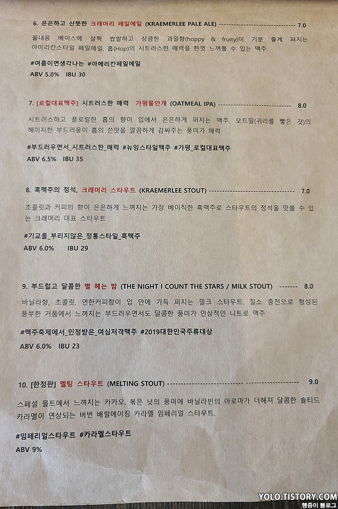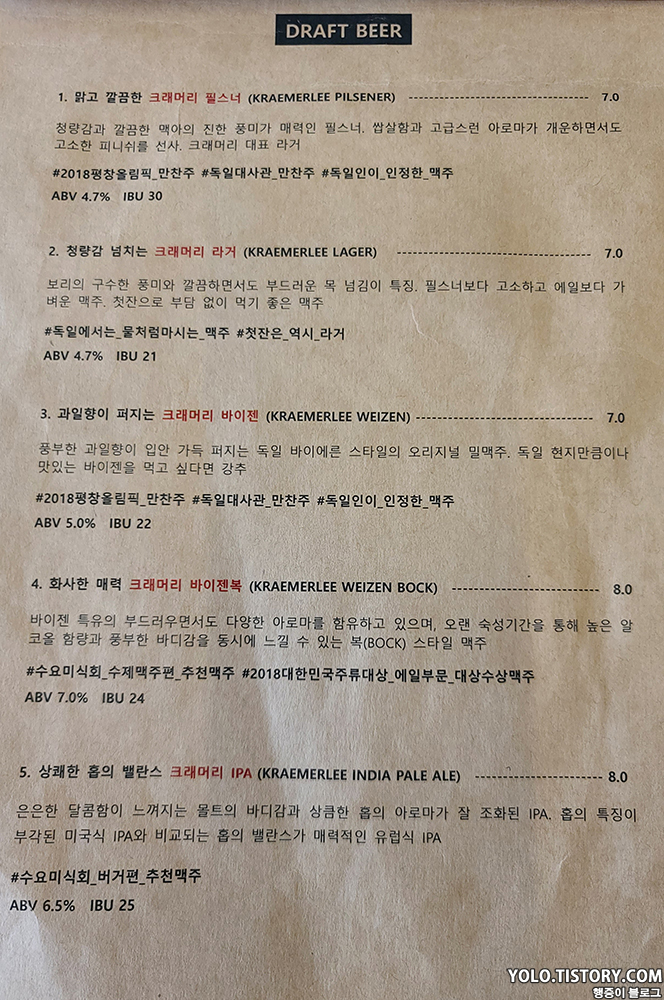 맛은 보지 못했던 크래머리 필스너 (6,000원). 향은 과일향이 났던 것 같다.