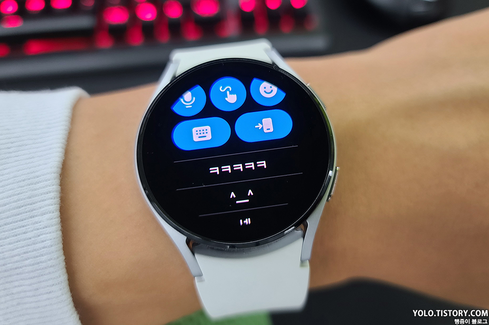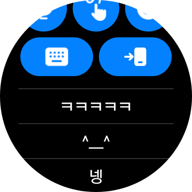 카카오톡이나 메시지가 왔을 때 새로 변경한 빠른답장 문구가 추가된 것을 볼 수 있다. 추천 문구를 켜 놓으면 상대방이 보낸 문자에 따라 적절한 문구를 보여준다. 워치를 사용하다가 자연스럽고 빠른 답장을 보내고 싶다면 빠른 답장 문구를 수정하여 보내는 것이 현명할 것 같다!