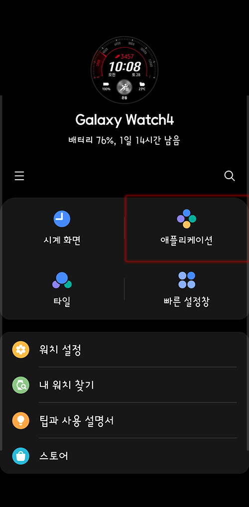 1. 갤럭시 웨어러블 앱의 갤럭시 워치 설정화면에서 <애플리케이션> 메뉴를 클릭한다.