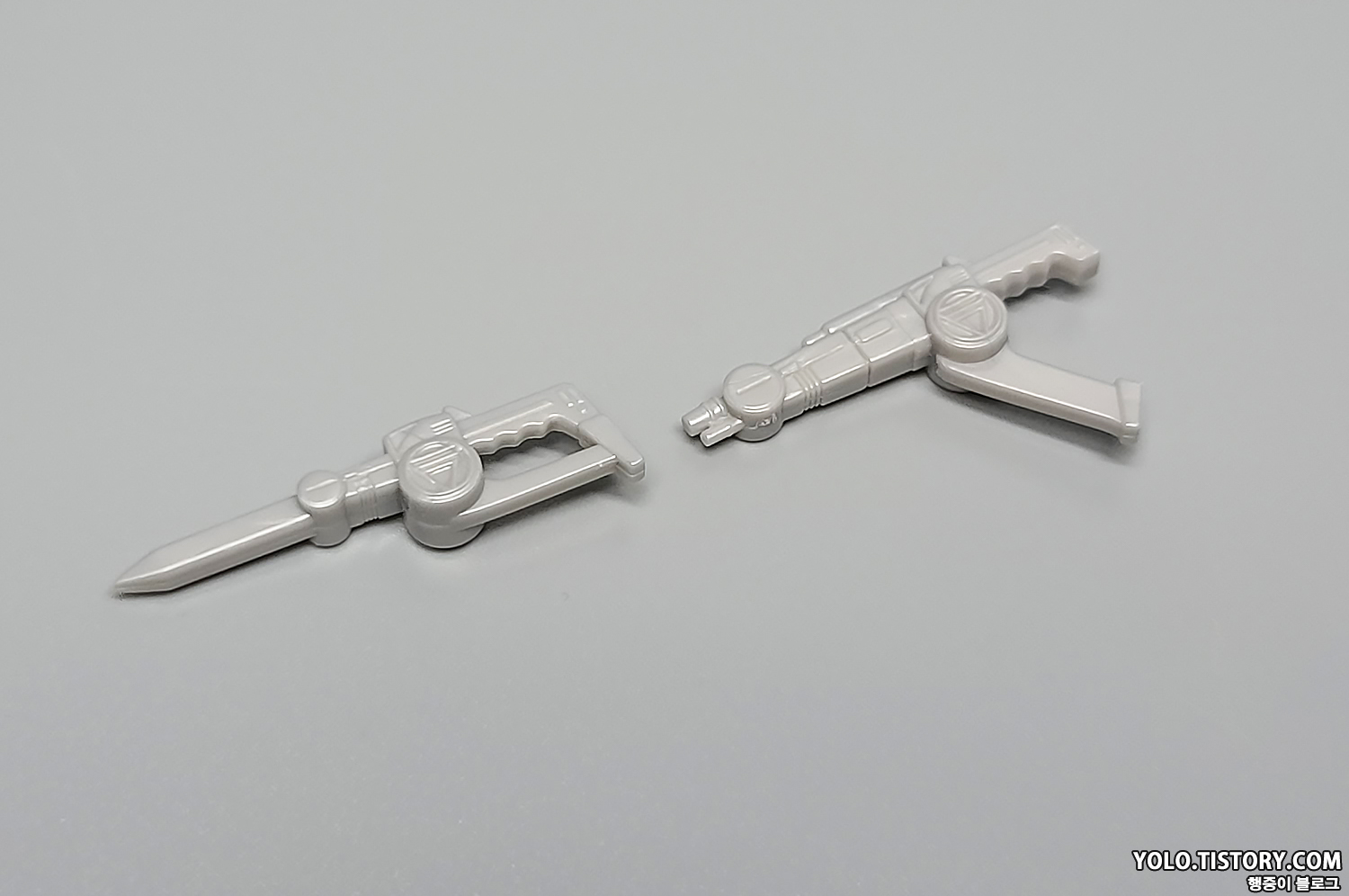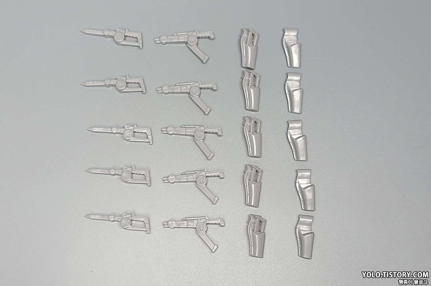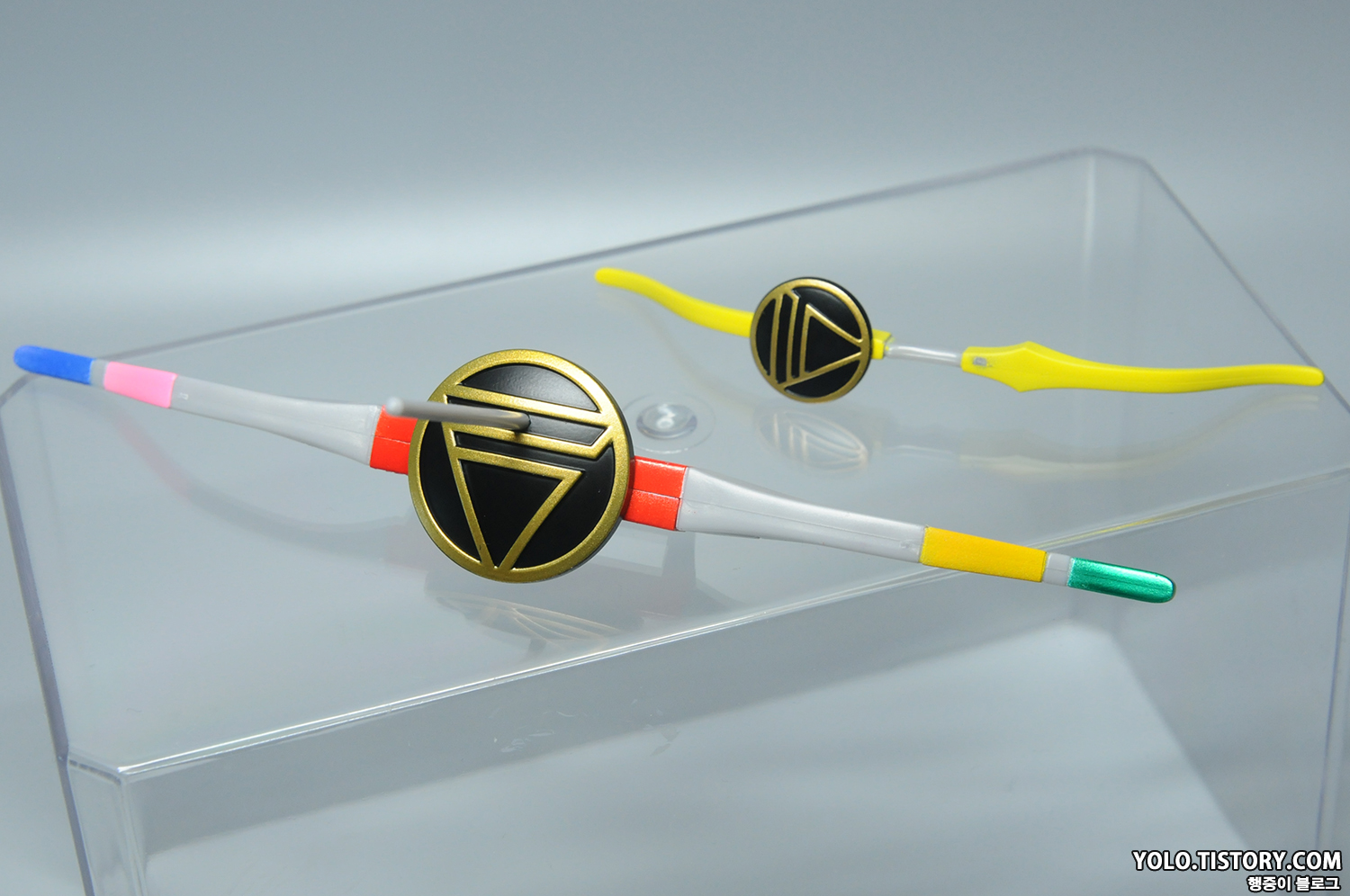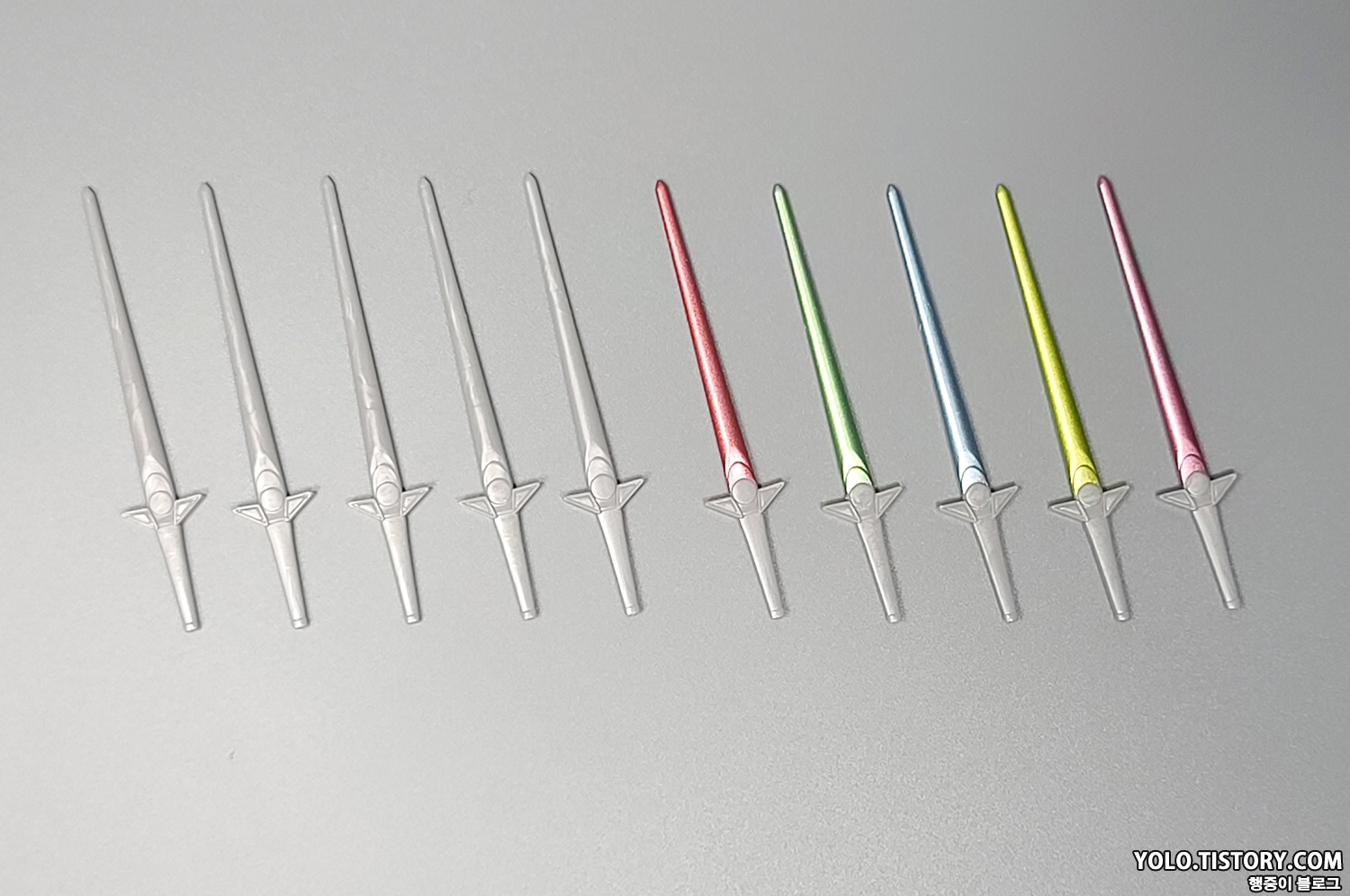 바이오 소드 장검 형태. 기본 형태와 빛나는 형태 각 1개씩 들어 있습니다. 메탈릭 도색이 약간 허술한데, 그린과 옐로우, 레드와 핑크 구분이 그냥 봐선 잘 모릅니다.