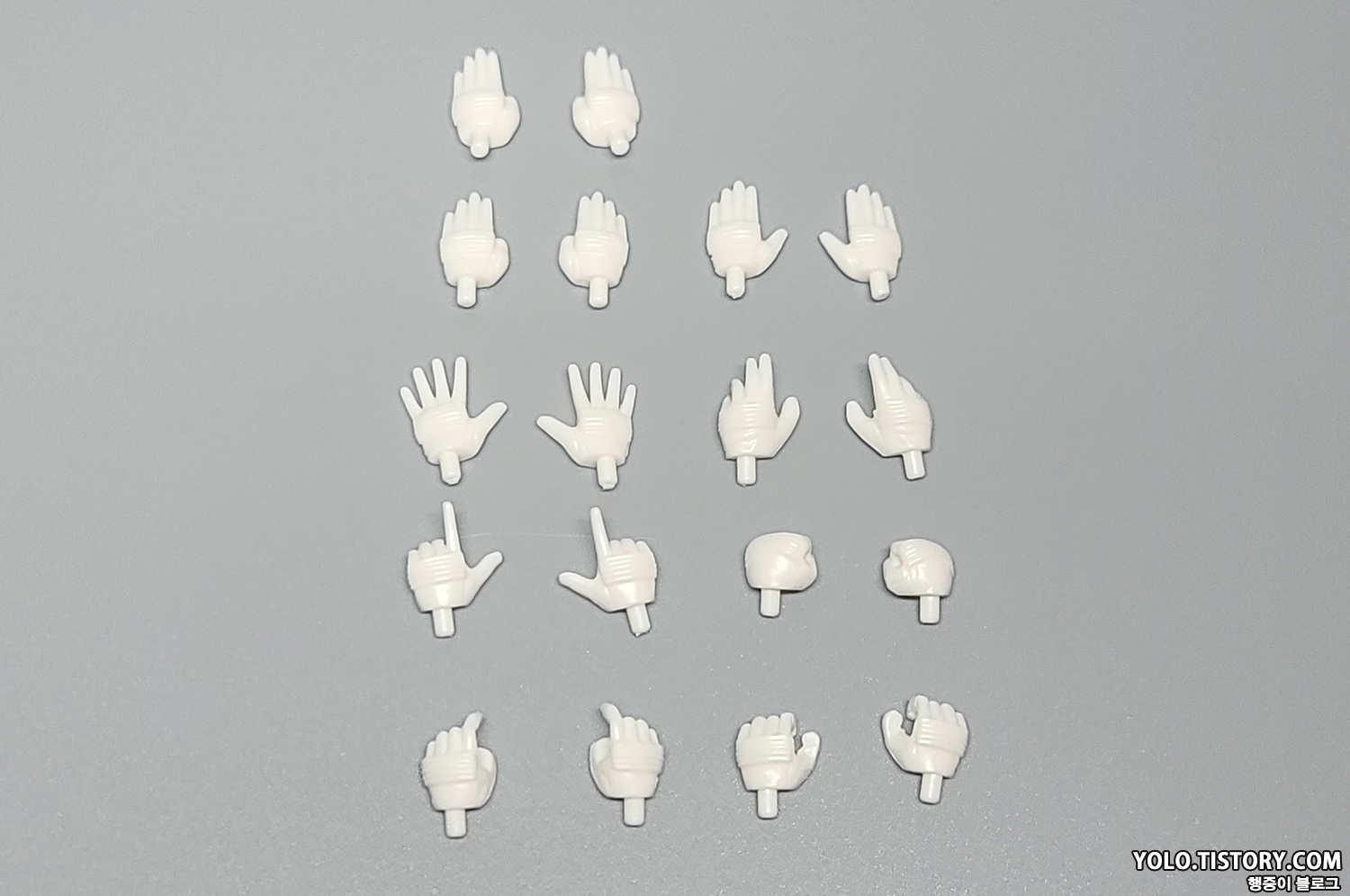 손은 총 캐릭터 당 9쌍, 18개가 들어 있습니다. 다섯 손가락을 딱 붙인 손이 2쌍이 들어 있어서 잘 못된 건가 했는데, 손목의 방향이 다릅니다. 5명이니 90개를 다 떼어줘야...