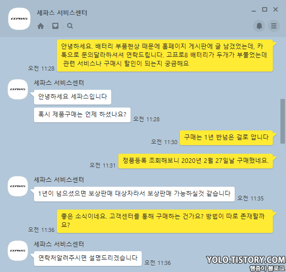 일단 세파스 홈페이지의 고객문의 메뉴에 글을 남겼는데, 카카오톡으로 다시 상담을 부탁해서 다시 카카오톡 고객센터를 통해 문의했다.