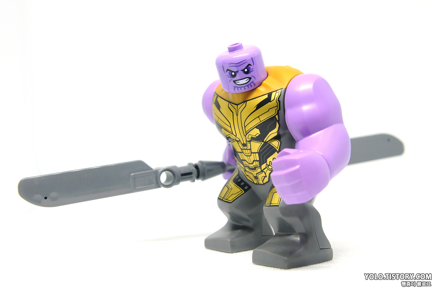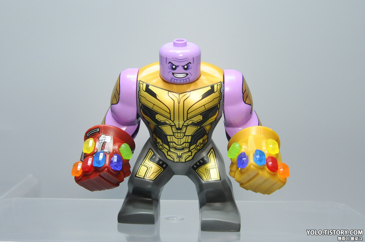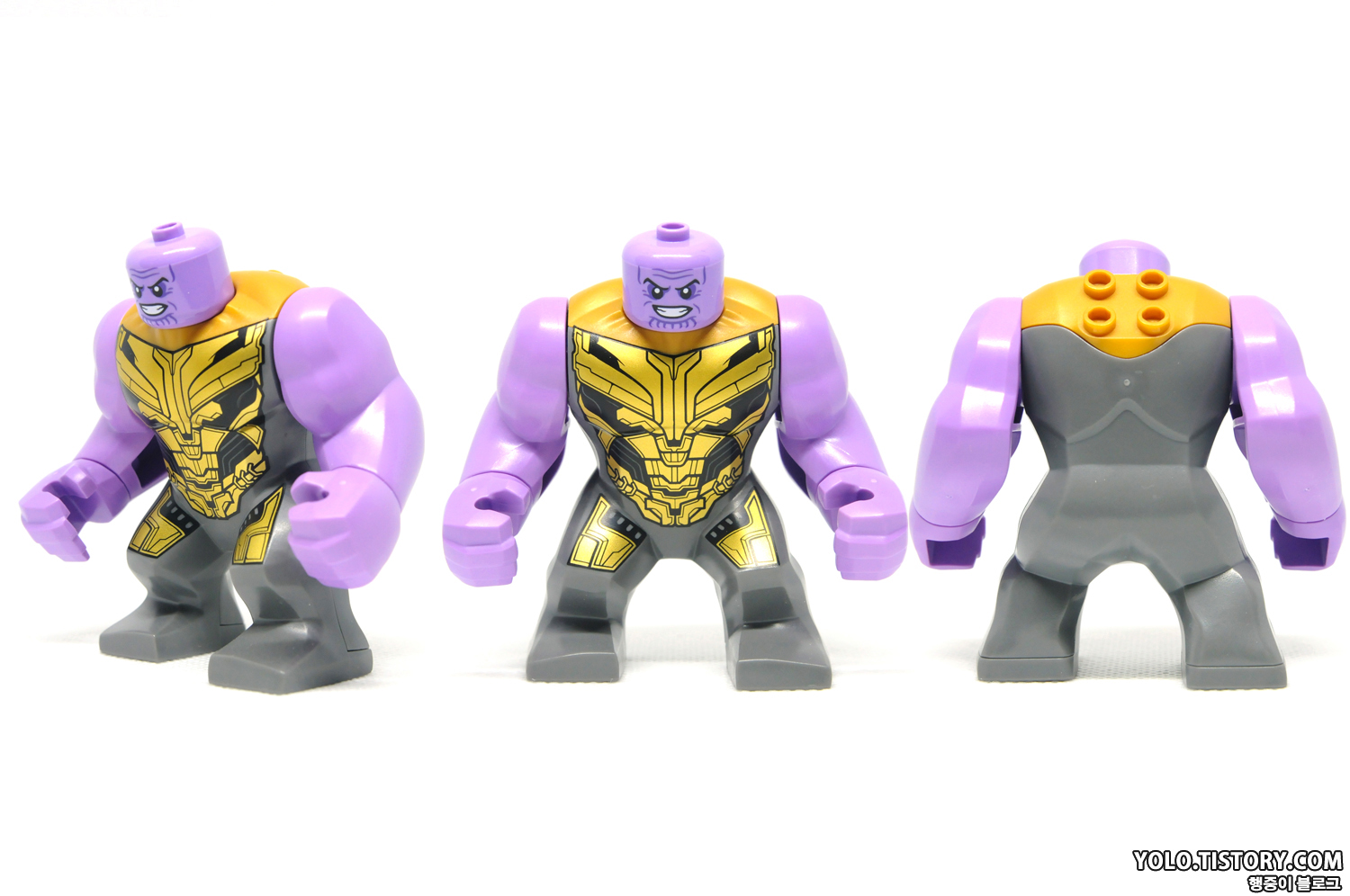 레고 타노스 피규어. 드디어 헬멧을 벗은 타노스가 정식으로 등장했습니다. 오래도 걸렸네요. 몸통의 상부 조형이 바뀌어서 기존 미니피규어 처럼 헤드 부품을 꽂는 형태로 바뀌었습니다. 따라서 큰 피규어이지만 머리가 돌아갑니다. 프린팅 도 극 중의 갑옷을 잘 표현해줬습니다.