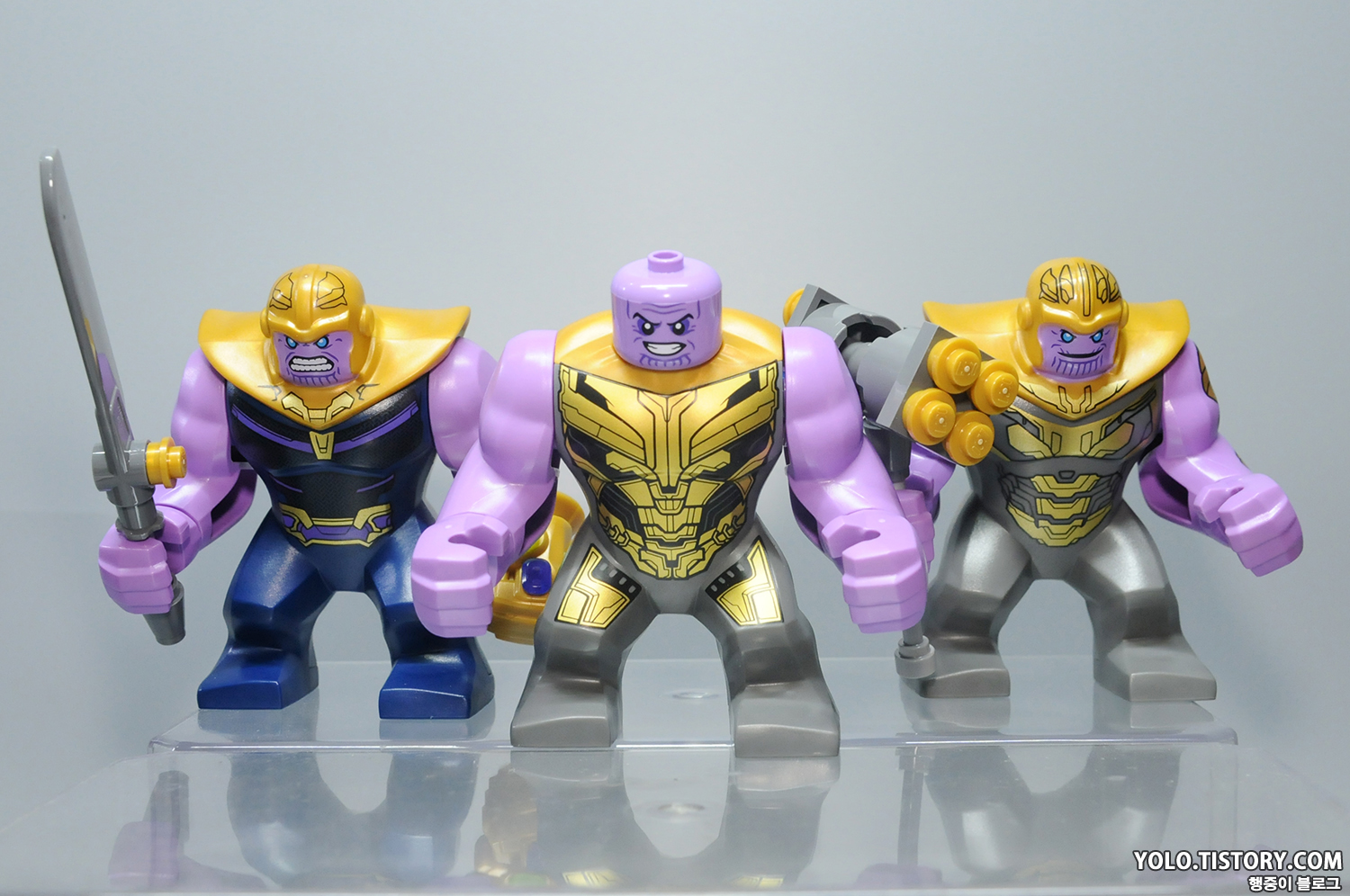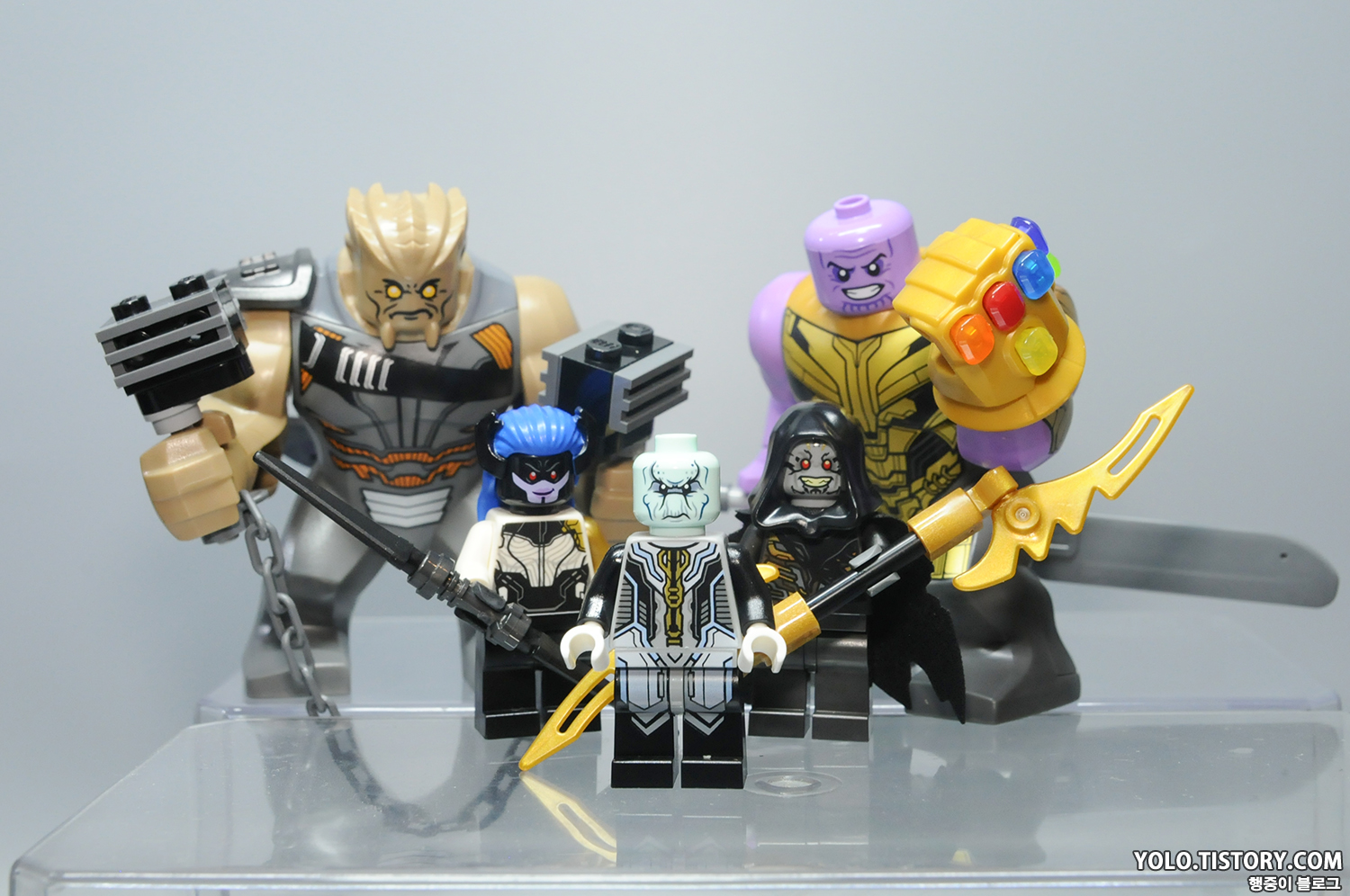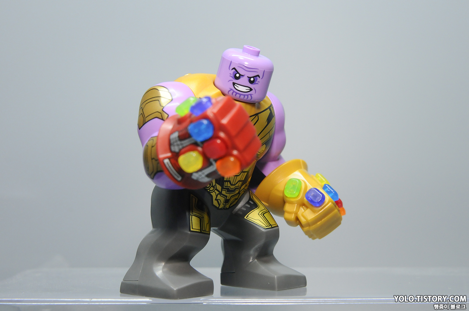 레고 타노스 피규어. 드디어 헬멧을 벗은 타노스가 정식으로 등장했습니다. 오래도 걸렸네요. 몸통의 상부 조형이 바뀌어서 기존 미니피규어 처럼 헤드 부품을 꽂는 형태로 바뀌었습니다. 따라서 큰 피규어이지만 머리가 돌아갑니다. 프린팅 도 극 중의 갑옷을 잘 표현해줬습니다.