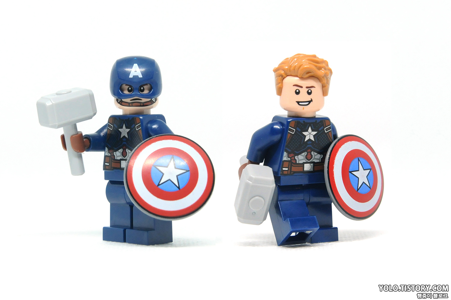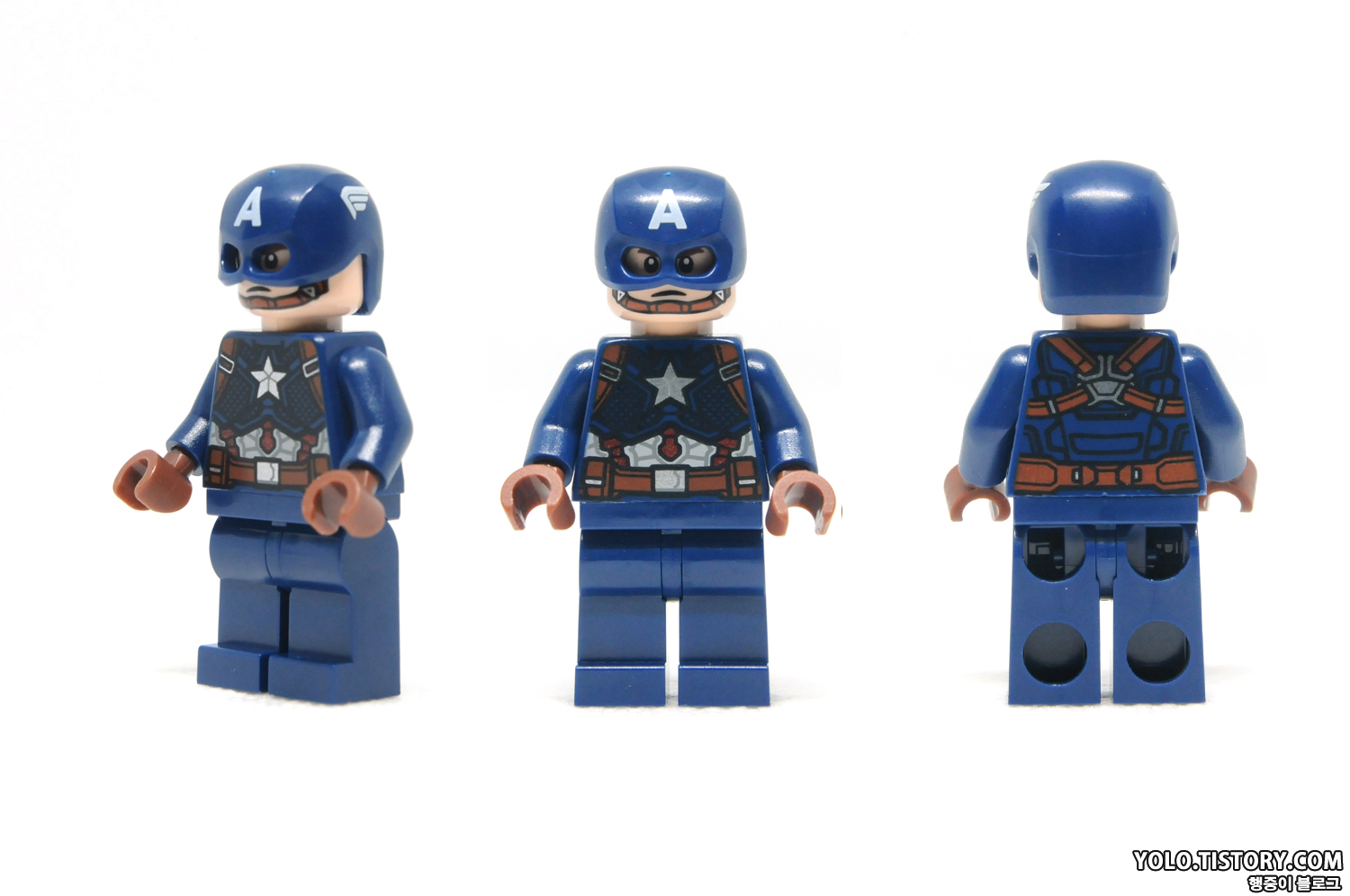 레고 캡틴아메리카 미니피규어. 캡틴 아메리카의 극 중 코스튬이 잘 표현되었습니다. 다만 가슴의 비닐 무늬가 생각보다 실제로 보면 잘 보이지 않는 단점이 있습니다. 방패의 모습이 언제부터 인가 굉장히 퀄리티 낮게 변한 게 아쉽네요. 투페이스로 헬멧을 쓴 모습과 벗은 모습을 표현할 수 있습니다. 마지막 캡틴인데, 팔과 다리에 프린팅을 좀 넣어줬으면 어땠을까 싶네요.