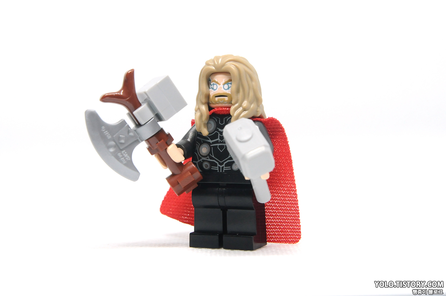 레고 토르 미니피규어. 타노스에게 패한 상실감으로 살이 쪄버린 토르. 투페이스로 얼굴을 뒤집으면 천둥을 부르는 눈을 표현할 수 있습니다. 묠니르와 스톰 브레이커가 들어 있습니다.