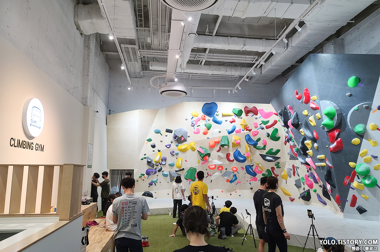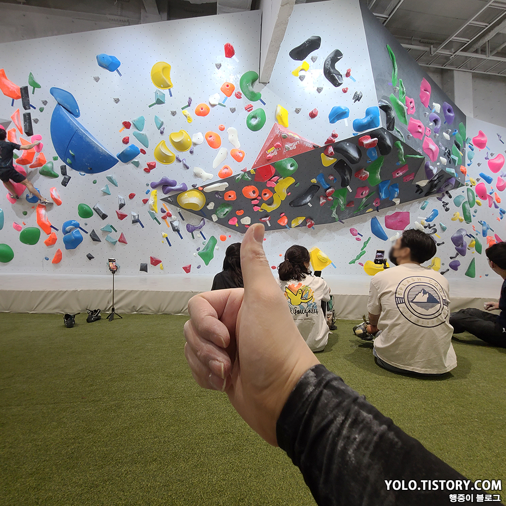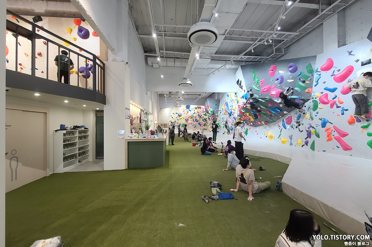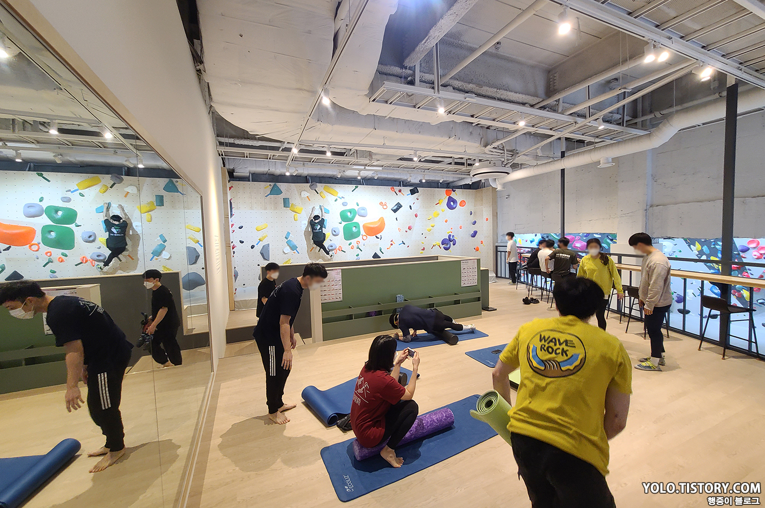 오른쪽은 강습 벽이고, 왼쪽은 스트레칭 및 휴식을 취할 수 있는 공간이 마련되어 있었다. 대부분의 암장이 층별로 구분이 되어있지 않기 때문에 스트레칭 공간이 없거나 협소한데, 별도의 독립된 공간의 느낌이라 좋았다.