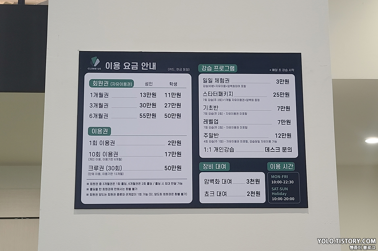 일일 이용 요금은 2만원이고 회원권 가격은 다른 암장들과 비슷한 가격을 형성하고 있었다.