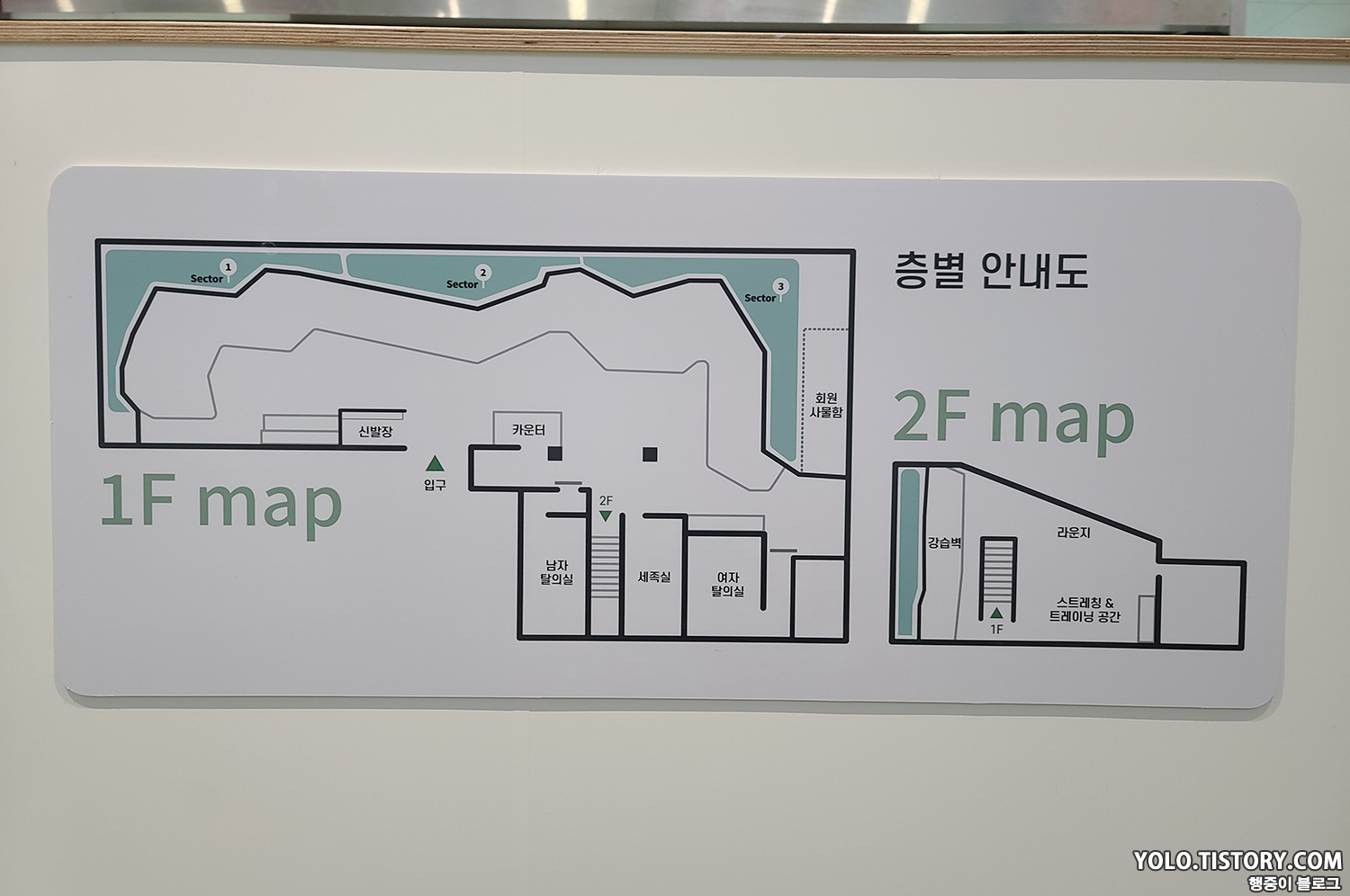 모란역 클라임 어스는 이전에 다녔던 암장과 다르게 2층도 존재했다. 1층은 볼더링 위주이고 2층은 스트레칭과 강습 벽 및 휴식을 취할 수 있는 공간이다. 섹터는 3개로 구분지어져있다.