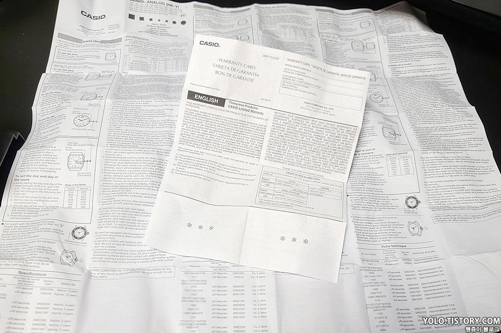 시계를 거치할 수 있는 싸구려 플라스틱이 동봉된다, 그래도 거치할 수 있다는 점에 높은 점수를 주고 싶다. 설명서는 역시나 한국어는 없고 워런티 카드라기 뭐한 종이 쪼가리도 있다.