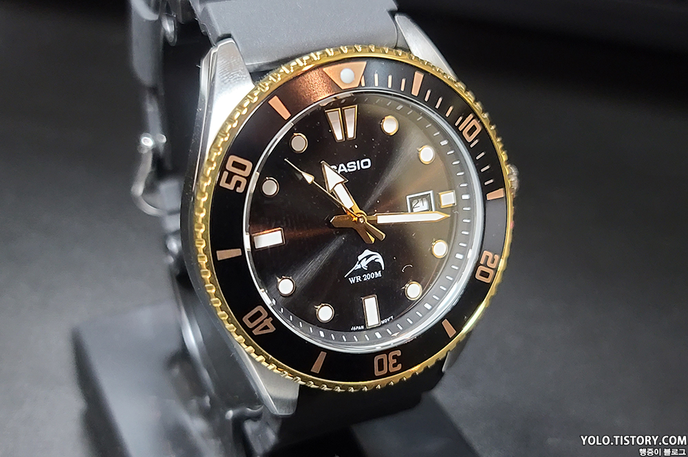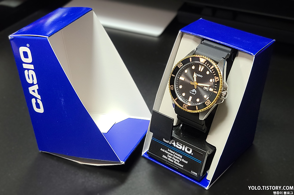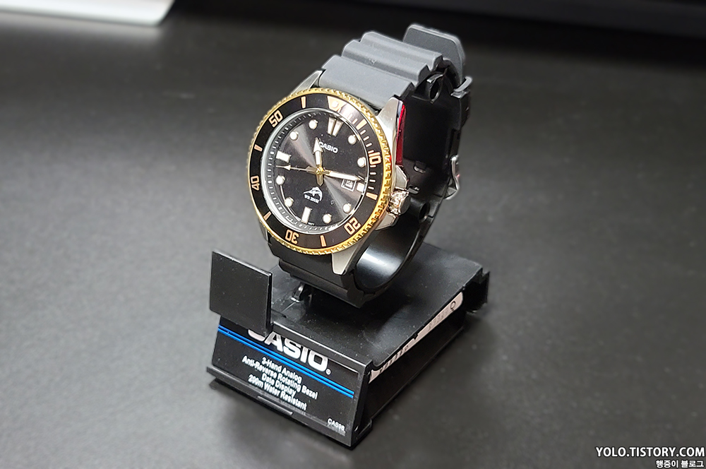 작년 여름 휴가때 갤럭시 워치를 차고 바다에 나갔다가 사망하는 사건이 있었기에 바다에서 사용하기 위한 다이빙 시계가 필요해졌다. 마침 프리다이빙을 배우고 있기도 하고... 여러 모델을 찾아 보았는데 대부분 방수등급이 100M (10 bar) 라서 다이빙엔 적합하지 않았다. 그러다 카시오의 청새치 시리즈 MDV106G 모델을 발견했다. 꽤나 유명한 녀석이라 색깔별로 많은 모델이 출시 되었고 기본 청새치, 흑새치 등등으로 불리고 있었다. 나는 그 중 금색 모델인 금새치를 구입! 국내 리테일 샵에선 10만원 정도에 판매되지만 11번가 아마존을 통해 구매해서 6만원 초반대에 구매했다.