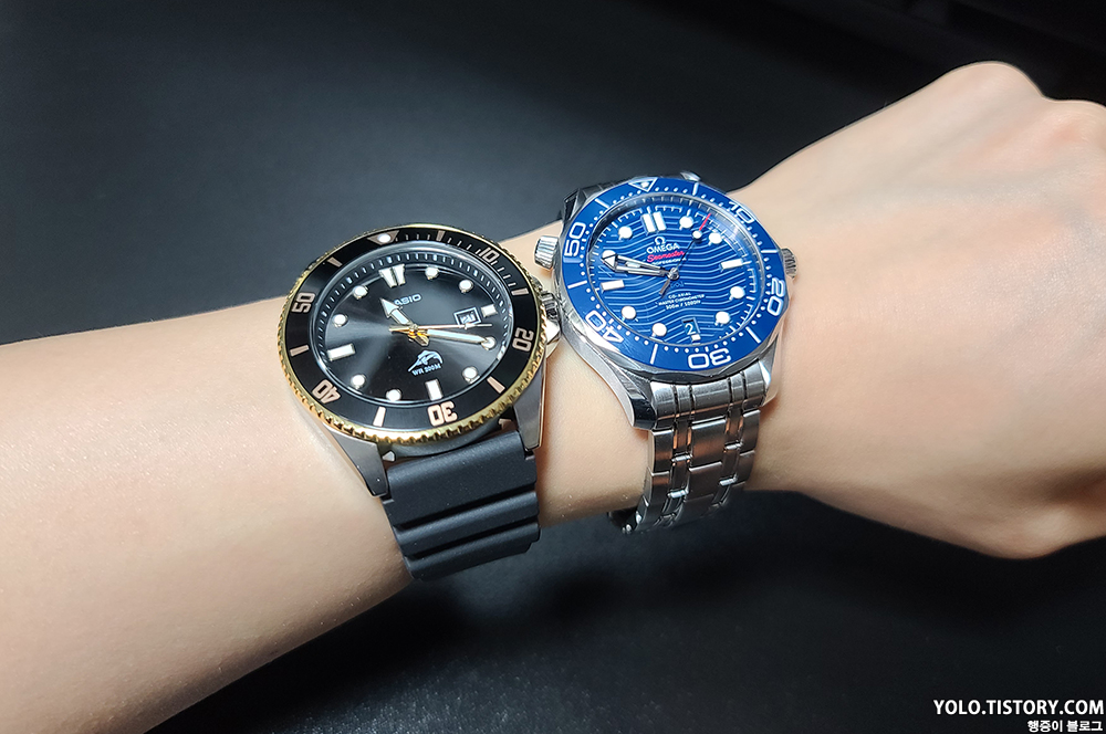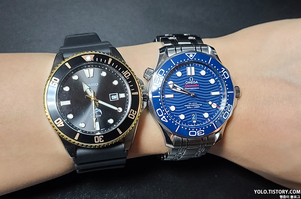 약 100배 비싼 씨마스터와 비교... 씨마는 일상 생활에선 잘 차고 다니는데 바다에선 도저히 못차겠다. 돈 좀 더 벌면 가능할런지...ㅋㅋ