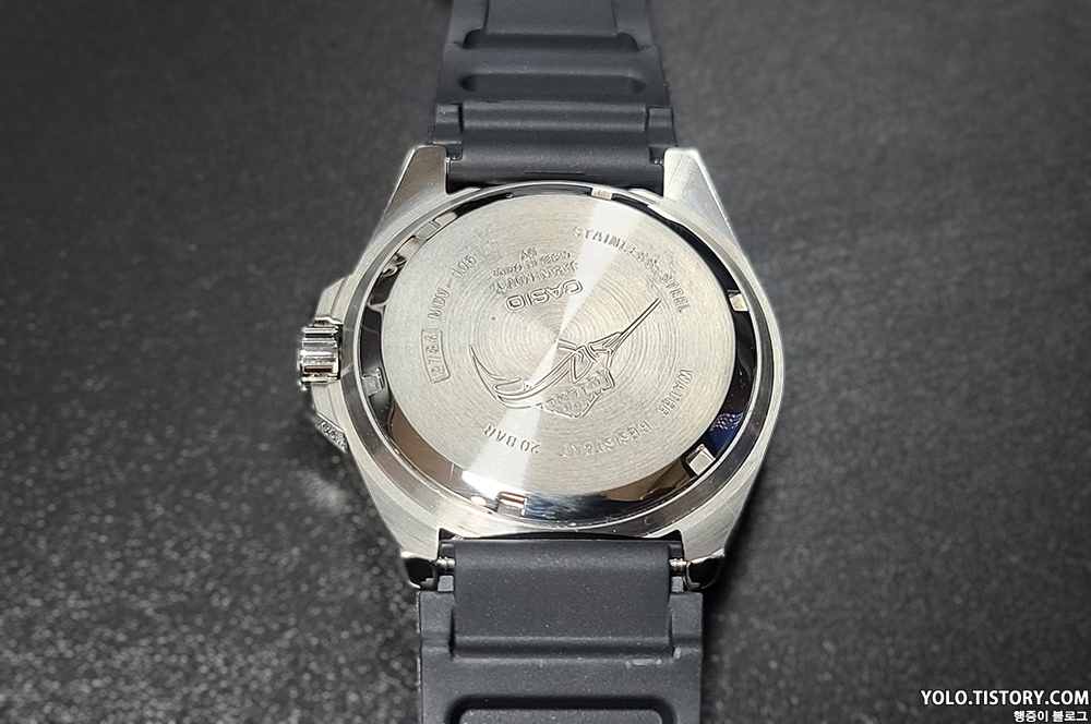 뒷면의 청새치는 올바른 방향을 보고 있지 않다. 10만원도 안되는 시계라지만 조금 아쉬운 부분