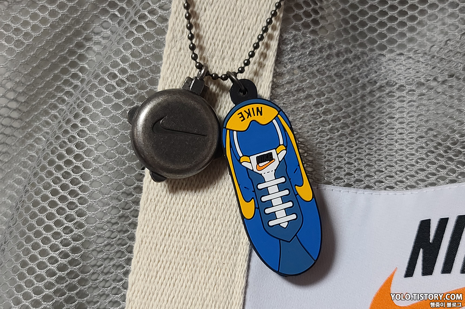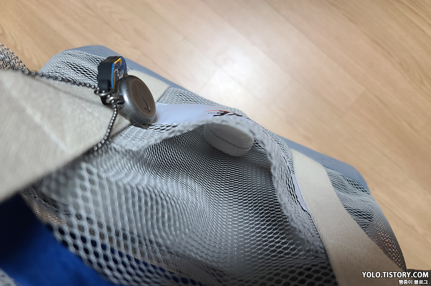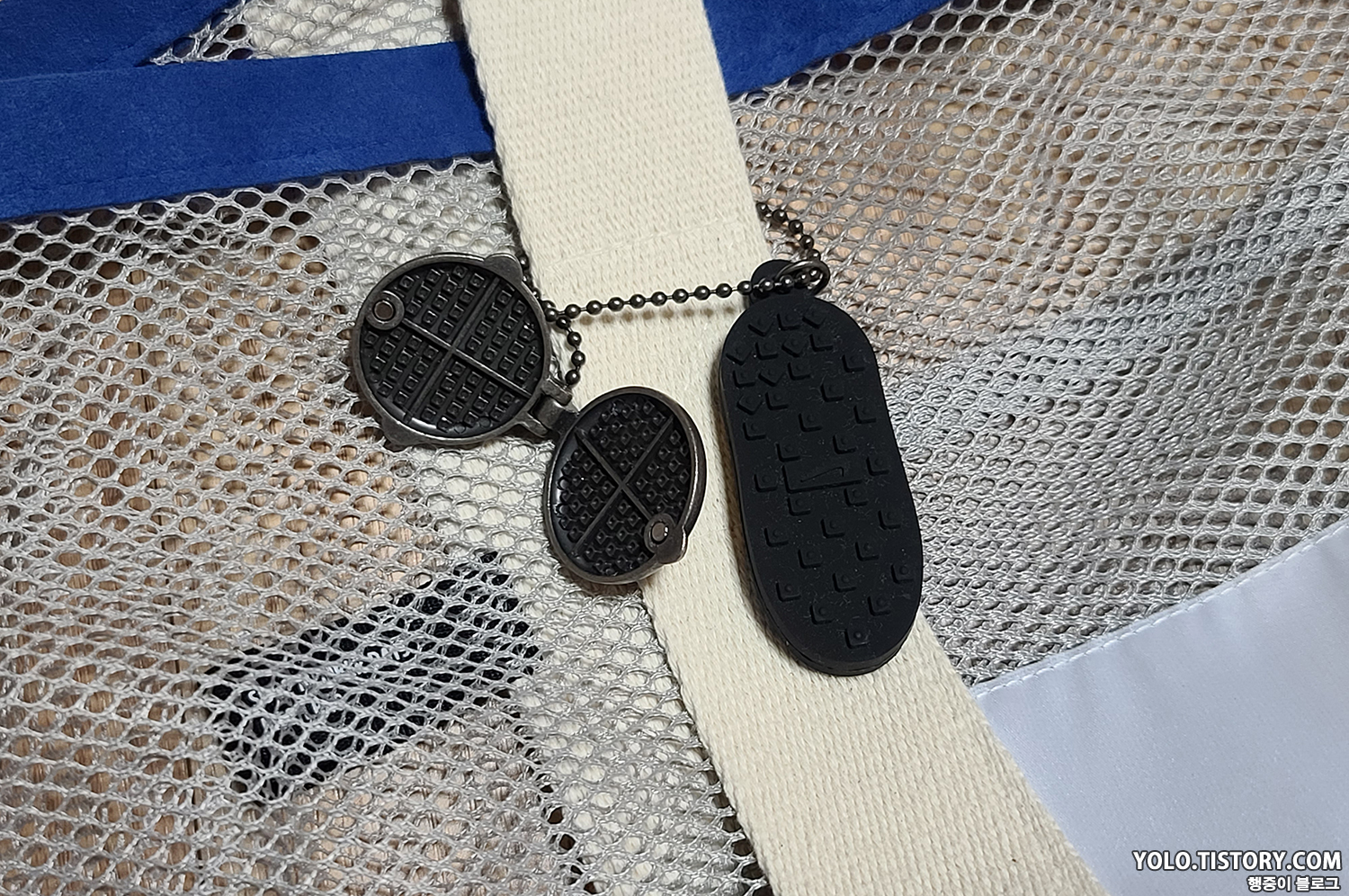 와플팬 키링은 배틀그라운드의 프라이팬을 연상시킨다. 단점이라면 키링이 마구 움직이는데 메쉬백 구멍 사이로 고리를 통과하여 해결했다.