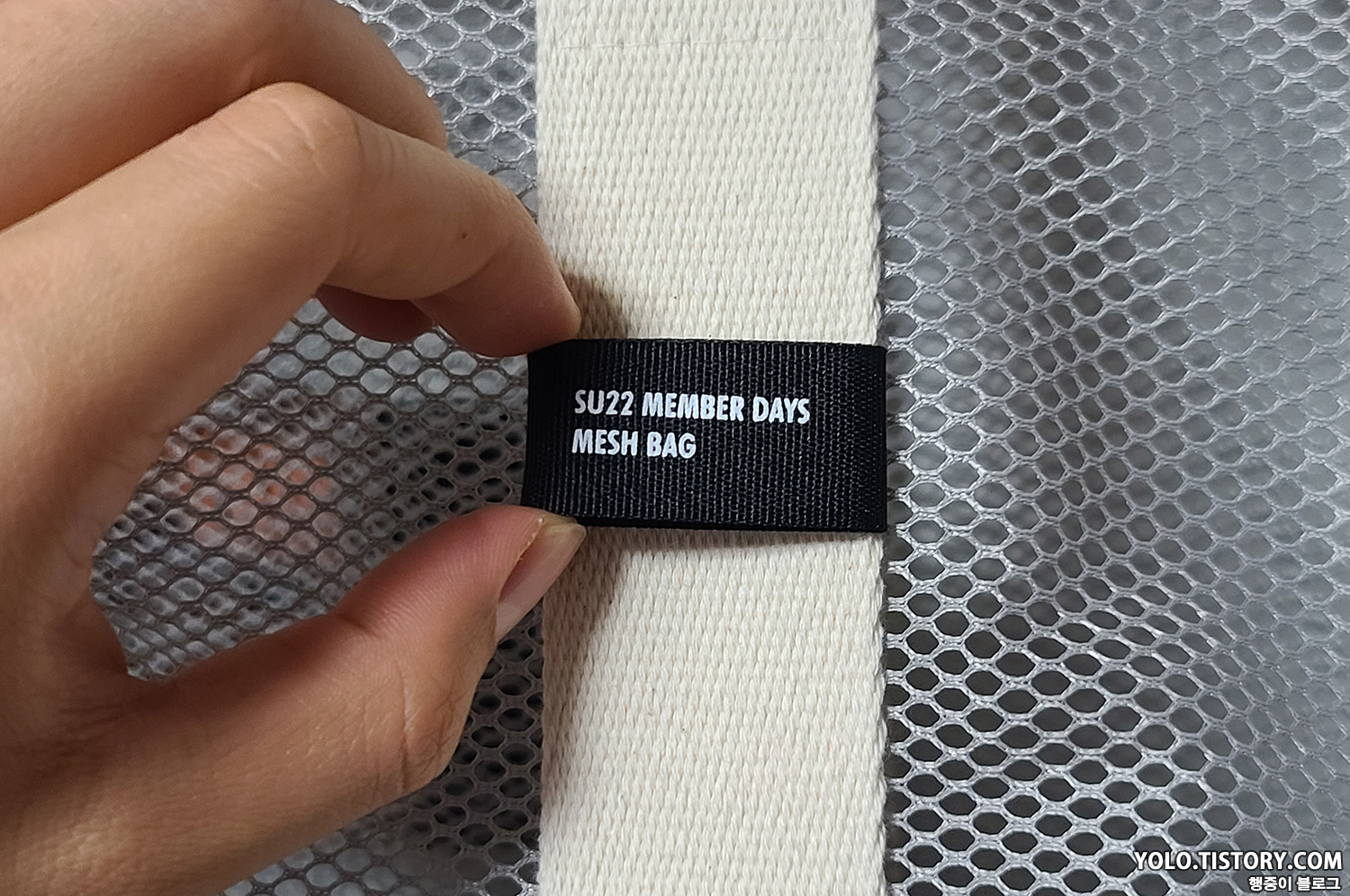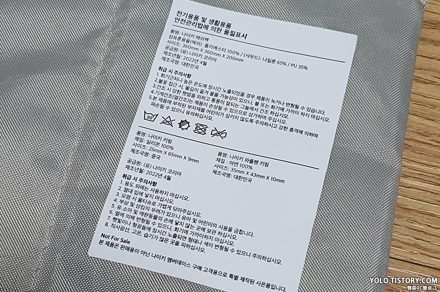 전면 로고에는 실측과 제품 이름, 재질, 생산국 등이 표시되어 있다. 한국에서 제조된 메이드 인 코리아 제품이다.