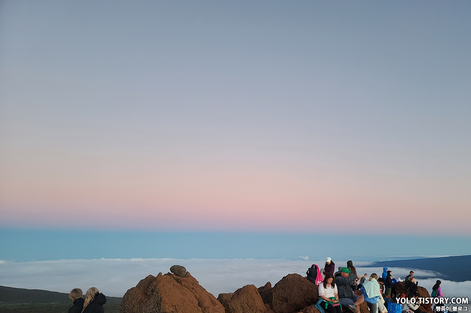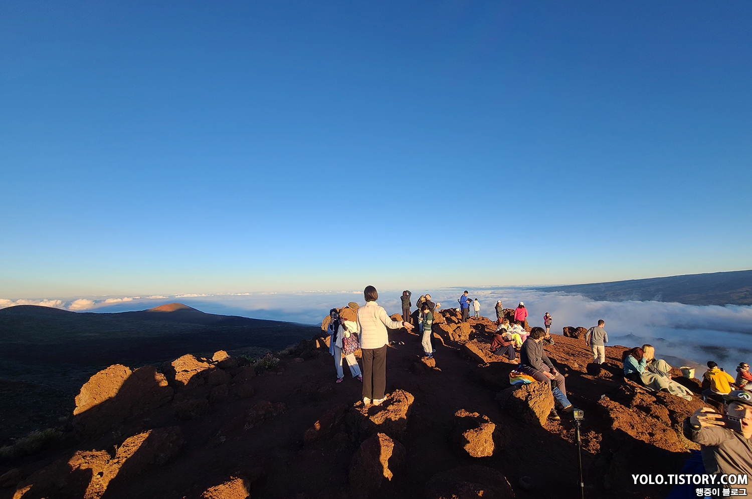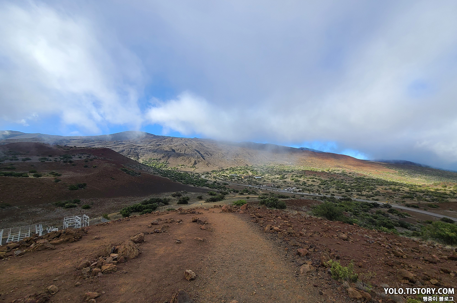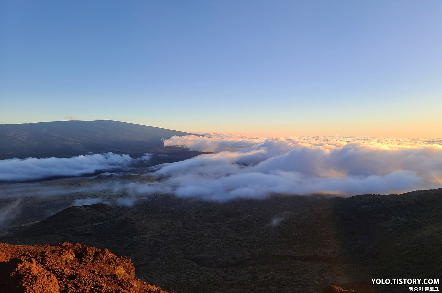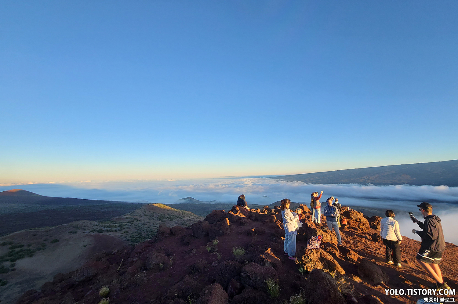 마우나케아 천문대는 4륜 구동 지프차만 올라갈 수 있고 조건이 까다롭다. 그래서 마우나케아 천문대 투어를 이용하는 것 같던데, 천문대 투어도 결국 해가 지면 바로 방문자 센터로 내려와야 하고 인당 20만 원이 넘는 가격에 판매되고 있어 매리트가 없는 것 같다. 방문자 센터는 4륜 구동이 아니어도 방문이 가능하다. 약 오후 5시에 마우나케아 방문자 센터에 도착하여 주차 후 선셋 힐로 올라갔다. 이른 시간이라 그런지 사람이 많지는 않았다. 약 10분 정도 걸어서 선셋 힐 정상에 도착. 구름이 굉장히 많아서 노을을 보지 못할까 봐 걱정이 많았다. 아까 사놓은 포케를 먹고 가방을 열어 보았는데, 숙소에서 라면을 먹으려고 챙겨 온 뜨거운 물이 텀블러에서 샜다....