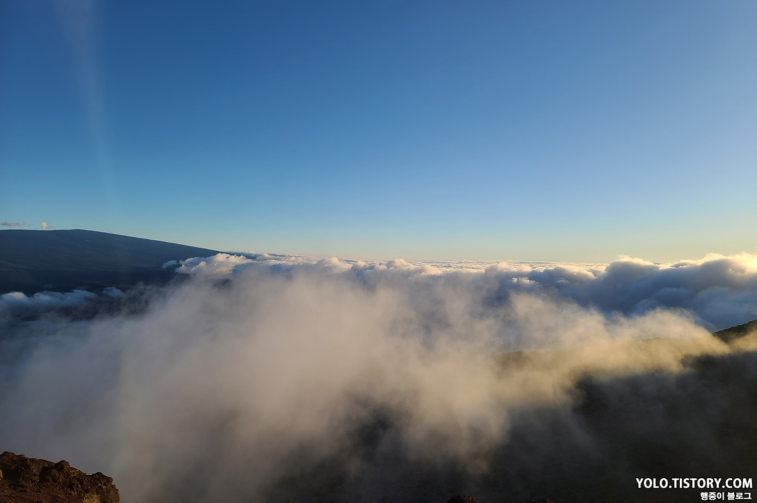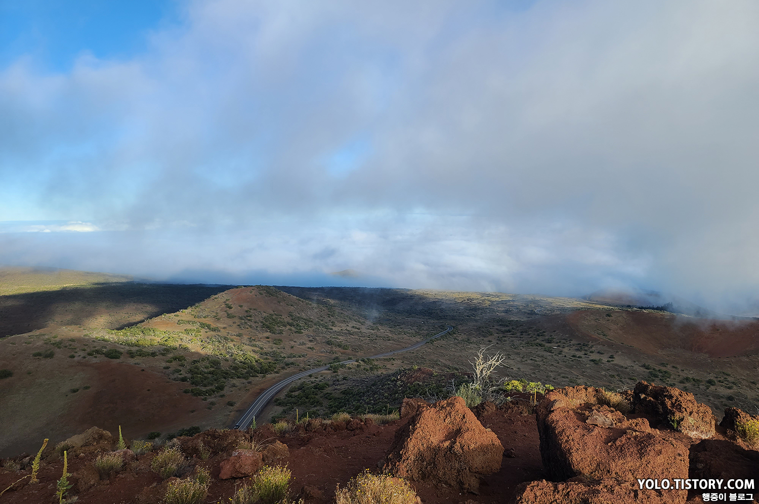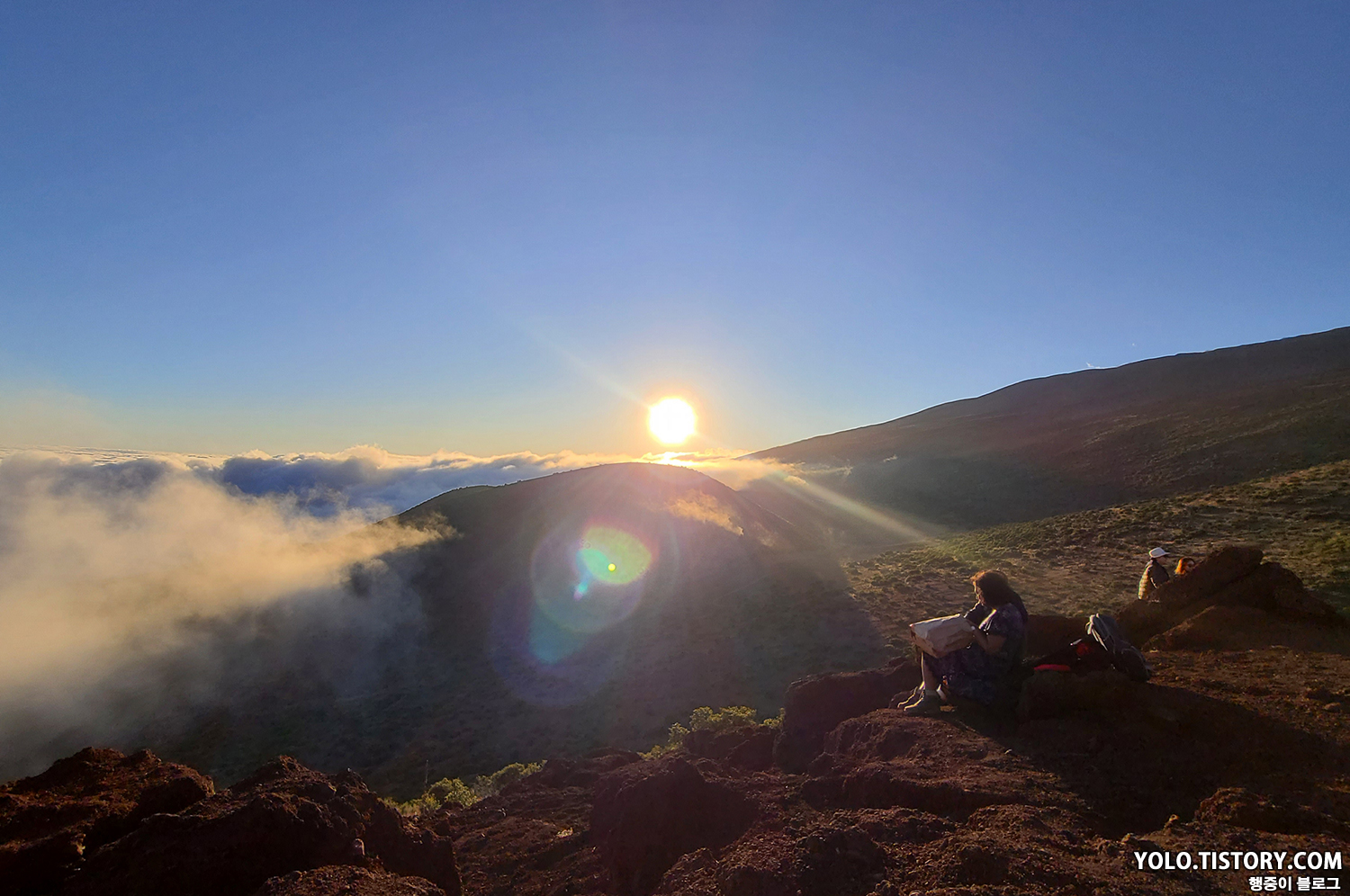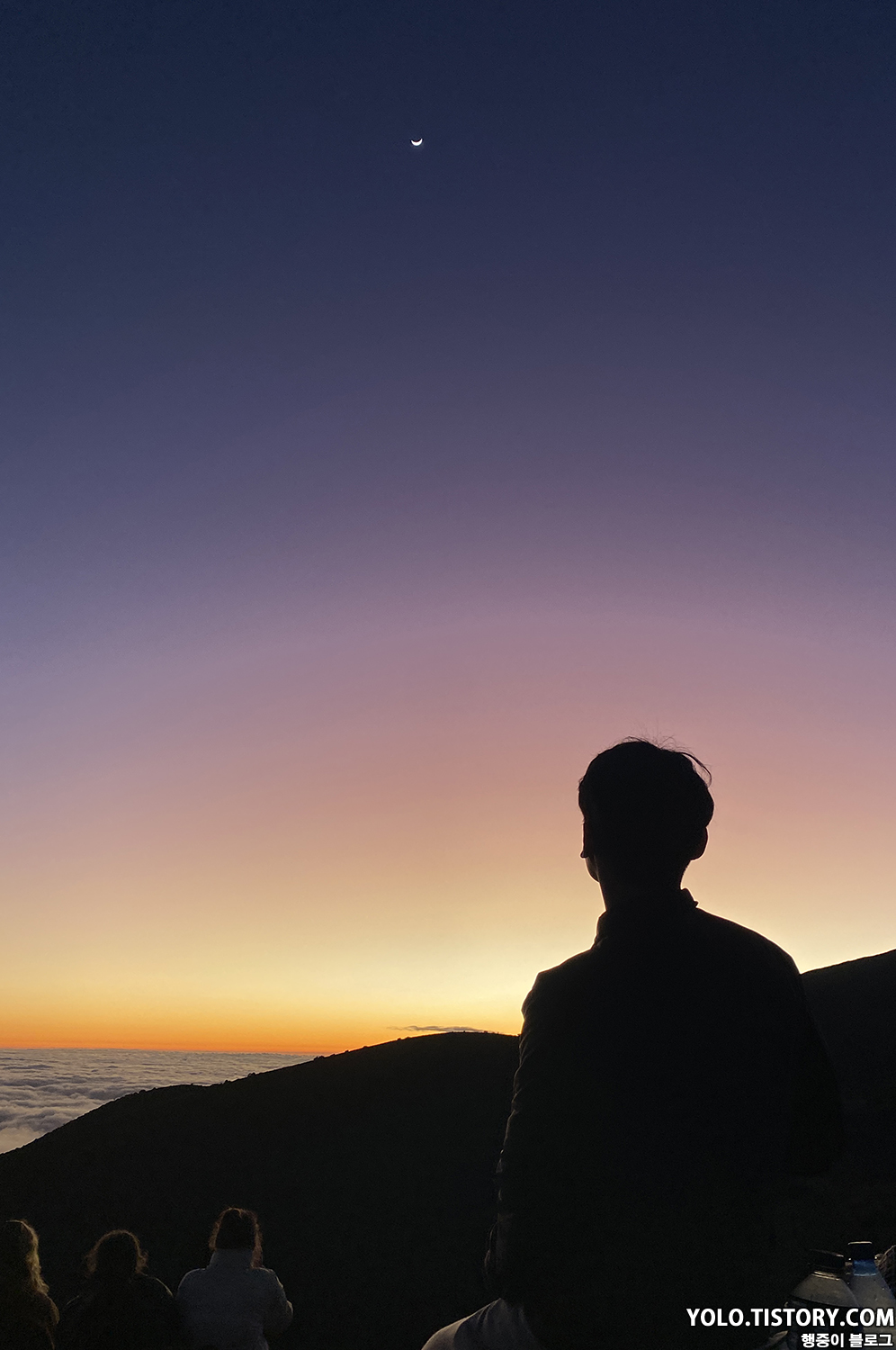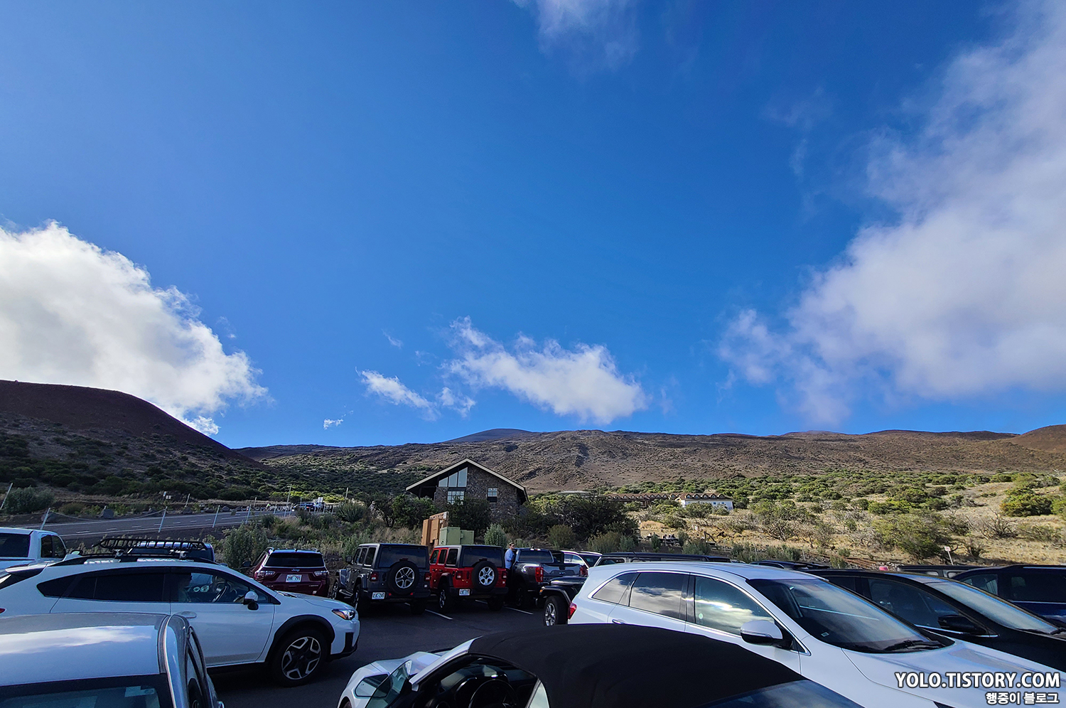 마우나케아 천문대는 4륜 구동 지프차만 올라갈 수 있고 조건이 까다롭다. 그래서 마우나케아 천문대 투어를 이용하는 것 같던데, 천문대 투어도 결국 해가 지면 바로 방문자 센터로 내려와야 하고 인당 20만 원이 넘는 가격에 판매되고 있어 매리트가 없는 것 같다. 방문자 센터는 4륜 구동이 아니어도 방문이 가능하다. 약 오후 5시에 마우나케아 방문자 센터에 도착하여 주차 후 선셋 힐로 올라갔다. 이른 시간이라 그런지 사람이 많지는 않았다. 약 10분 정도 걸어서 선셋 힐 정상에 도착. 구름이 굉장히 많아서 노을을 보지 못할까 봐 걱정이 많았다. 아까 사놓은 포케를 먹고 가방을 열어 보았는데, 숙소에서 라면을 먹으려고 챙겨 온 뜨거운 물이 텀블러에서 샜다....