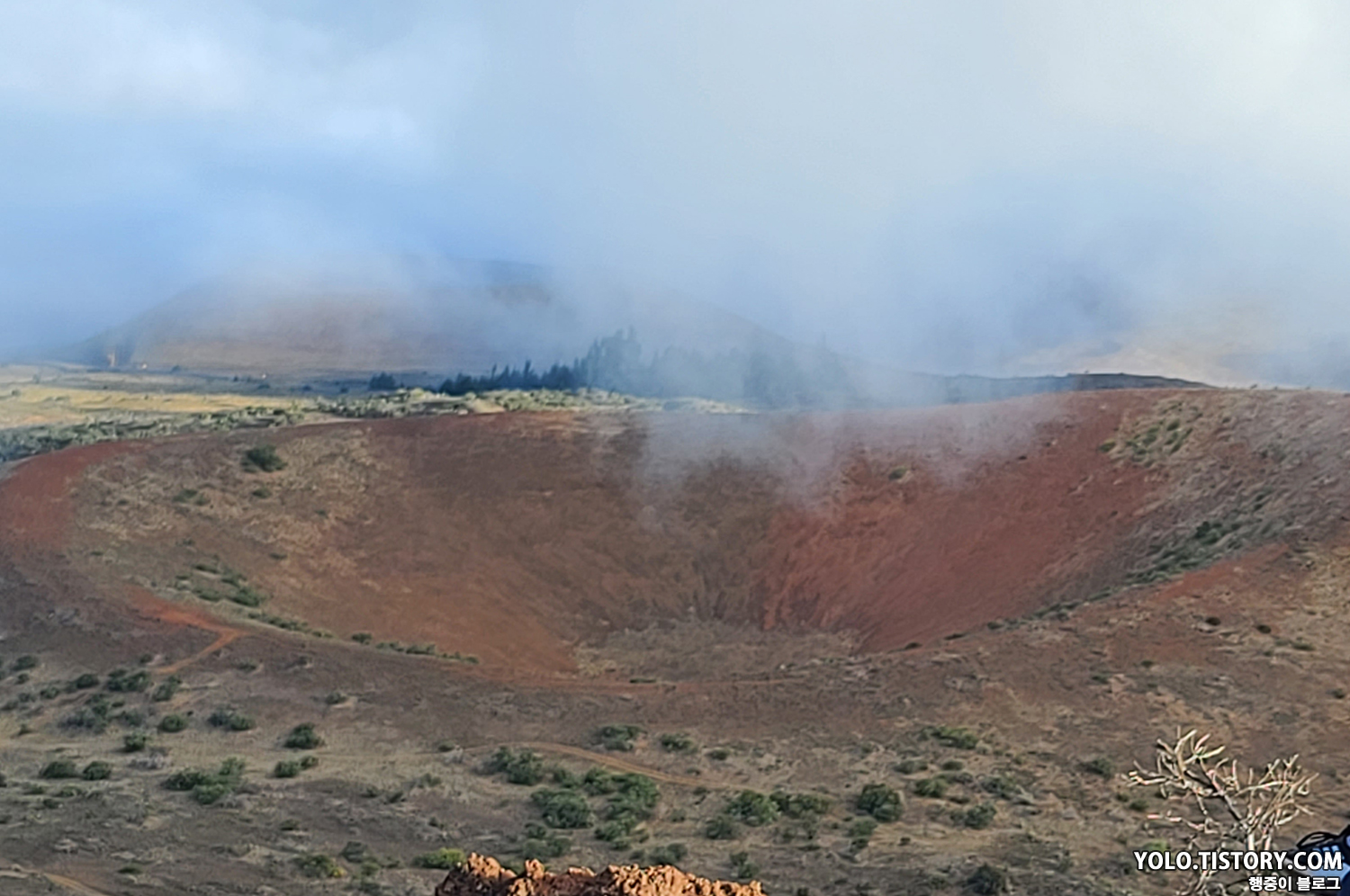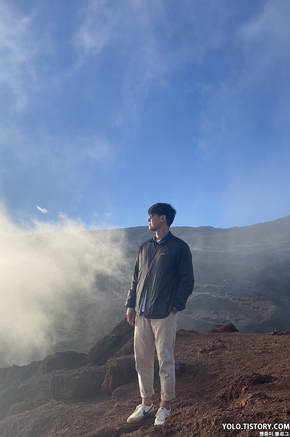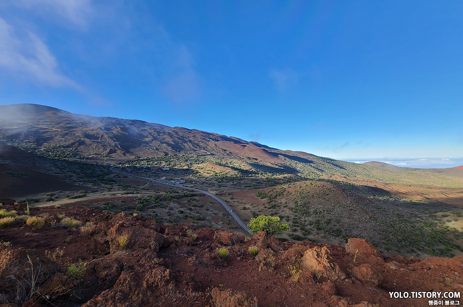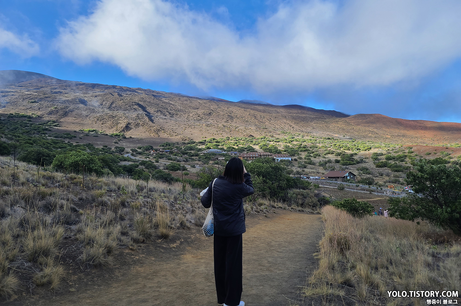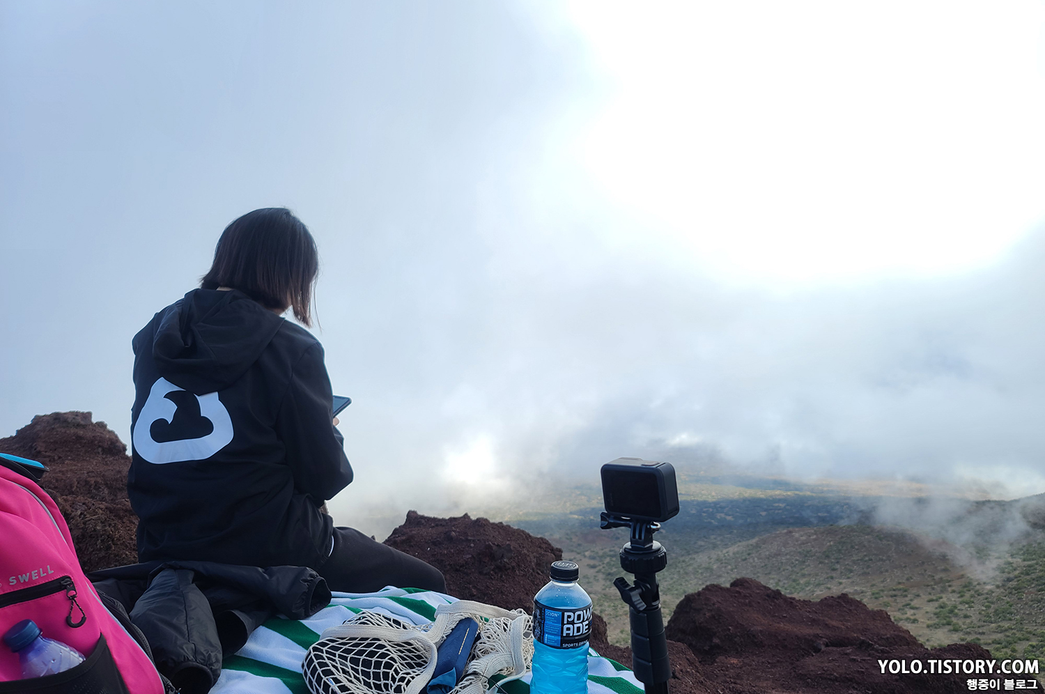 마우나케아 천문대는 4륜 구동 지프차만 올라갈 수 있고 조건이 까다롭다. 그래서 마우나케아 천문대 투어를 이용하는 것 같던데, 천문대 투어도 결국 해가 지면 바로 방문자 센터로 내려와야 하고 인당 20만 원이 넘는 가격에 판매되고 있어 매리트가 없는 것 같다. 방문자 센터는 4륜 구동이 아니어도 방문이 가능하다. 약 오후 5시에 마우나케아 방문자 센터에 도착하여 주차 후 선셋 힐로 올라갔다. 이른 시간이라 그런지 사람이 많지는 않았다. 약 10분 정도 걸어서 선셋 힐 정상에 도착. 구름이 굉장히 많아서 노을을 보지 못할까 봐 걱정이 많았다. 아까 사놓은 포케를 먹고 가방을 열어 보았는데, 숙소에서 라면을 먹으려고 챙겨 온 뜨거운 물이 텀블러에서 샜다....