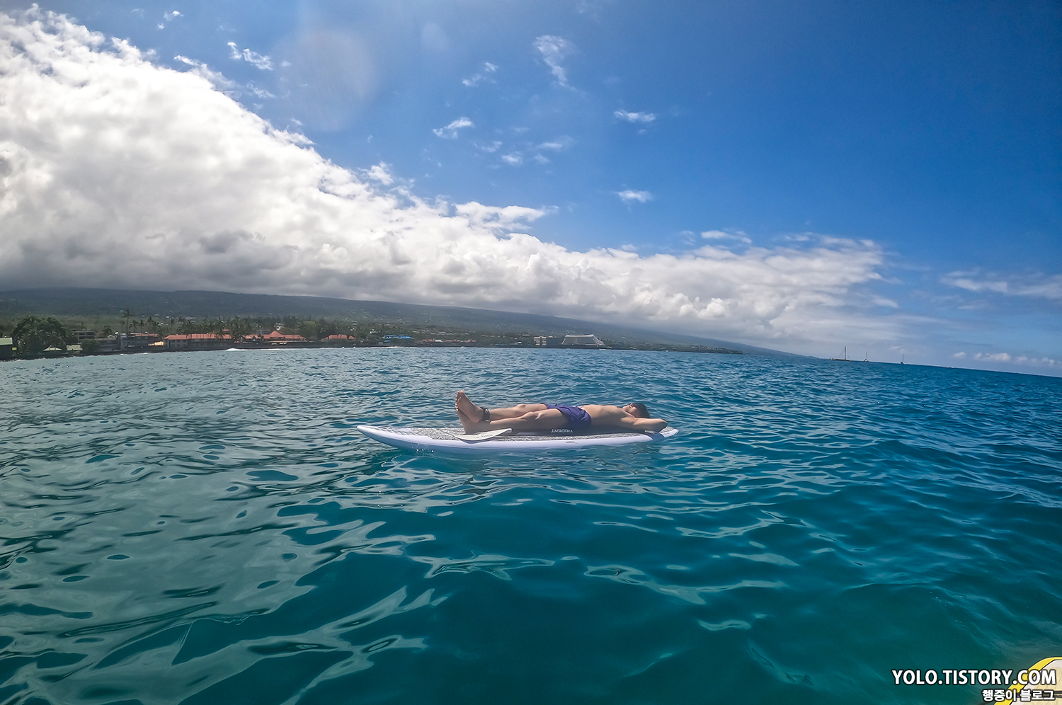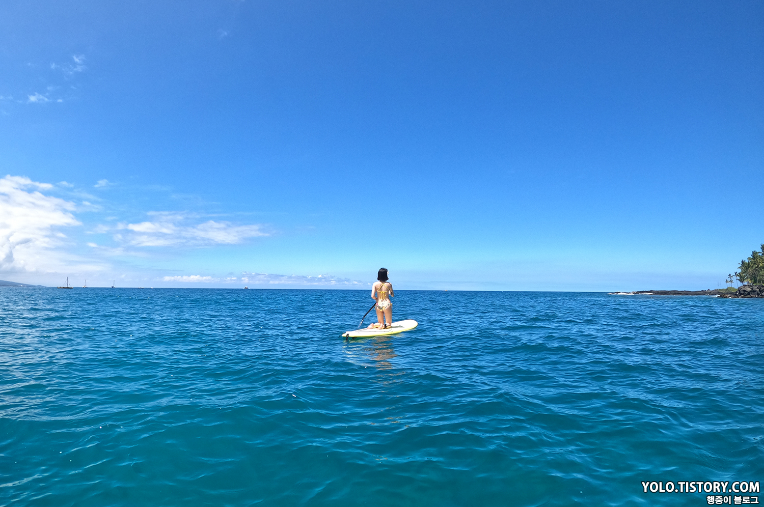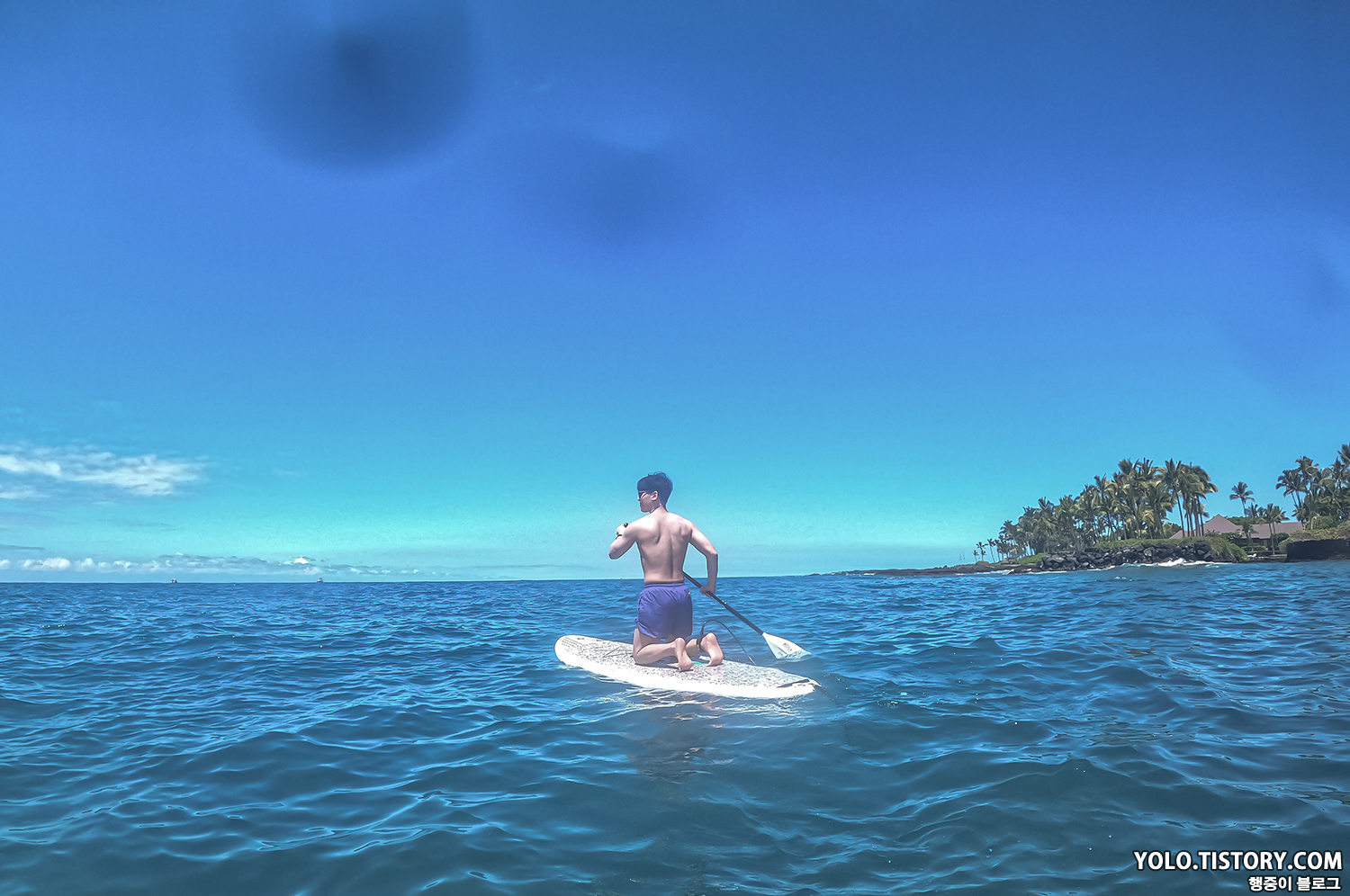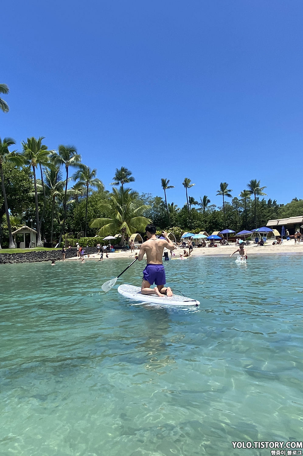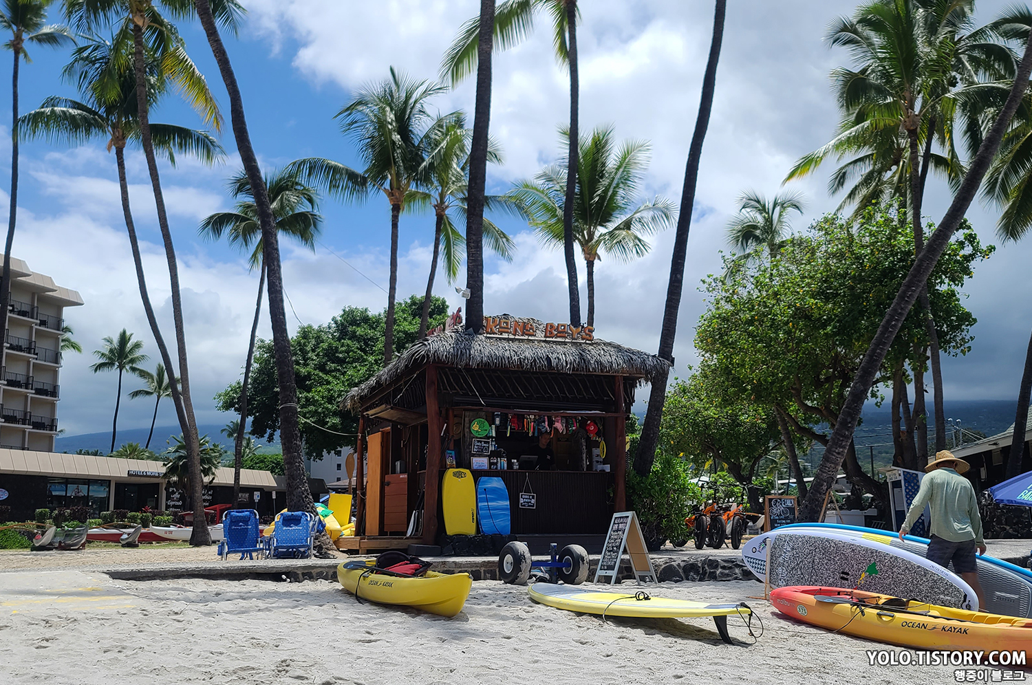 숙소에 올라가서 수영복으로 갈아입은 뒤 해변으로 갔다, 체크인 시 받았던 바우처를 코나 보이즈에 제시하면 의자 두 개와 파라솔을 대여해준다. 코나 보이즈에선 패들보드와 카약 등 액티비티 물품도 대여도 가능했다. 패들보드는 시간당 $29였는데 한번 체험해 보기로 했다. 역시나 대여 시에 이것저것 많이 물어봐서 당황했다. 덕분에 아내는 패들보드 경험자가 되었다...