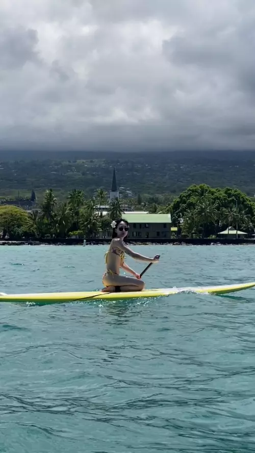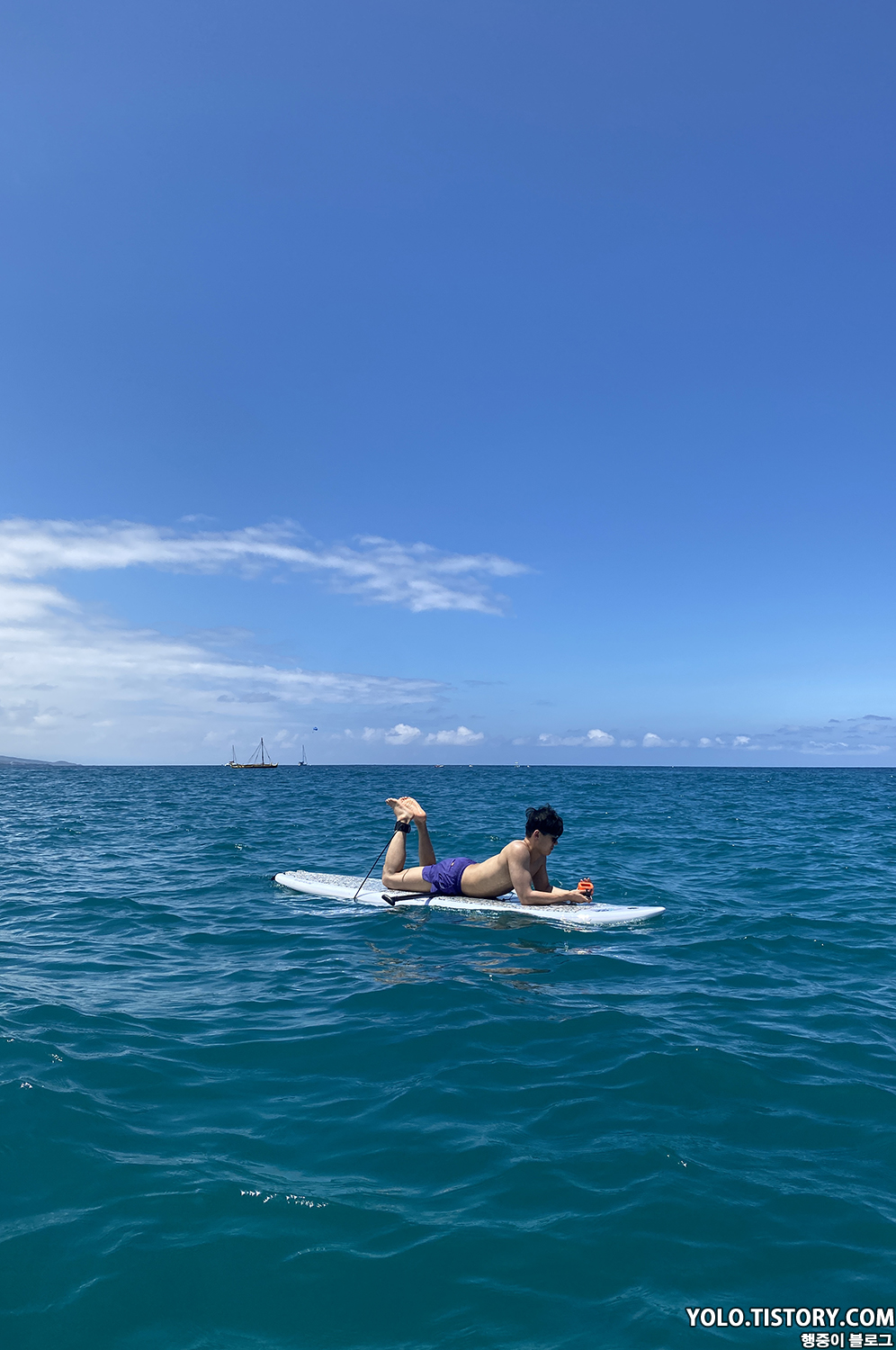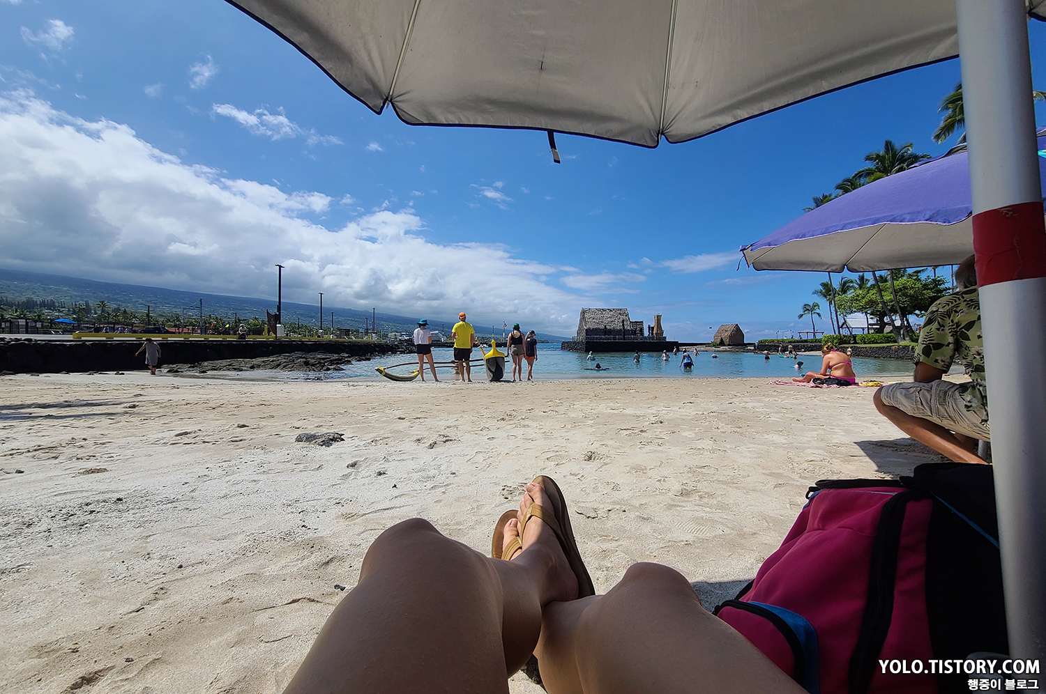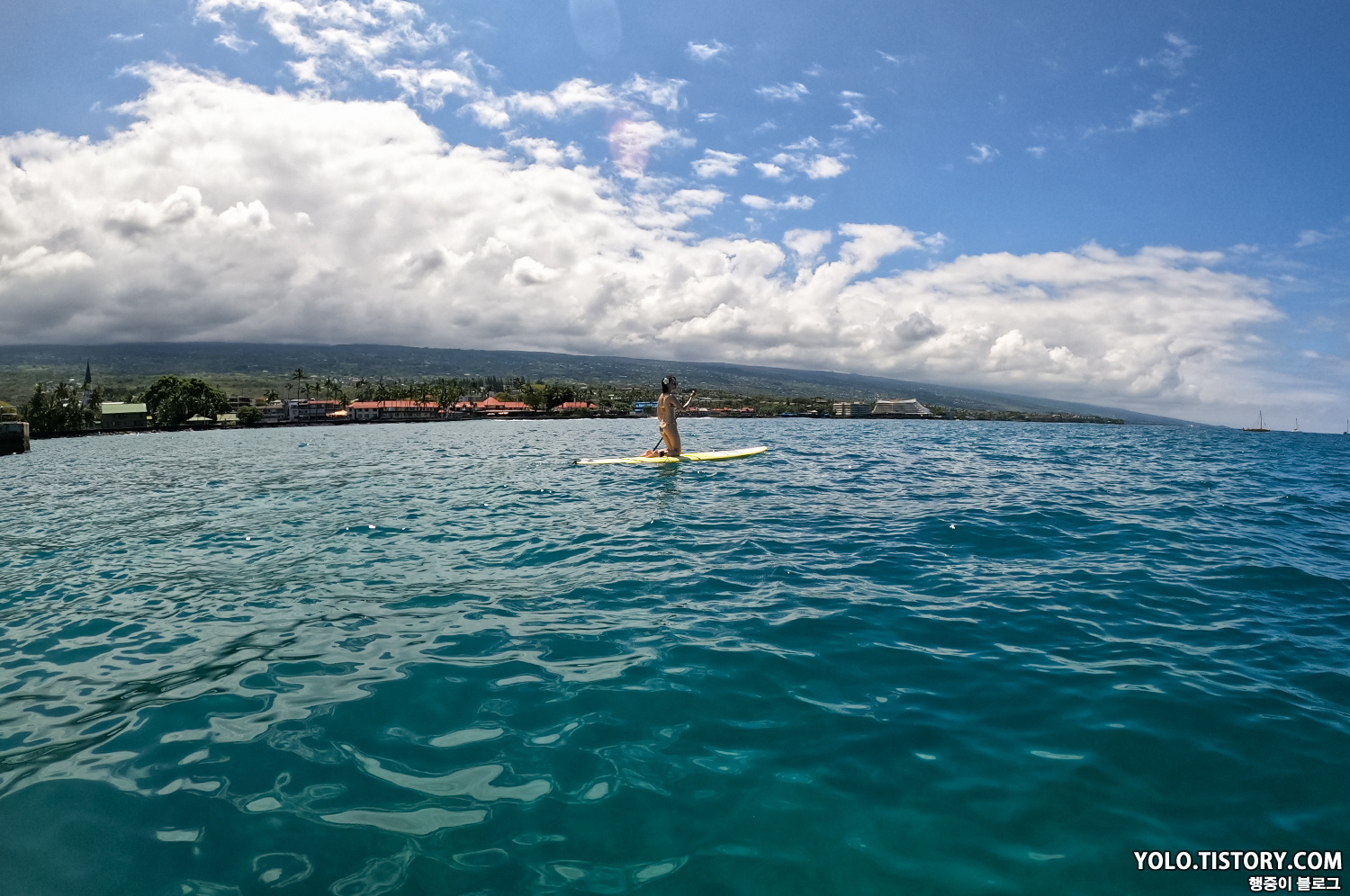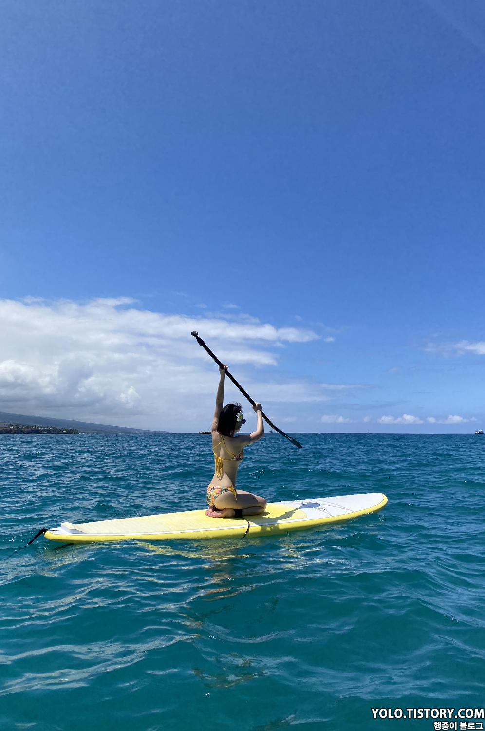 숙소에 올라가서 수영복으로 갈아입은 뒤 해변으로 갔다, 체크인 시 받았던 바우처를 코나 보이즈에 제시하면 의자 두 개와 파라솔을 대여해준다. 코나 보이즈에선 패들보드와 카약 등 액티비티 물품도 대여도 가능했다. 패들보드는 시간당 $29였는데 한번 체험해 보기로 했다. 역시나 대여 시에 이것저것 많이 물어봐서 당황했다. 덕분에 아내는 패들보드 경험자가 되었다...
