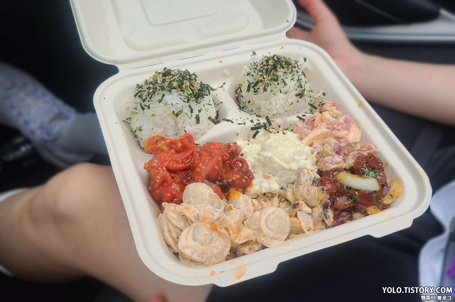 준비를 마치고 오후 3시쯤 나와 코나에서 유명한 다포케쉑을 갔다. 포케는 하와이의 날생선 샐러드를 부르는 명칭이다. 포케 플레이트 $35 짜리를 구매하고, 팁을 $5 지불했다. 명칭은 정확하게 기억은 나지 않지만, 주꾸미와 조개, 참치 등등 넣었던 것 같다. 맛은 아주 맛있었다. 나중에 와이키키에서도 포케를 먹었는데 이런 맛이 나지 않았다. 포케를 산 뒤에 숙소에 두고 온 짐 때문에 다시 숙소에 들렀다가, 마우나케아로 출발했다.