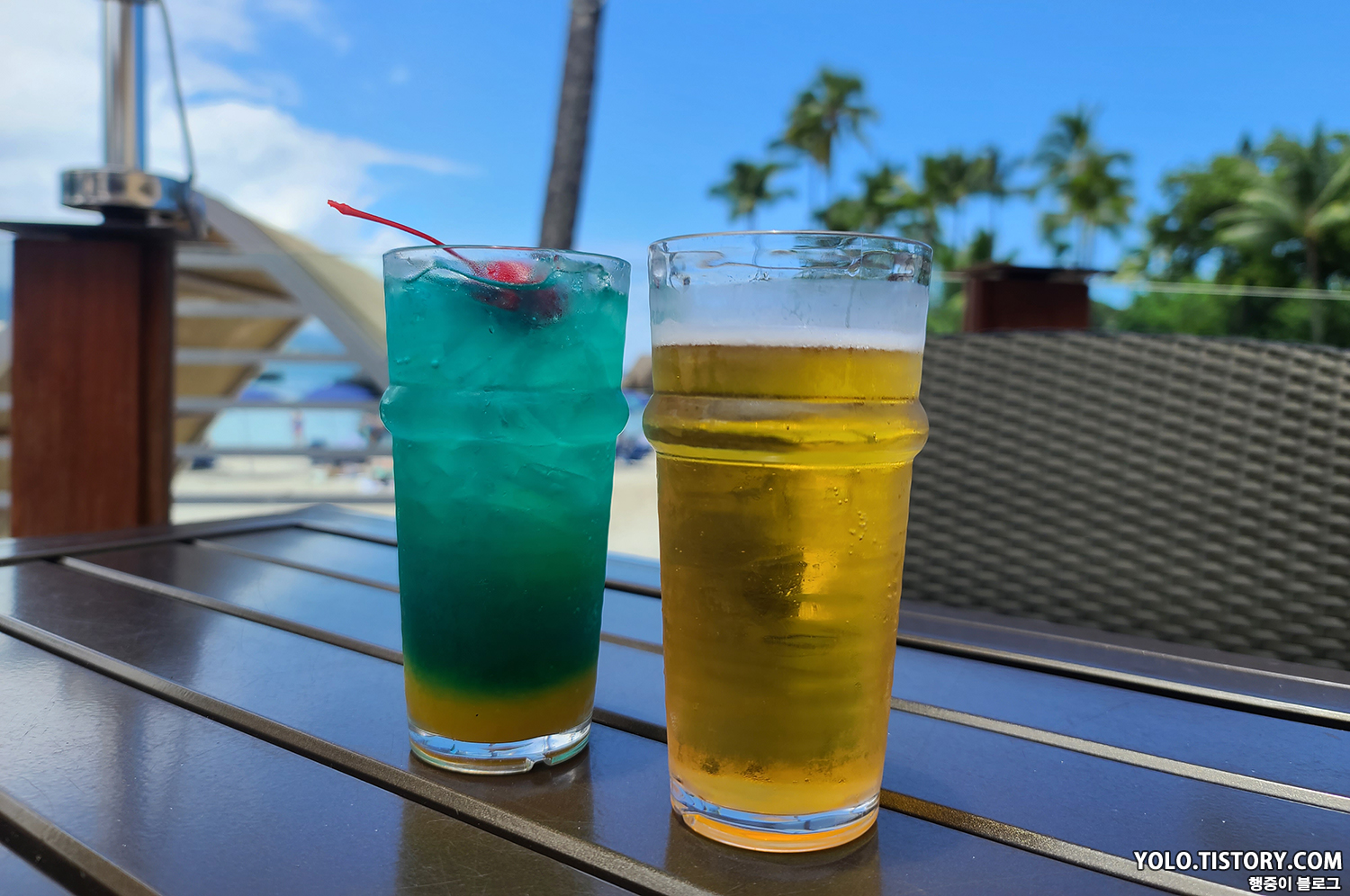 바다 자체가 파도가 잔잔해서 어느 정도 익숙해지니 너무 재미있었다. 망망대해에 혼자 있는 느낌과 더불어 반대는 도심이 반대는 끝없는 지평선이 펼쳐져 감탄이 나왔다. 패들보드는 서서도 많이 타던데, 코어 힘이 부족해서인지 서서 타지는 못했다. 정말 한 시간이 후딱 지나갔다. 반납 후 체크인 시 받았던 바우처로 웰컴 드링크를 마시고 스노클링을 했다. 캡틴 쿡보다 더 많은 물고기를 보았던 것 같다. 아내가 스노클을 하다가 이마를 긁혀서 반창고를 붙여주고 좀 쉬다가 숙소로 돌아가 다음 일정을 준비했다.