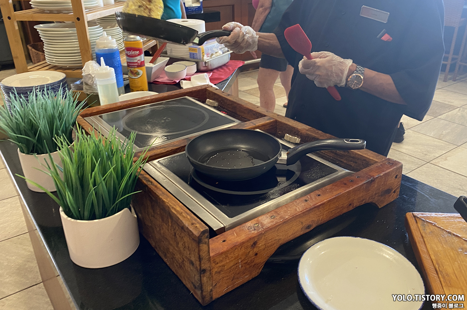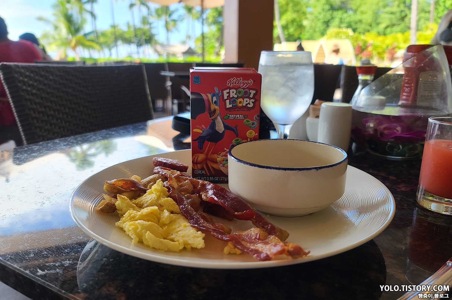 아침 일찍 일어나려 했지만 늦잠을 자서 8시 30분쯤 일어났다. 간단히 세수만 하고, 리조트 내에 있는 식당으로 가서 조식을 먹었다. 내가 생각했던 만큼 음식의 종류가 많지는 않았다. 영어 울렁증이 생긴 나와 다르게 아내는 오믈렛 주문도 척척했다. 덕분에 맛있는 오믈렛을 먹을 수 있었다. 베이컨과 스크램블 에그, 햄과 시리얼로 배를 채웠다. 후식이었던 과일들은 다 별로였는데 수박이 은근히 맛있었다. 적당히 배부르게 먹고 $3 정도 팁으로 두고 나왔다.