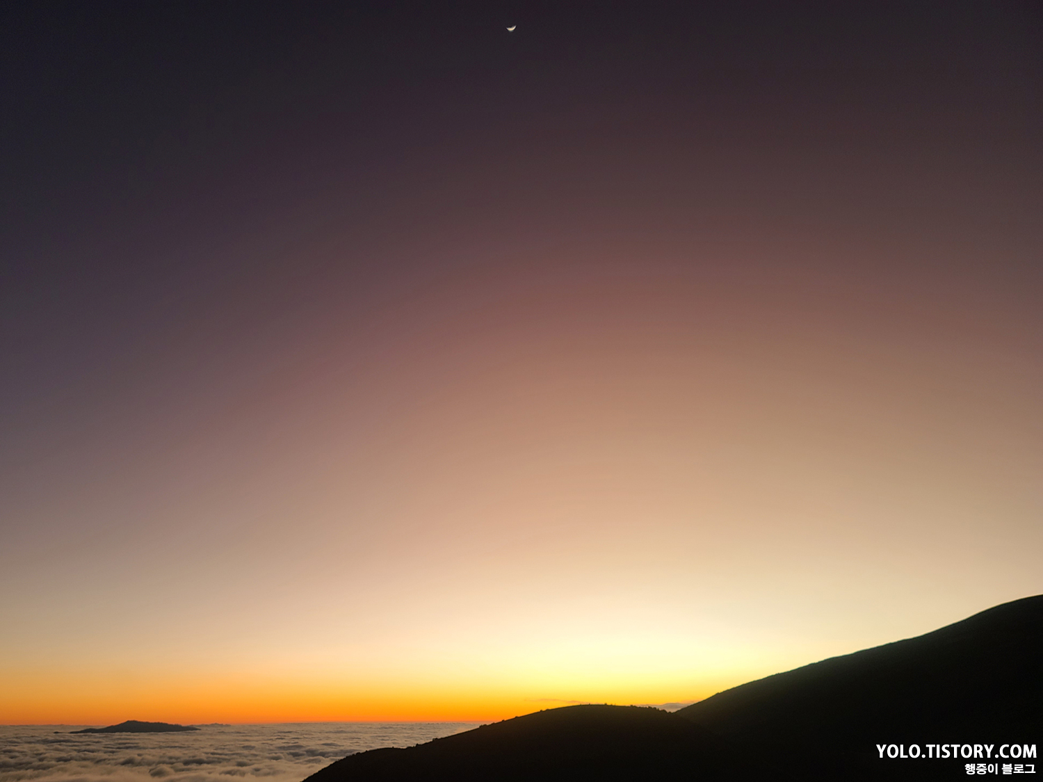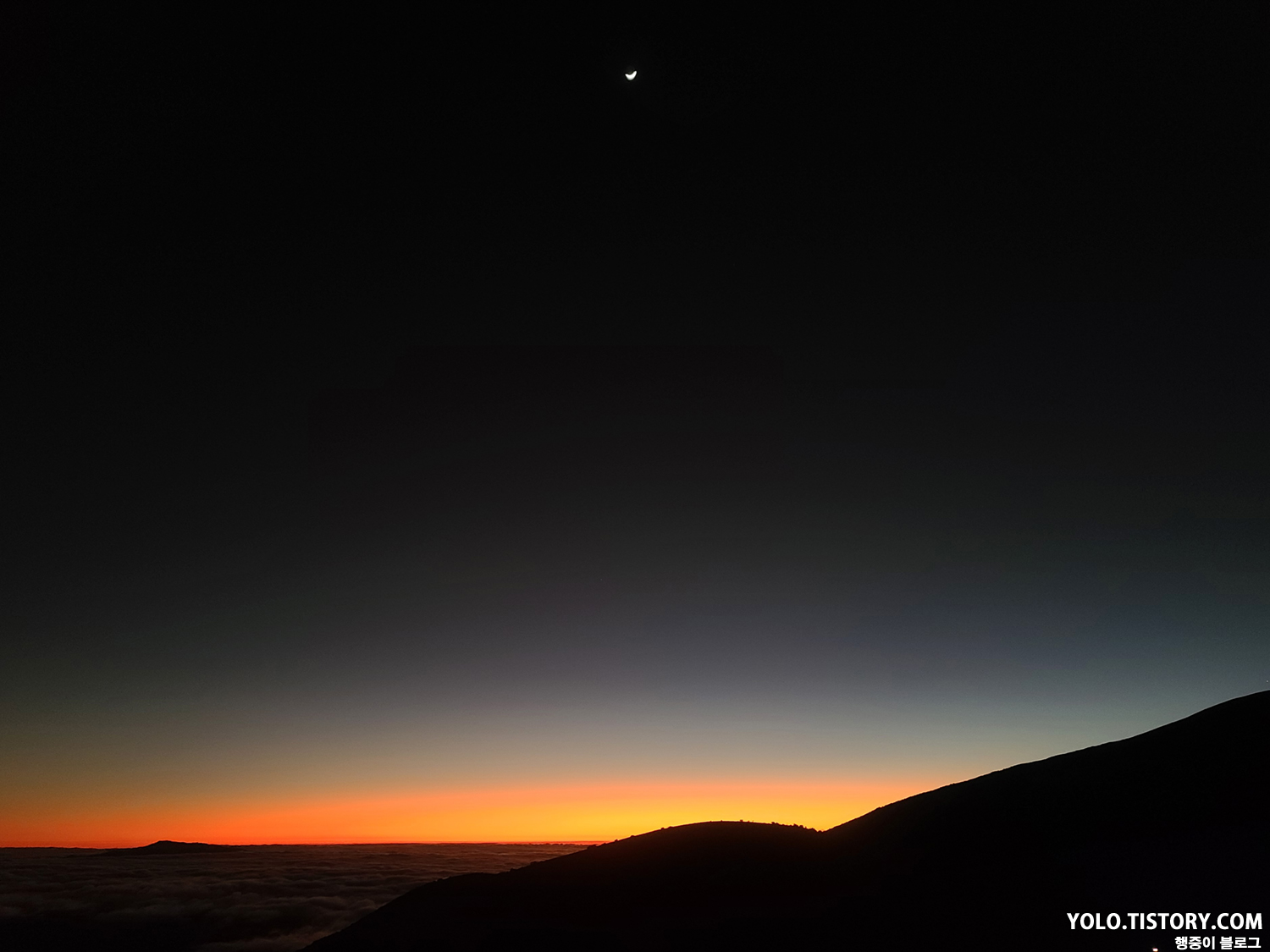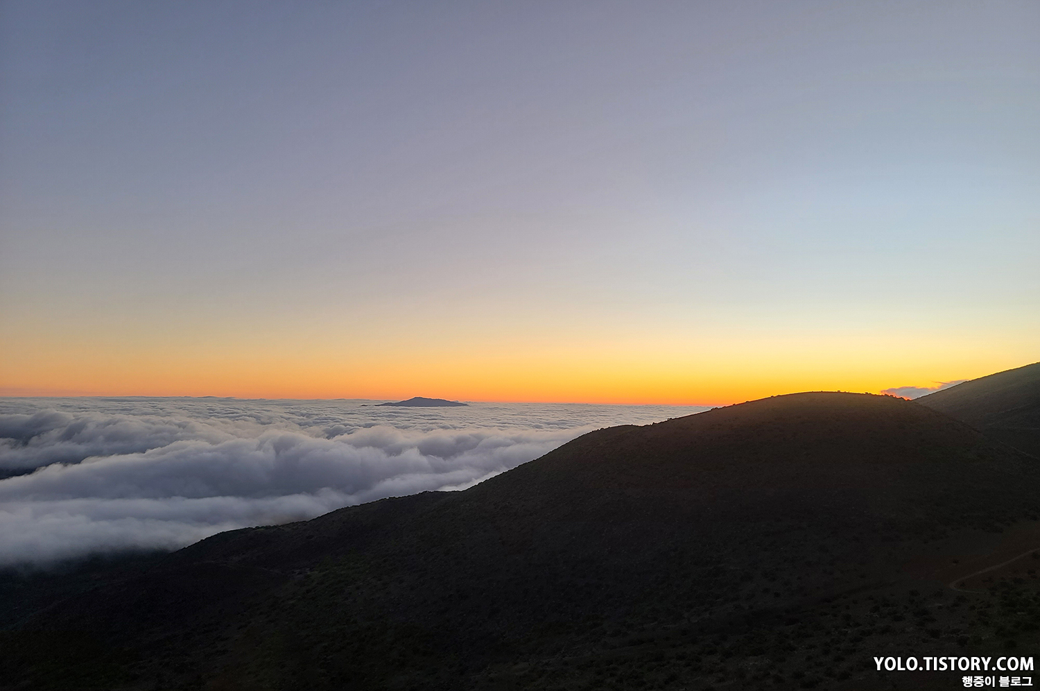 산 아래 구름이 깔리고 진한 주황색의 노을은 아름다웠다. 시간에 따라 변하는 색깔도 일품이었다. 두 시간 정도를 선셋 힐에 머물렀는데 노을이 지는 시간은 정말 찰나의 순간이었다. 석양이 거의 다 사라져서 더 어두워지기 전에 내려갔다. 조금 일찍 내려왔는데도 앞이 보이지 않아 길을 조금 헤매었다.