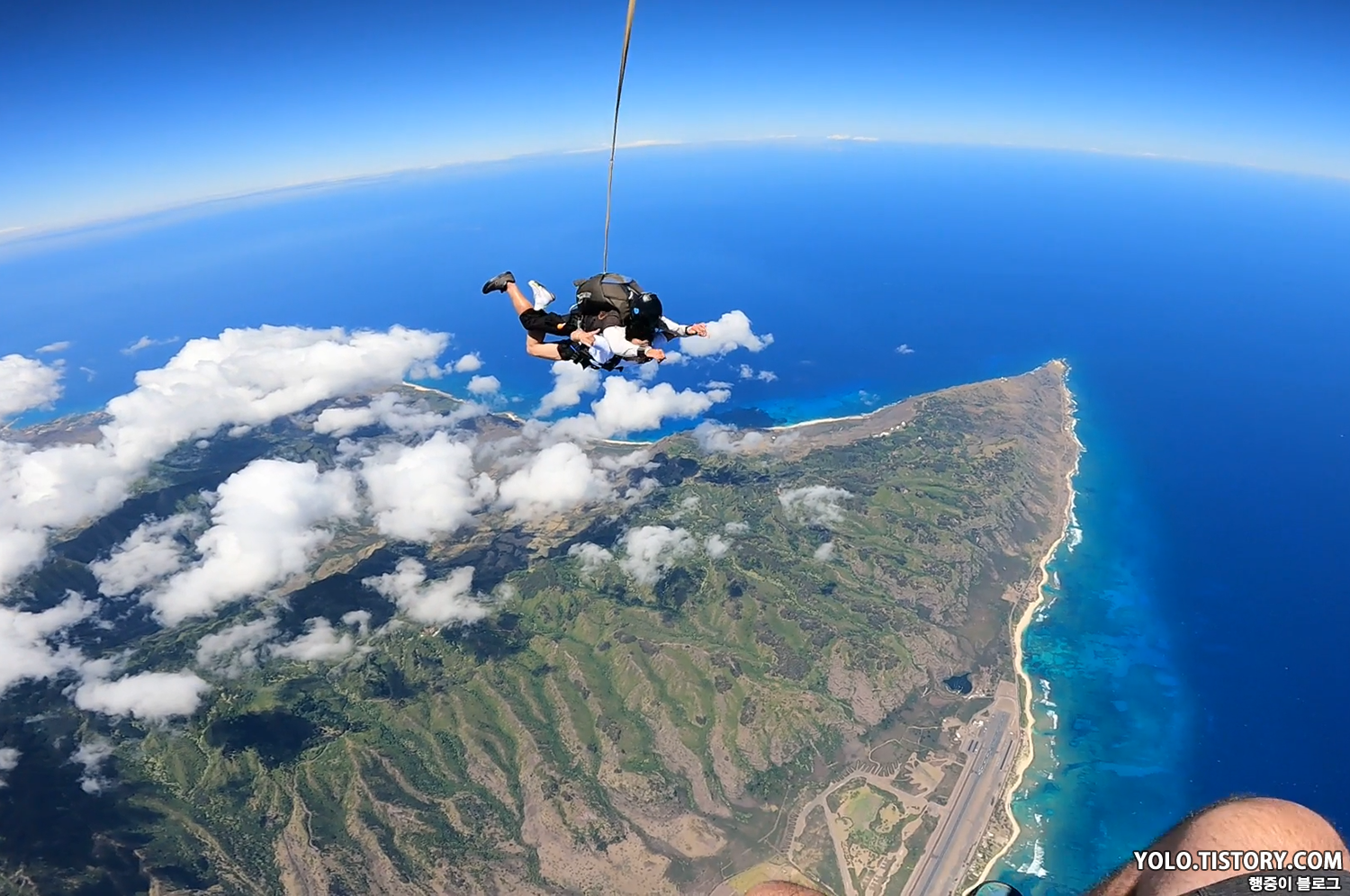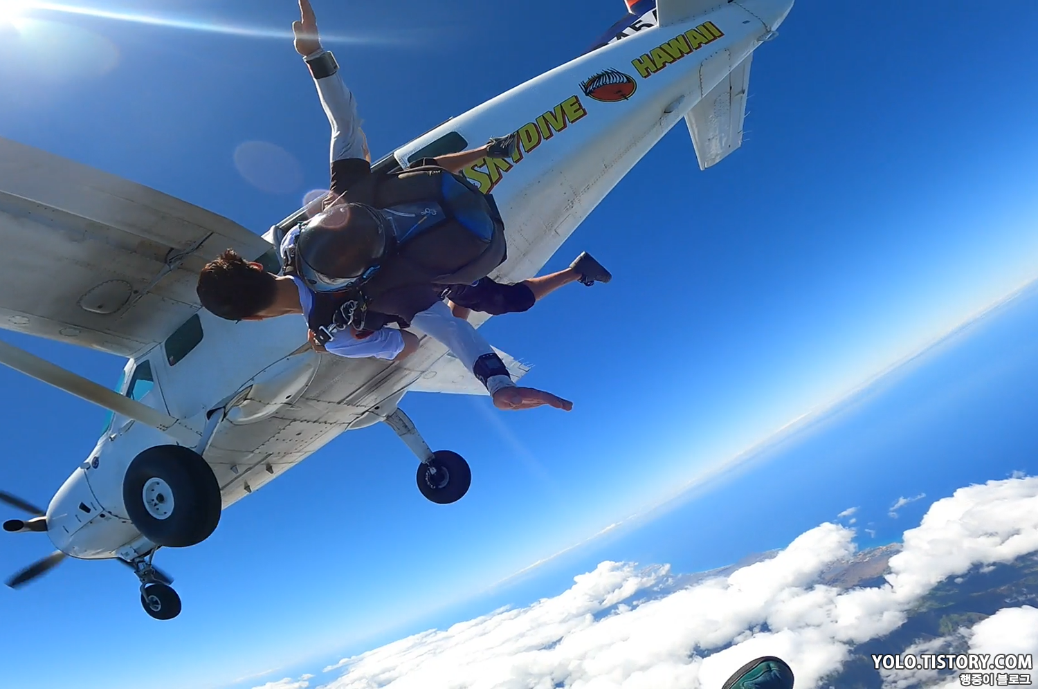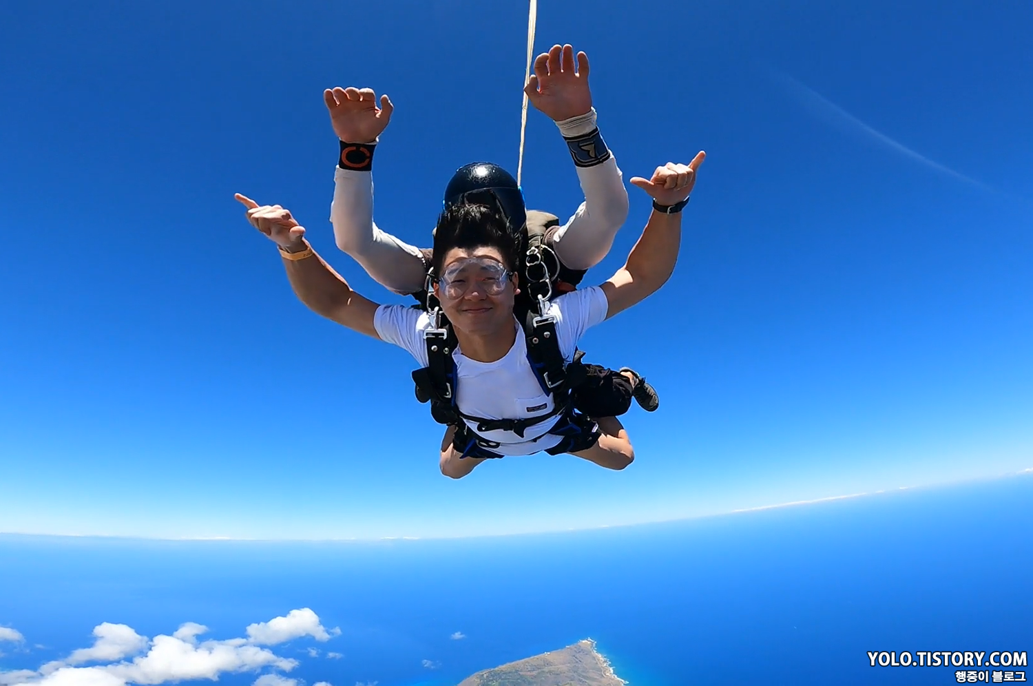 아내가 스카이 다이빙하면 '숨을 못 쉰다. 귀가 아프다더라'라고 겁을 많이 줘서 걱정했는데 뛰자마자 너무 재미있었다. 차라리 롤러코스터가 더 무서웠던 것 같다. 롤러코스터를 타면 느껴지는 떨어지는 느낌도 안 났다.