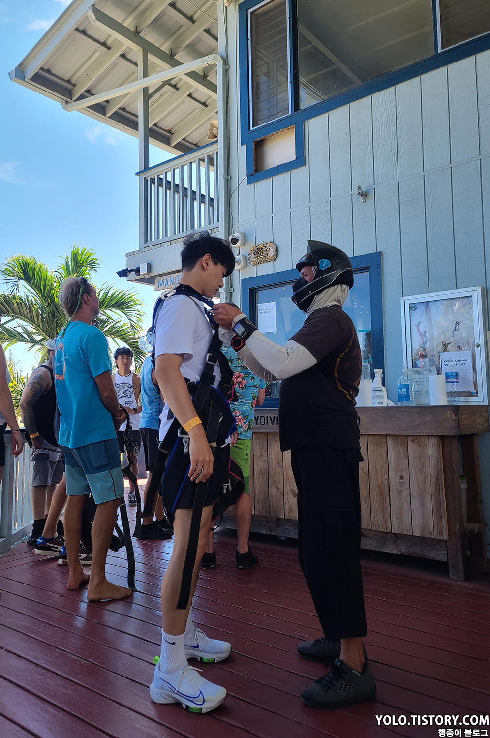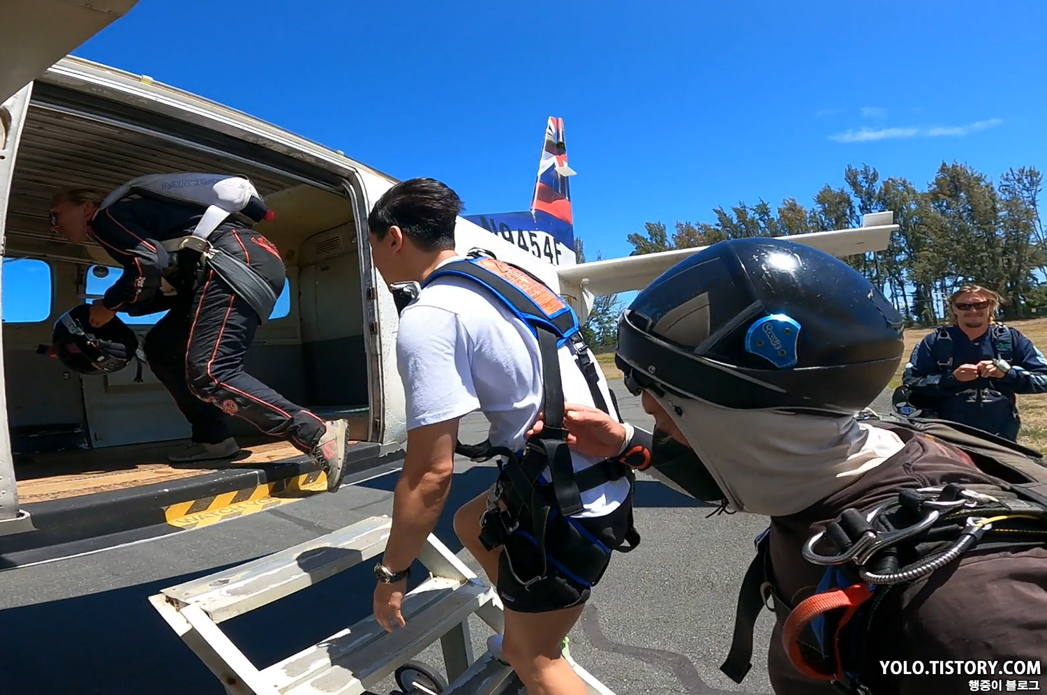 10시 30분쯤 되었을까? 교관이 나를 부르더니 뛰러 간다고 했다. 또 되지도 않는 영어 하다가 이름만 확인당했다. 얼떨떨하게 장비를 착용하고 주의사항과 낙하 방법에 대한 설명을 들었다. 긴장 풀고 즐기라는 말을 계속하셨다. 아내도 장비를 착용하니 카메라맨들이 와서 가벼운 인터뷰 촬영을 하고 다 같이 활주로로 이동했다.