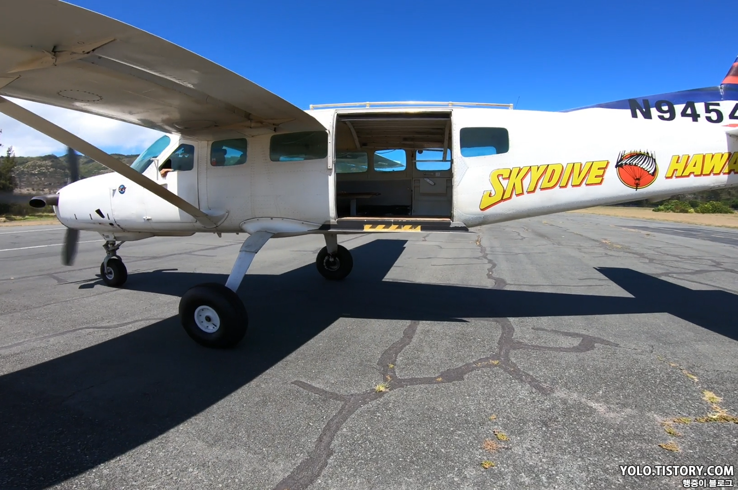 이동하면서 교관님에게 하루에 몇 번 정도 다이빙을 하는지 물어봤는데 하루 평균 7번 정도 뛴다고 한다. 기름 냄새가 풀풀 나는 경 비행기를 타고 끊임없이 올라갔다.