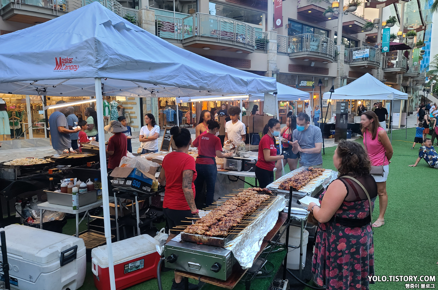 일정을 모두 마치고 숙소로 돌아와 저녁을 먹으러 나왔는데, 숙소 앞 광장에서 15주년 노점이 열리고 있었다. 꼬치가 참 맛있어 보였다.