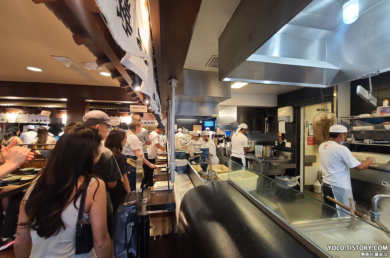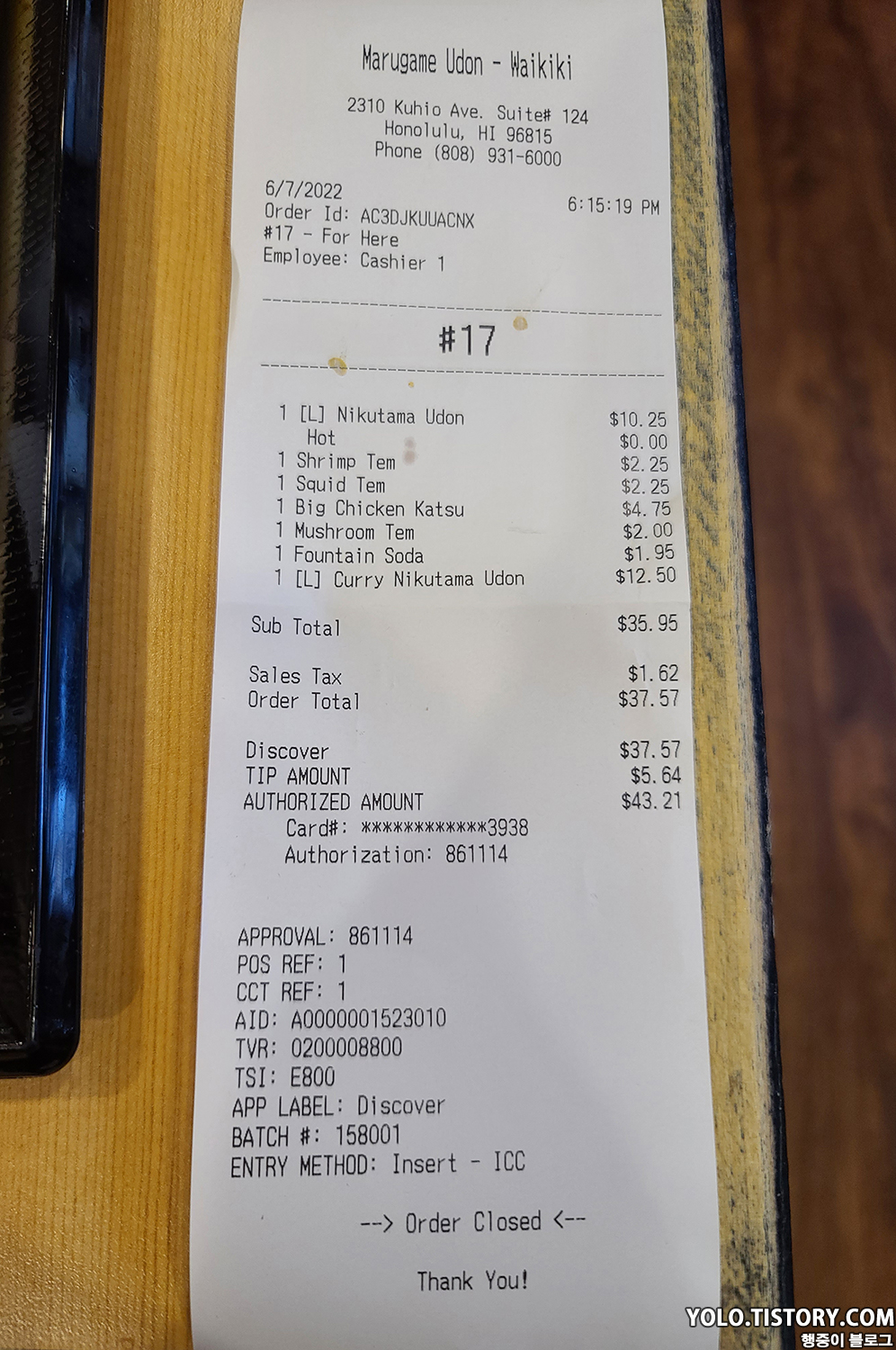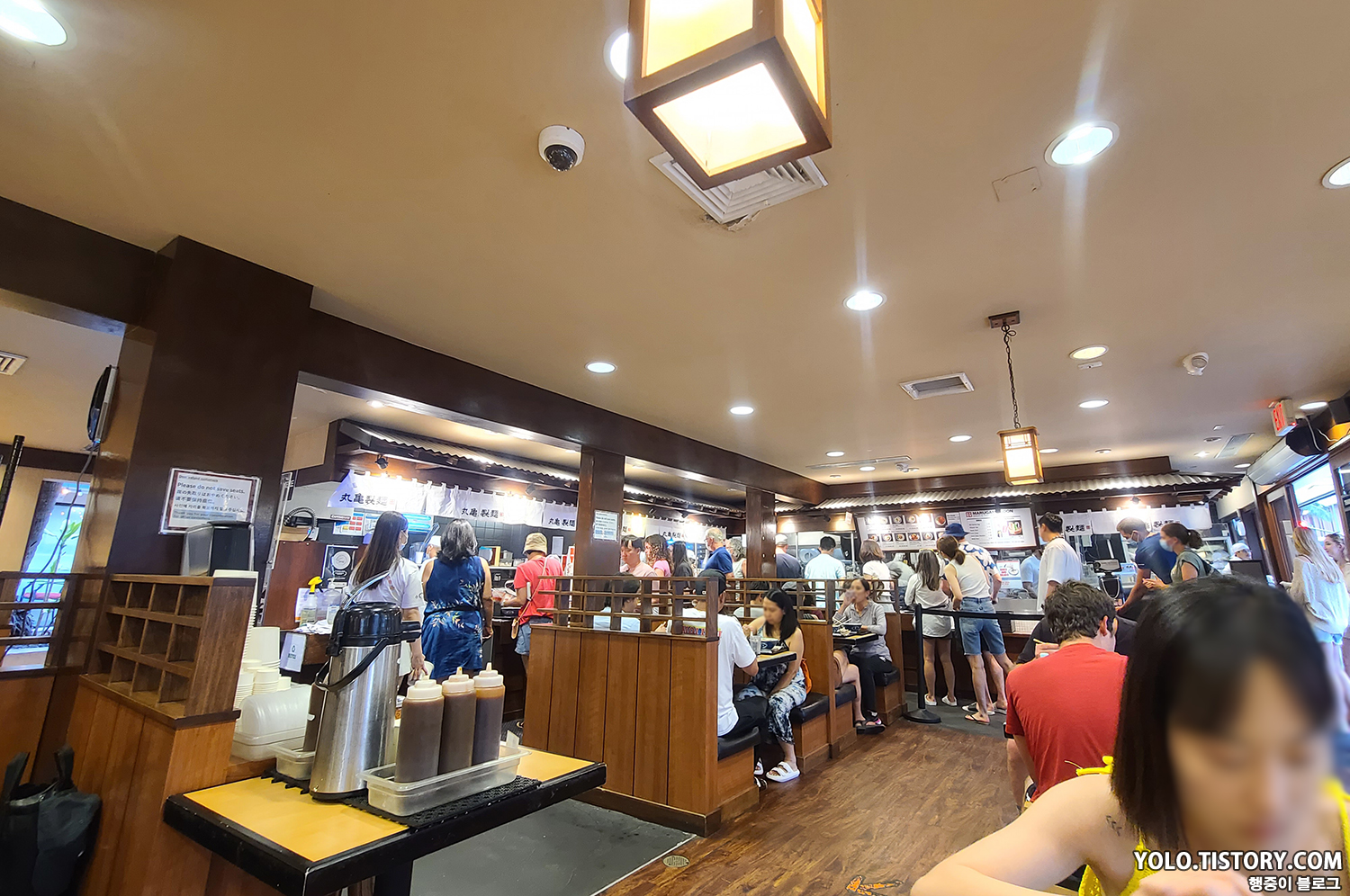 저녁은 마루카메 우동이라는 가게에서 우동을 먹었다. 마루카메제면은 일본의 우동 체인이라고 한다. 와이키키 시내에 있어서 외국인 관광객들이 많이 찾는 듯했다. 30분 정도 대기. 아내는 니쿠타마($9.25)를 먹고 난 카레 니쿠타마($10.05)를 먹었다.