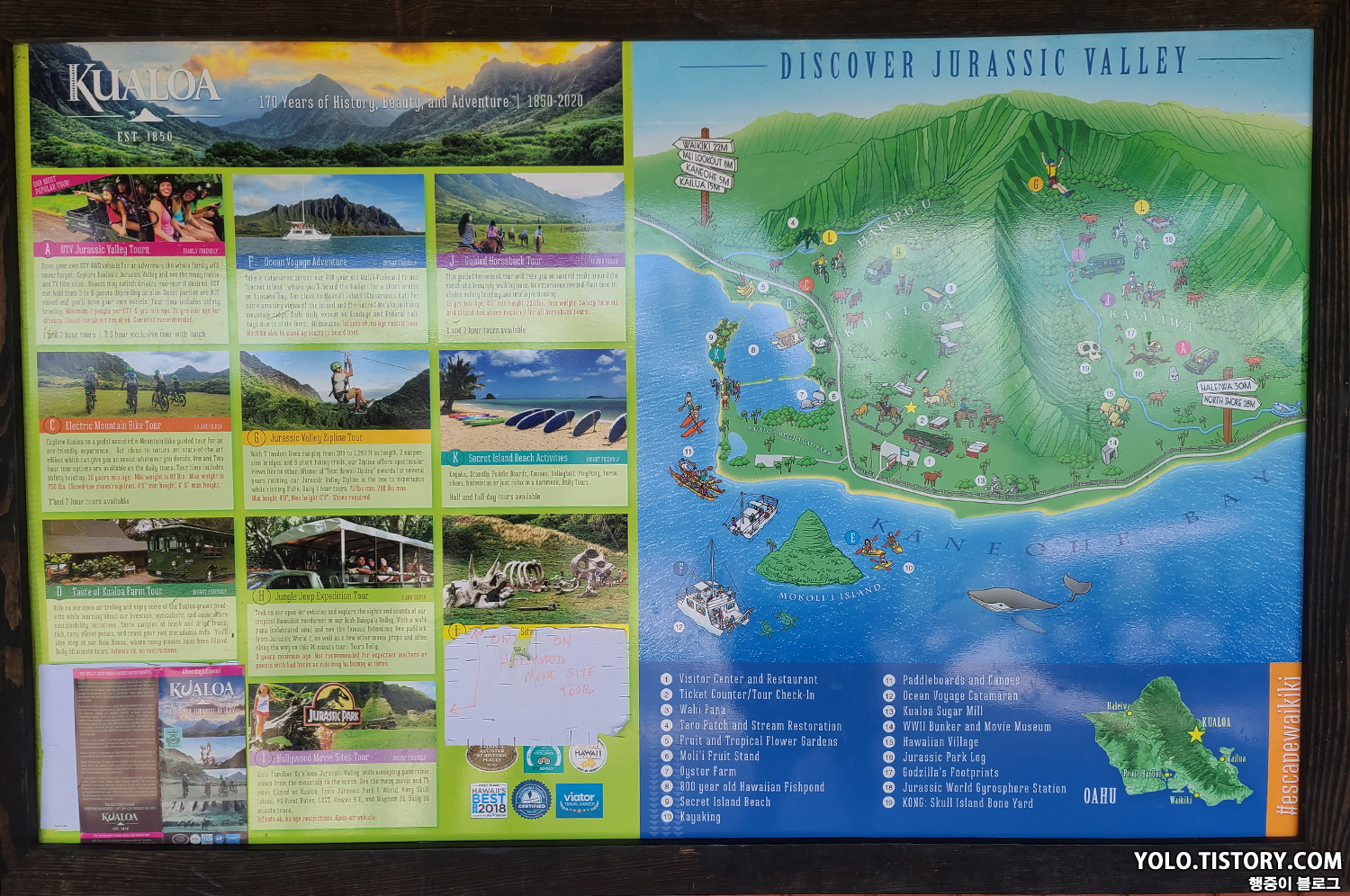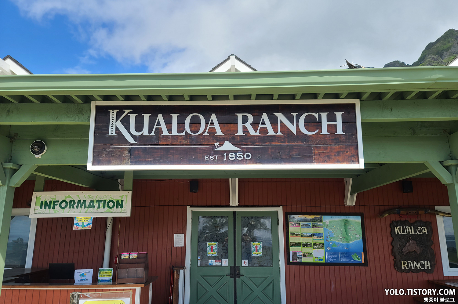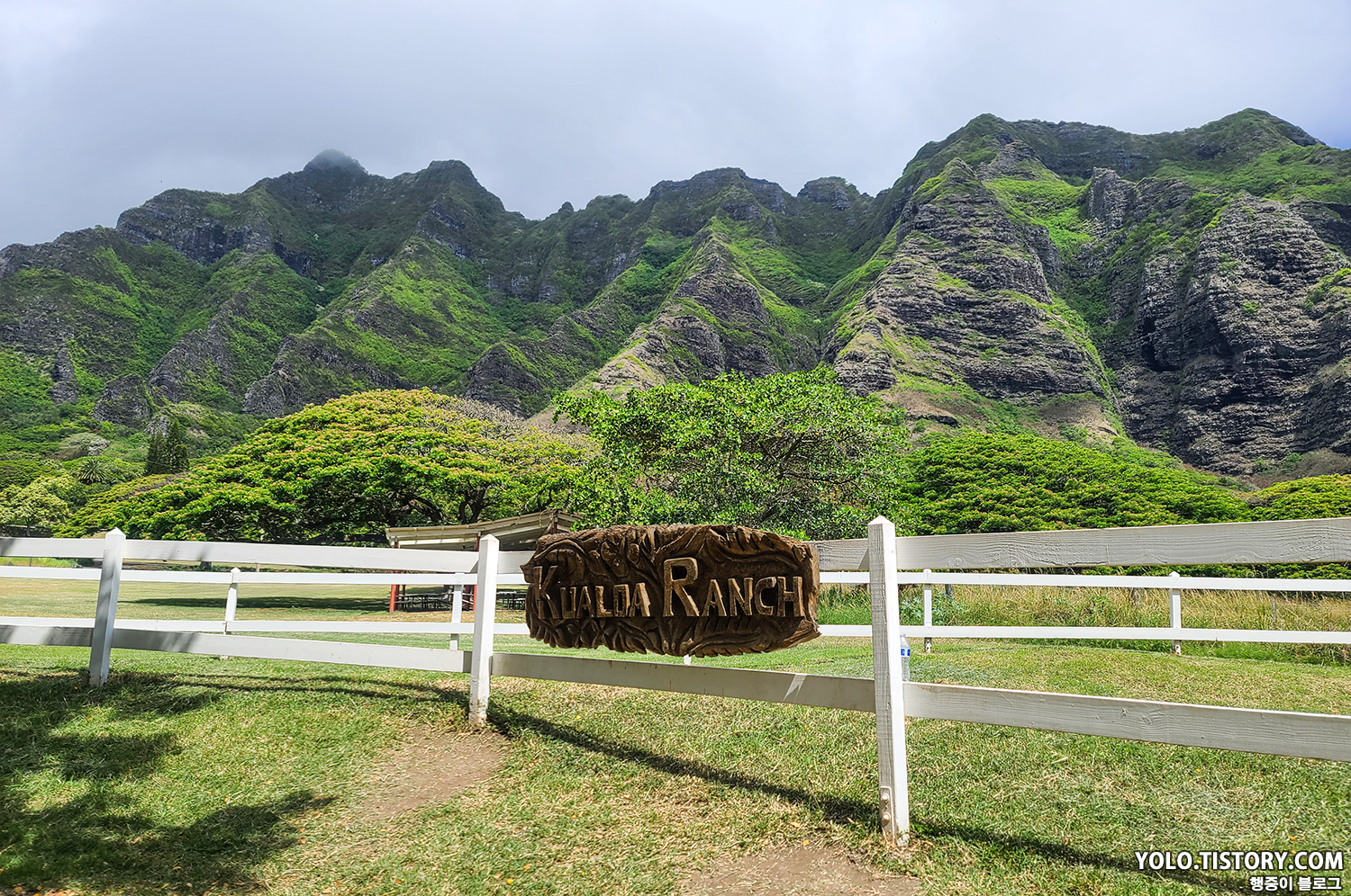 쿠알로아 목장은 오하우 섬 북동쪽에 위치하고 있다. 왕족들의 역사와 밀접한 관계가 있는 장소라고 한다. 숙소에서 약 50분 정도 걸려 오전 9시 40분쯤 도착했다. 인포메이션 간판부터 쥬라기 공원 느낌.