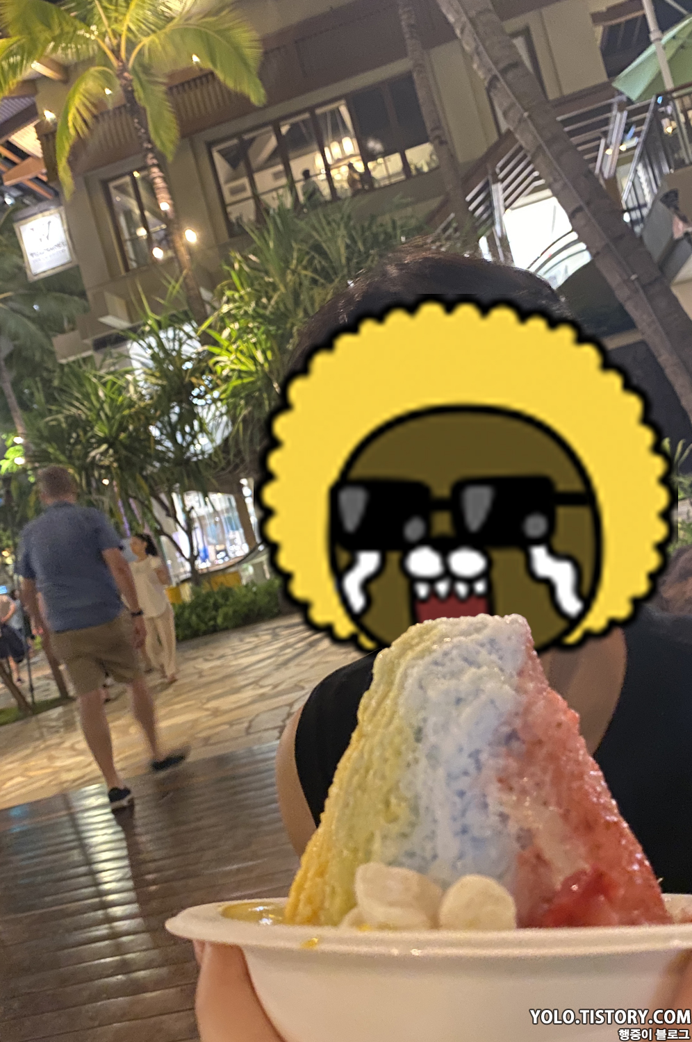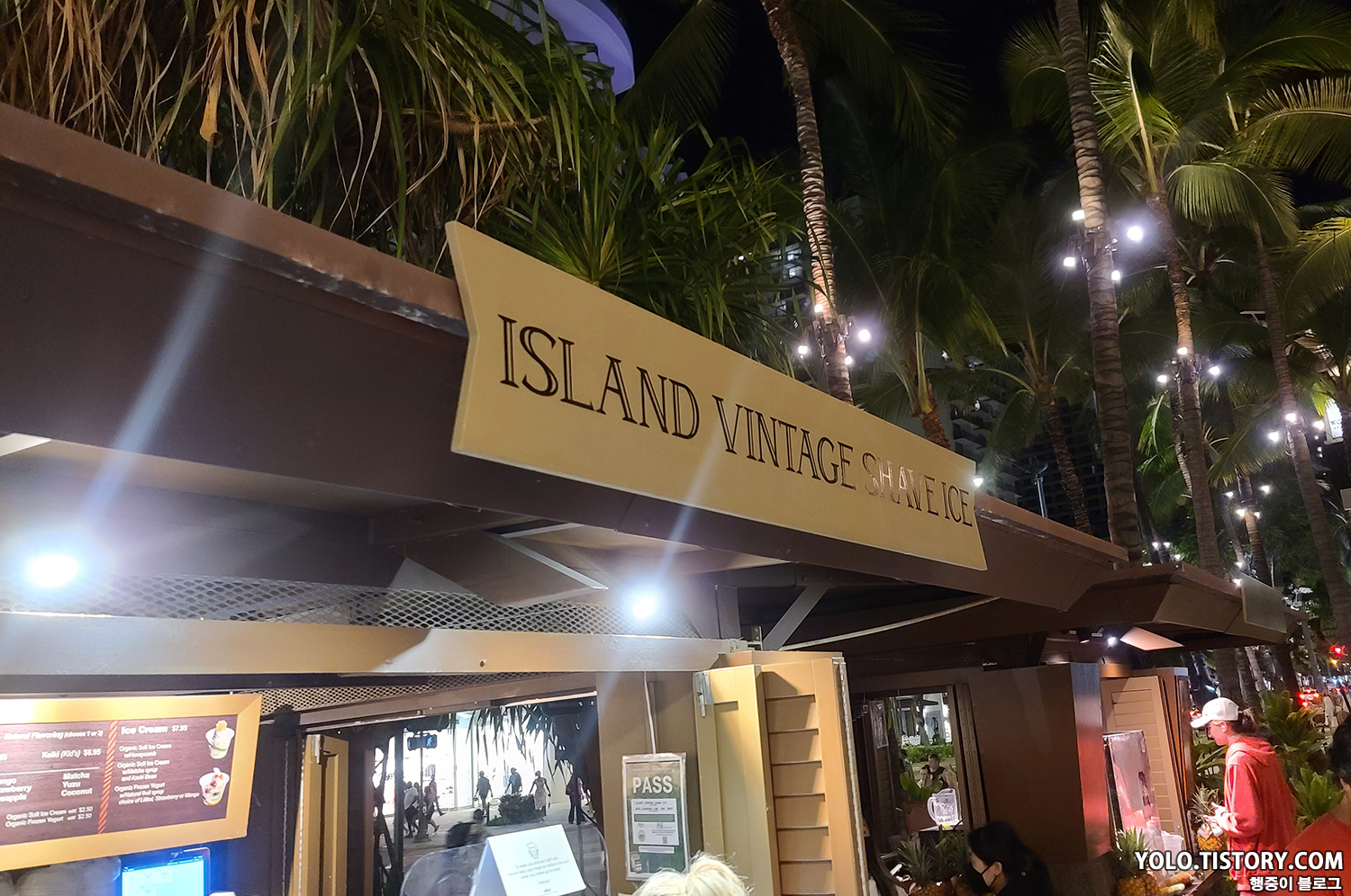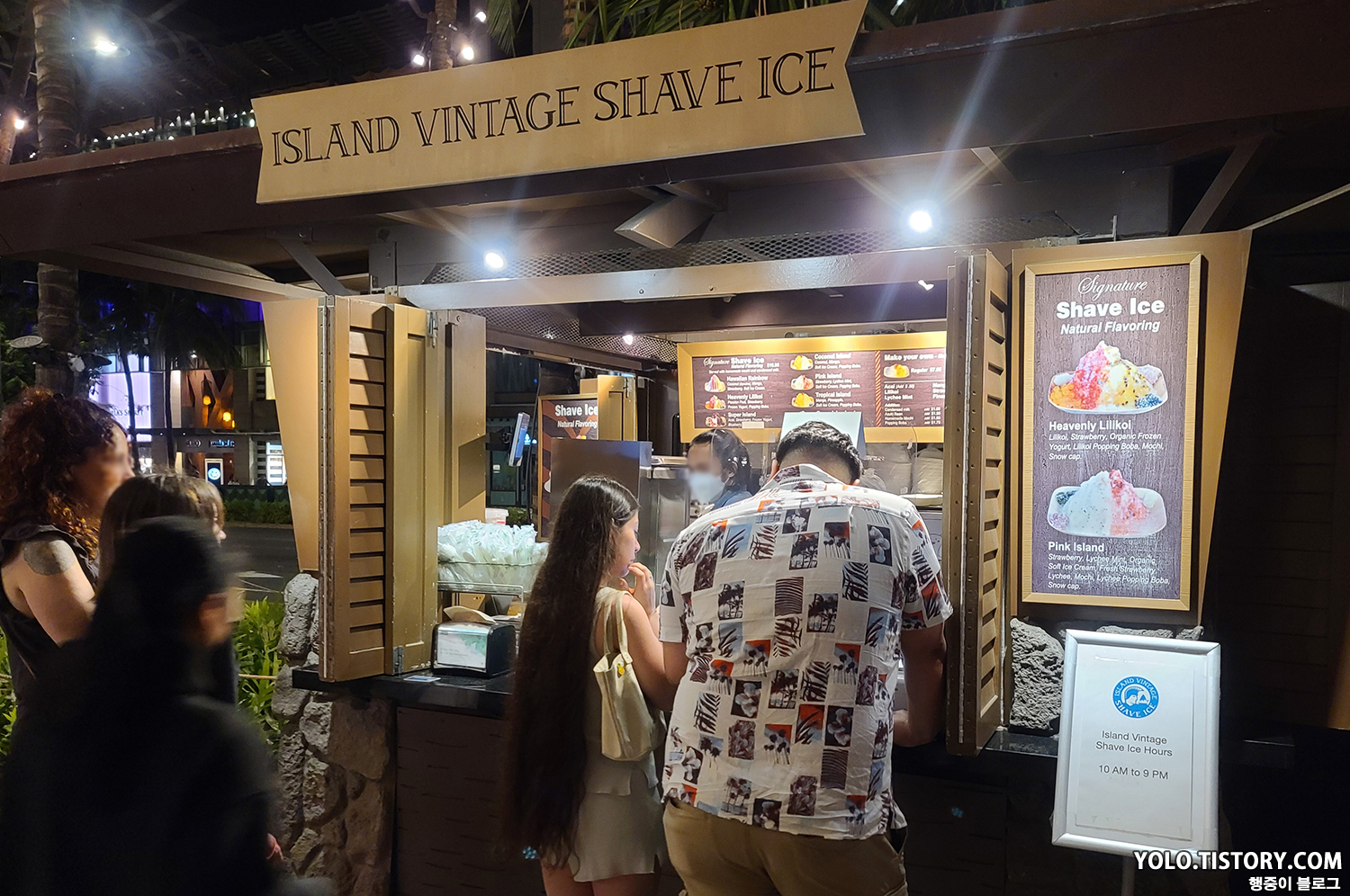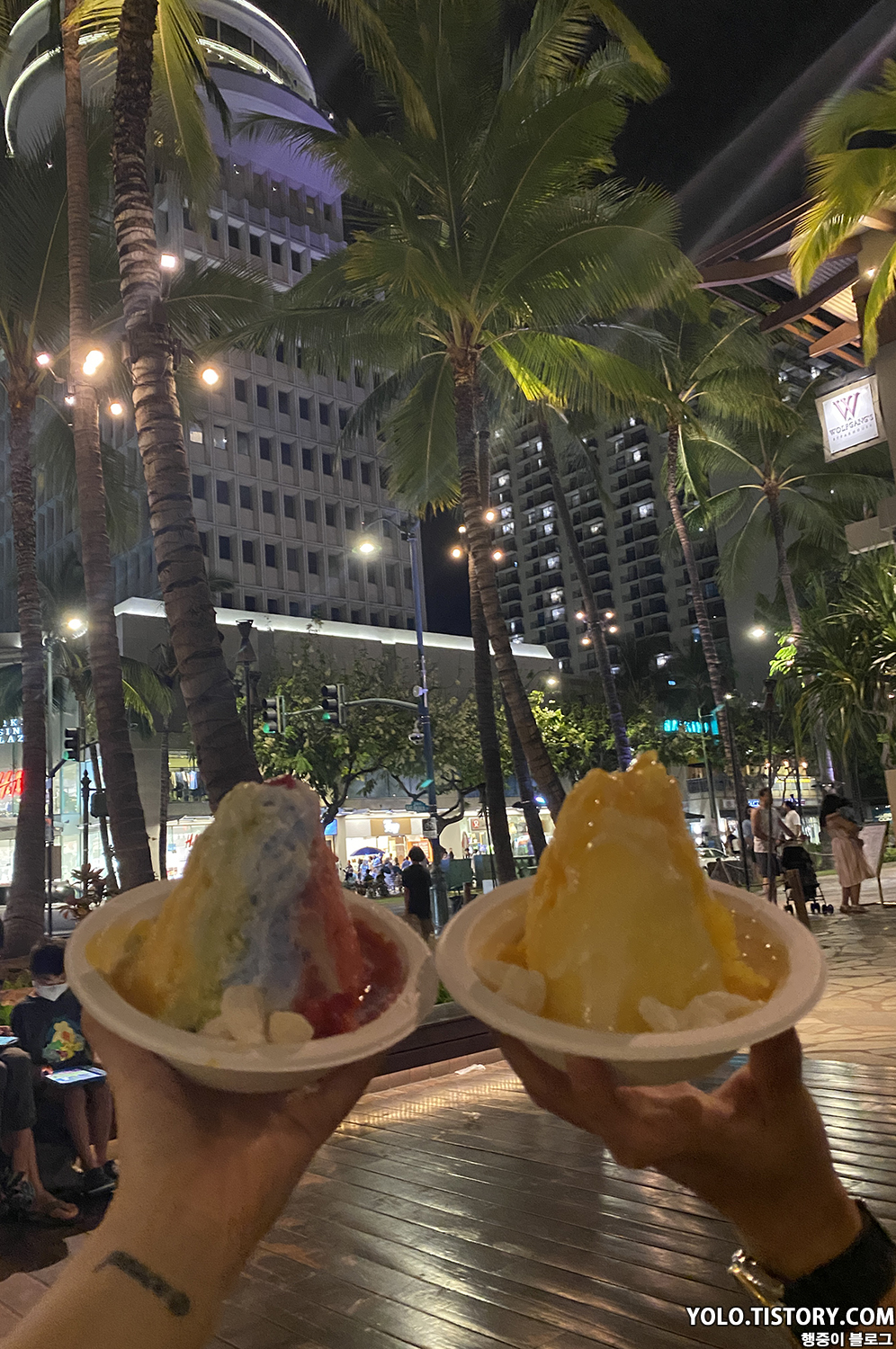 노을을 다 보고 난 뒤 숙소에 들어가기 아쉬워서 후식을 먹으러 돌아다녔다. 날이 더우니 시원한 빙수가 당겨서 아일랜드 빈티지 쉐이브 아이스에서 빙수를 먹었다. 구글 맵에선 건물 안에 위치해 있다고 표시되어 있는데, 그냥 노상 건물이니 참고! 사람 마음이 다 똑같은지 줄이 엄청 길었다. 30분 정도 기다렸다가, 하와이안 레인보우($10.95)와 트로피칼 아일랜드($10.95)를 먹었다. 음... 굳이 사 먹지 않아도 될 맛이었다.
