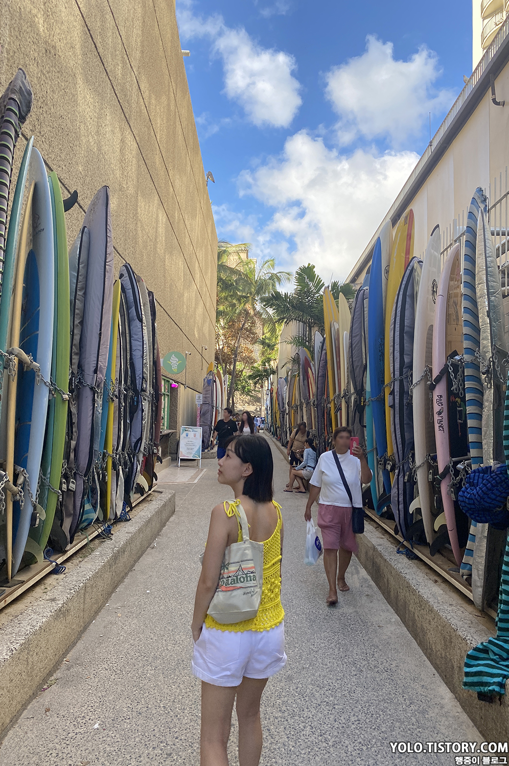 저녁은 우동을 먹기로 하고 와이키키 골목을 거닐었다. 보드들이 잔뜩 보관된 골목을 우연치 않게 발견하여 사진도 찍었다.