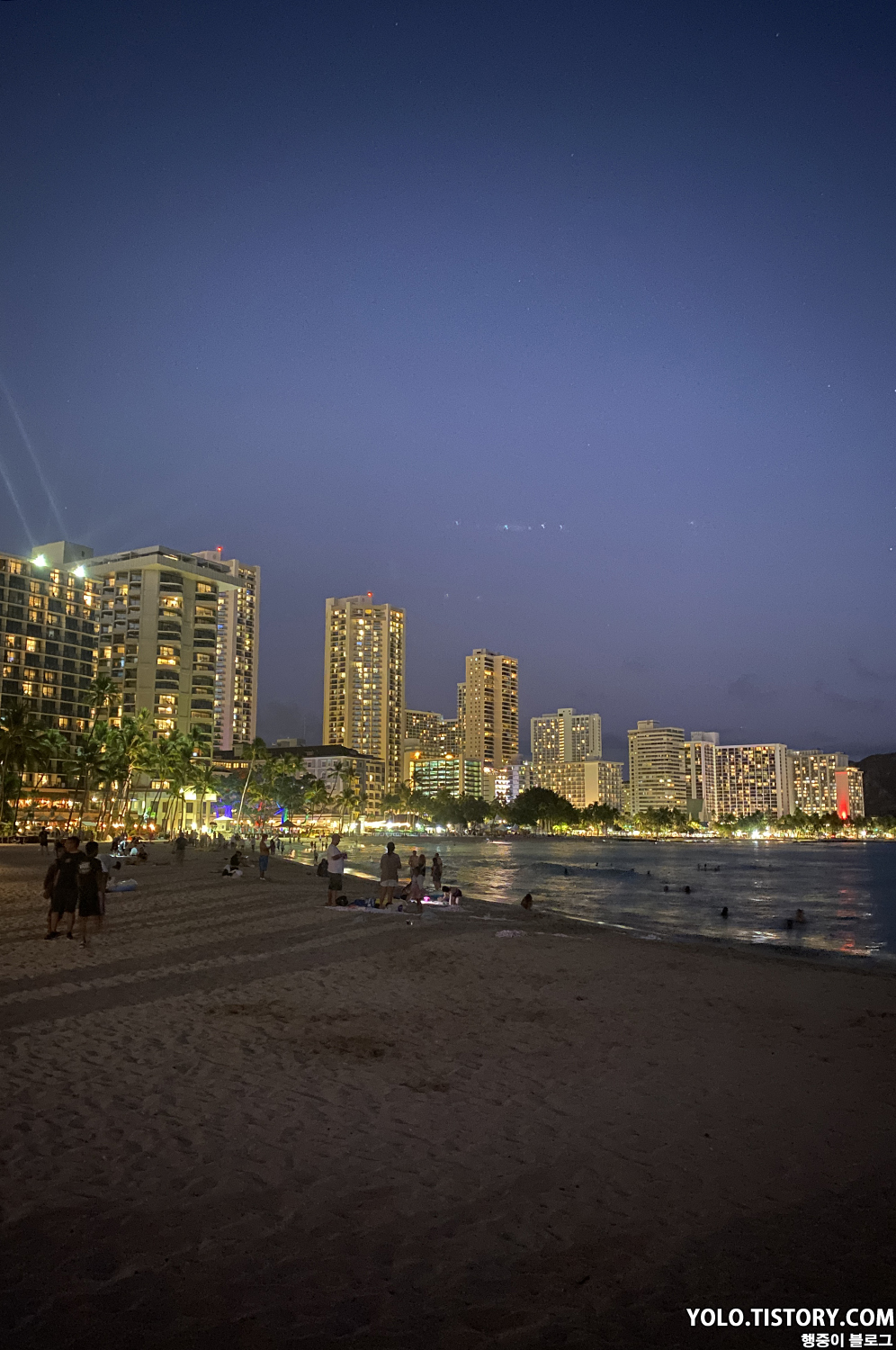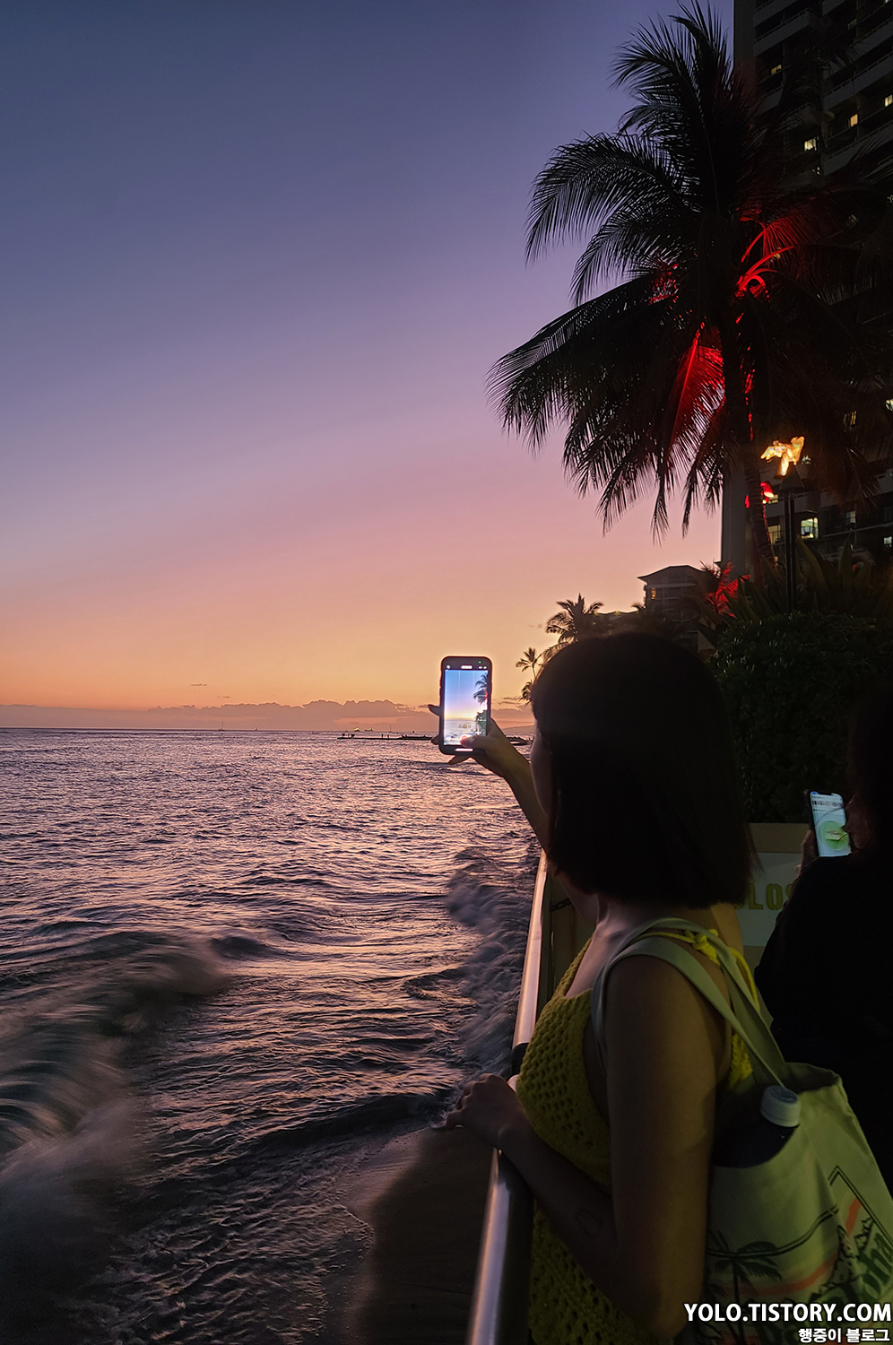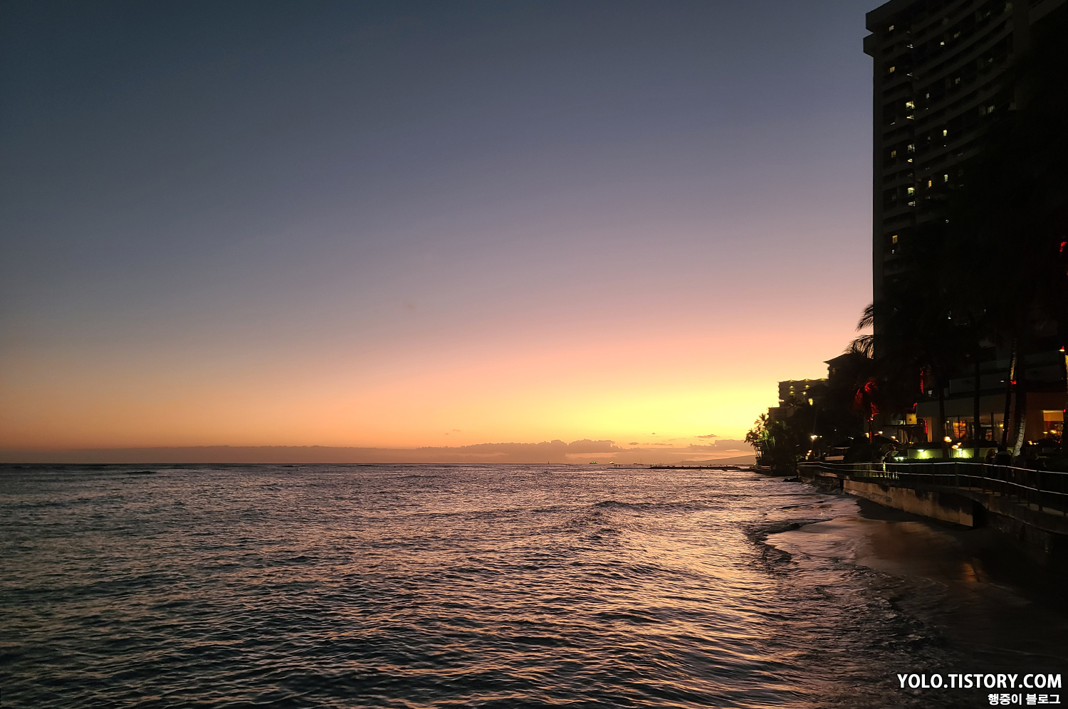 저녁을 먹고 나오니 어느새 노을이 지고 있었다. 후다닥 와이키키 해변으로 가서 석양을 보았다. 사진으로 잘 담기진 않았는데 하와이의 석양은 어디서든 참 예쁘게 보였다.