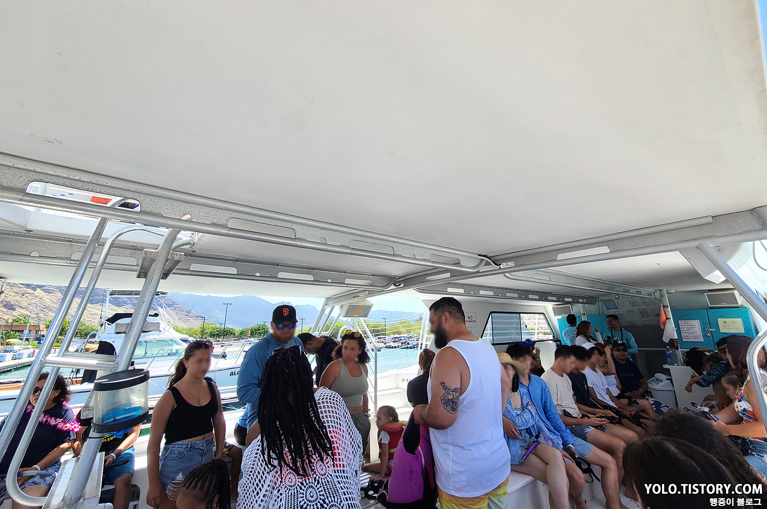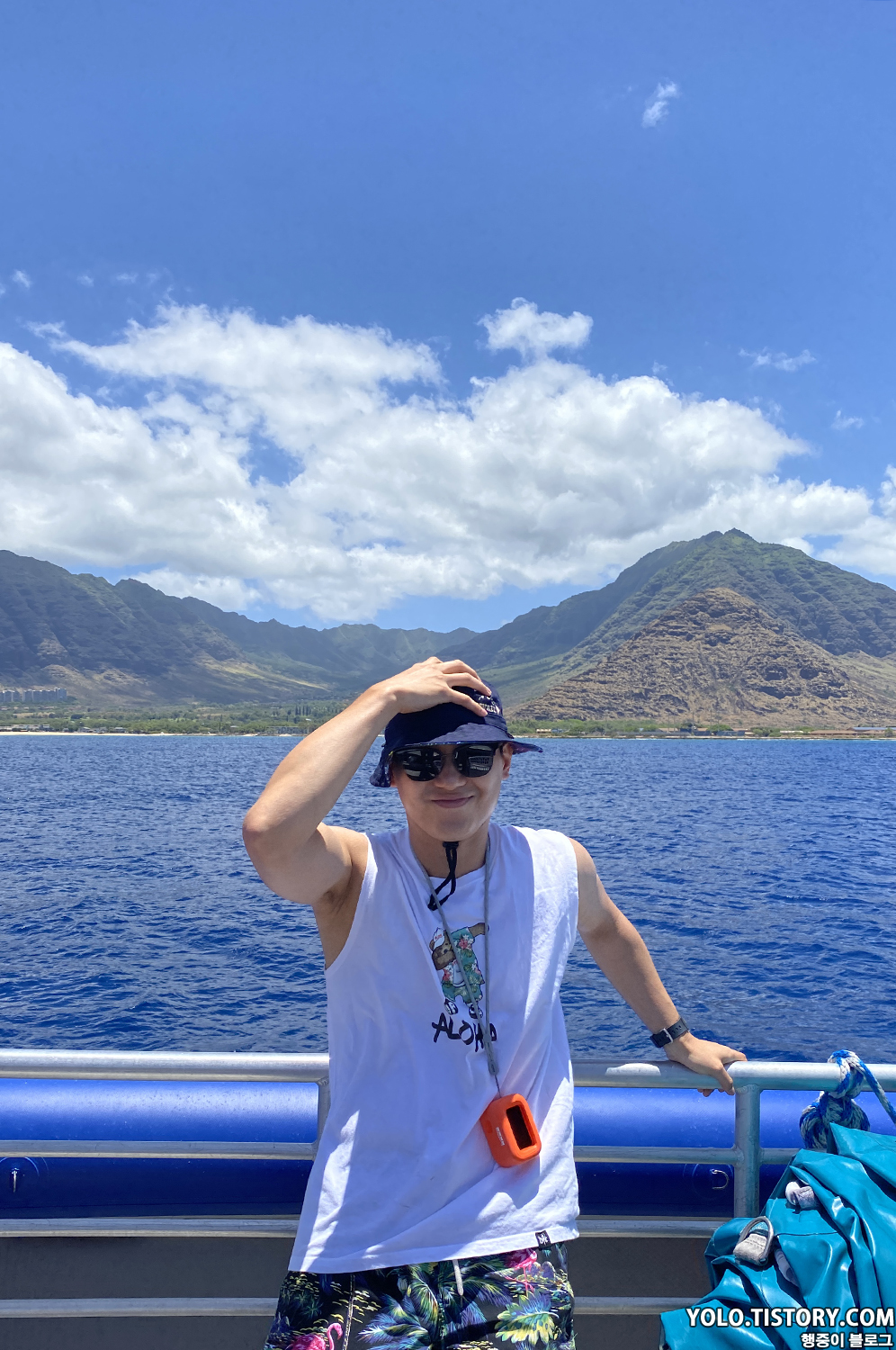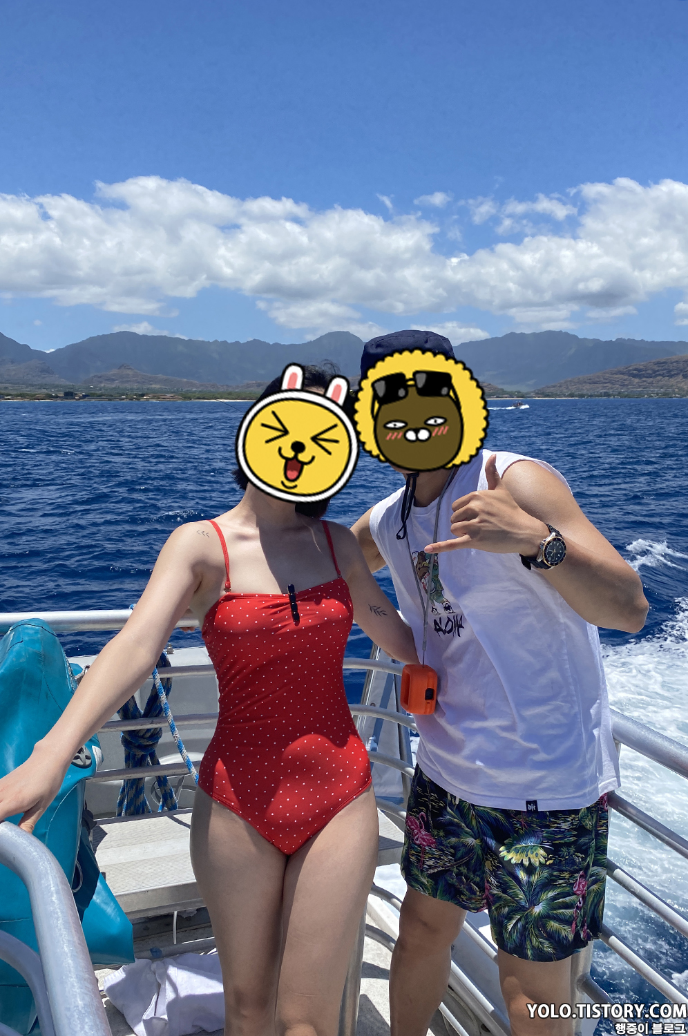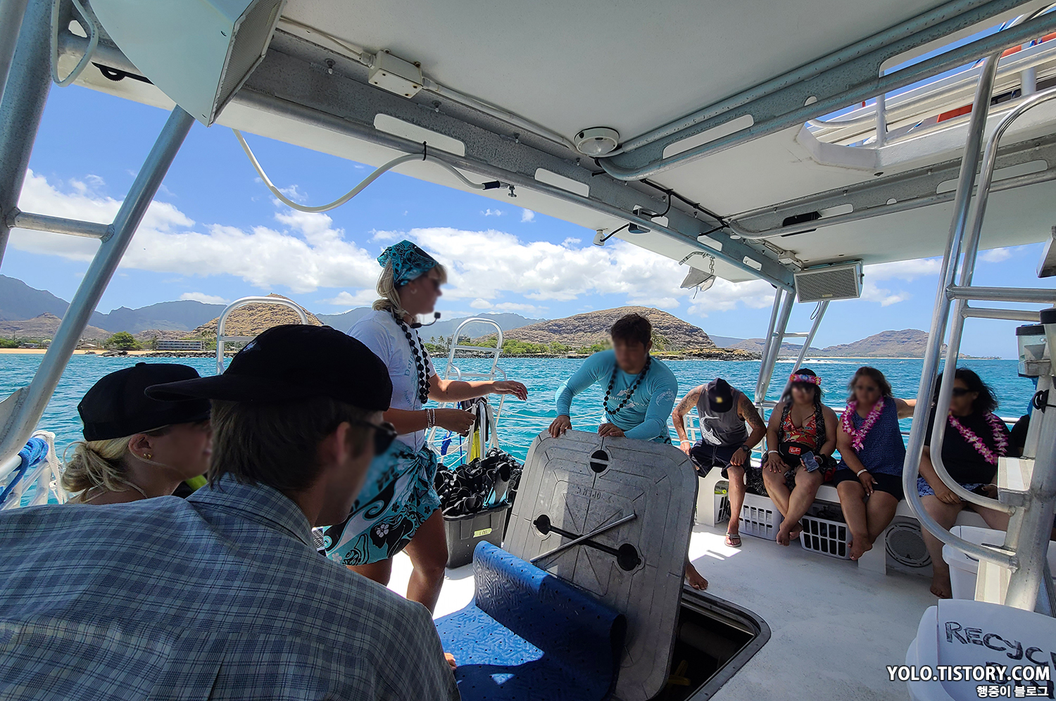 보트에 간이 미끄럼틀도 설치되어서 재밌게 탔다. 스노클링도 다 끝난 뒤 돌아가는 길엔 치킨 도시락이 점심으로 나왔는데, 맛은 그다지... 캡틴쿡 스노클링과 다르게 여기선 음료를 $5에 판매했다. 아쉬운 점.. 아내는 다른 사람이 오바이트를 하는 걸 봐서 속도 안 좋고 멀미도 했다. 우리는 개인 스노클 장비를 가지고 갔었는데 정리를 하다 보니 내 장비가 사라져 있었다. 알고 보니 색상이 다 비슷해서 직원이 가져갔던 것이었다. 항구에 거의 도착하니, 훌라 댄스파티가 열렸다. 직원들의 실력이 그렇게 좋지 못했지만 열심히 추는 모습에 나도 모르게 흥이 났다.