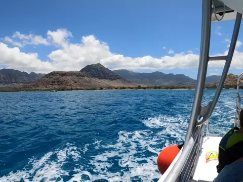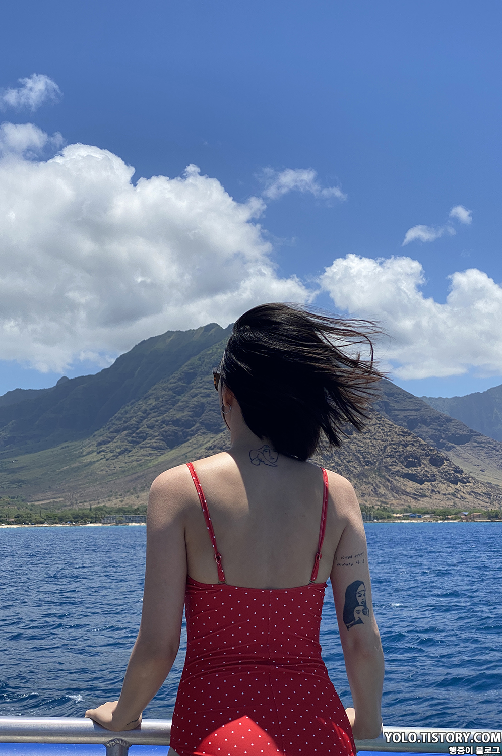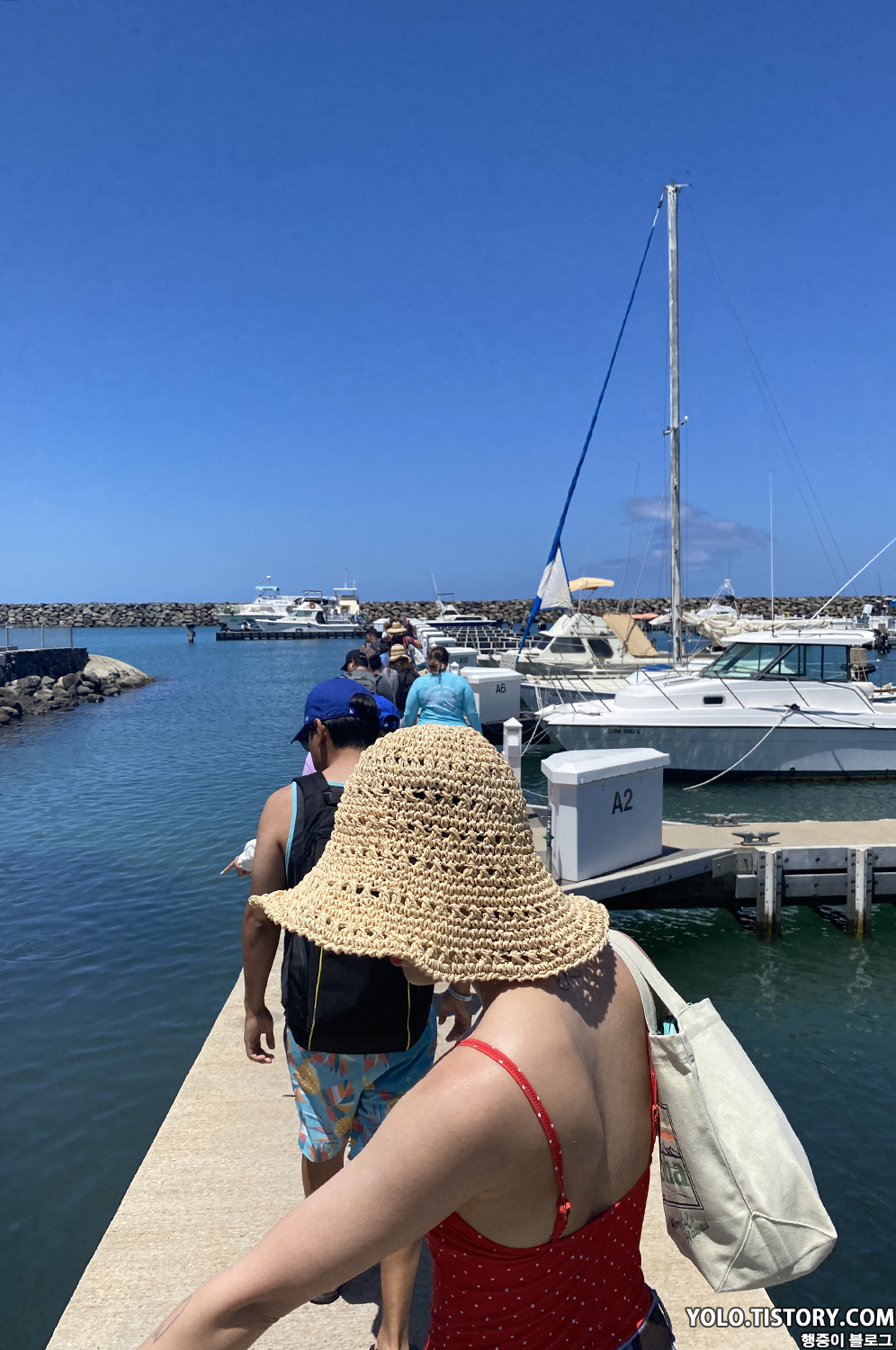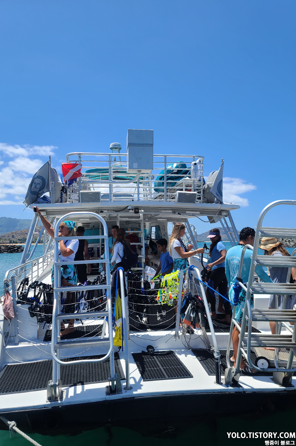 보트에 간이 미끄럼틀도 설치되어서 재밌게 탔다. 스노클링도 다 끝난 뒤 돌아가는 길엔 치킨 도시락이 점심으로 나왔는데, 맛은 그다지... 캡틴쿡 스노클링과 다르게 여기선 음료를 $5에 판매했다. 아쉬운 점.. 아내는 다른 사람이 오바이트를 하는 걸 봐서 속도 안 좋고 멀미도 했다. 우리는 개인 스노클 장비를 가지고 갔었는데 정리를 하다 보니 내 장비가 사라져 있었다. 알고 보니 색상이 다 비슷해서 직원이 가져갔던 것이었다. 항구에 거의 도착하니, 훌라 댄스파티가 열렸다. 직원들의 실력이 그렇게 좋지 못했지만 열심히 추는 모습에 나도 모르게 흥이 났다.