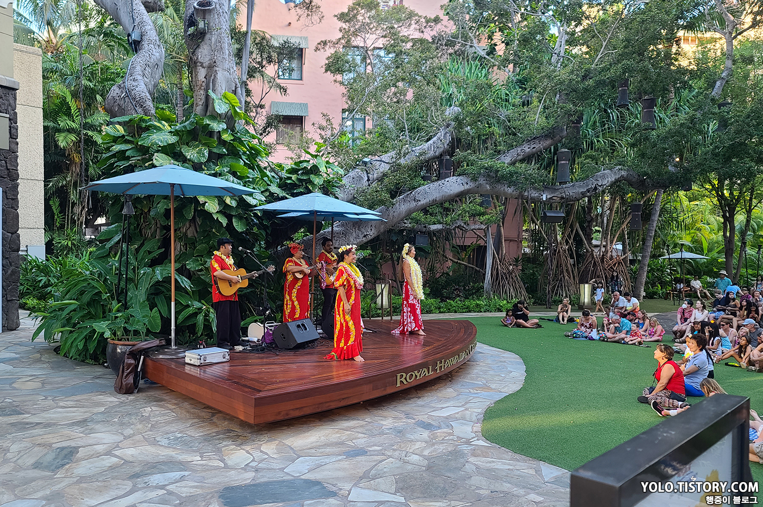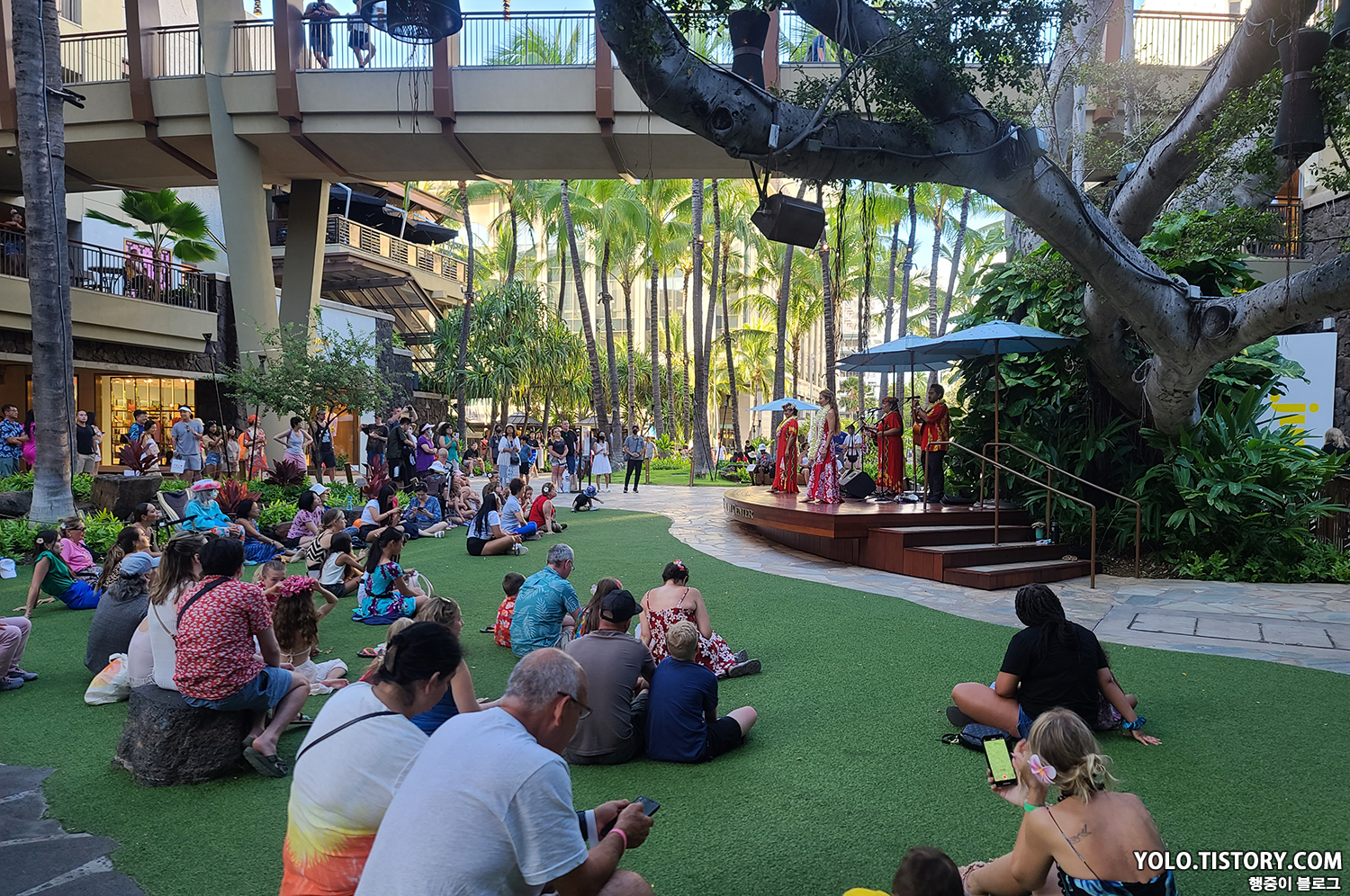숙소에 도착해서 샤워를 하고 깔끔하게 입고 나갔다. 로얄 하와이안 센터 앞에 간이 공연이 진행되고 있었다. 얼핏 보니 저번에 갔던 하우스 위드 아웃 어 키에서 공연했던 그분이었던 것으로 추정되었다.