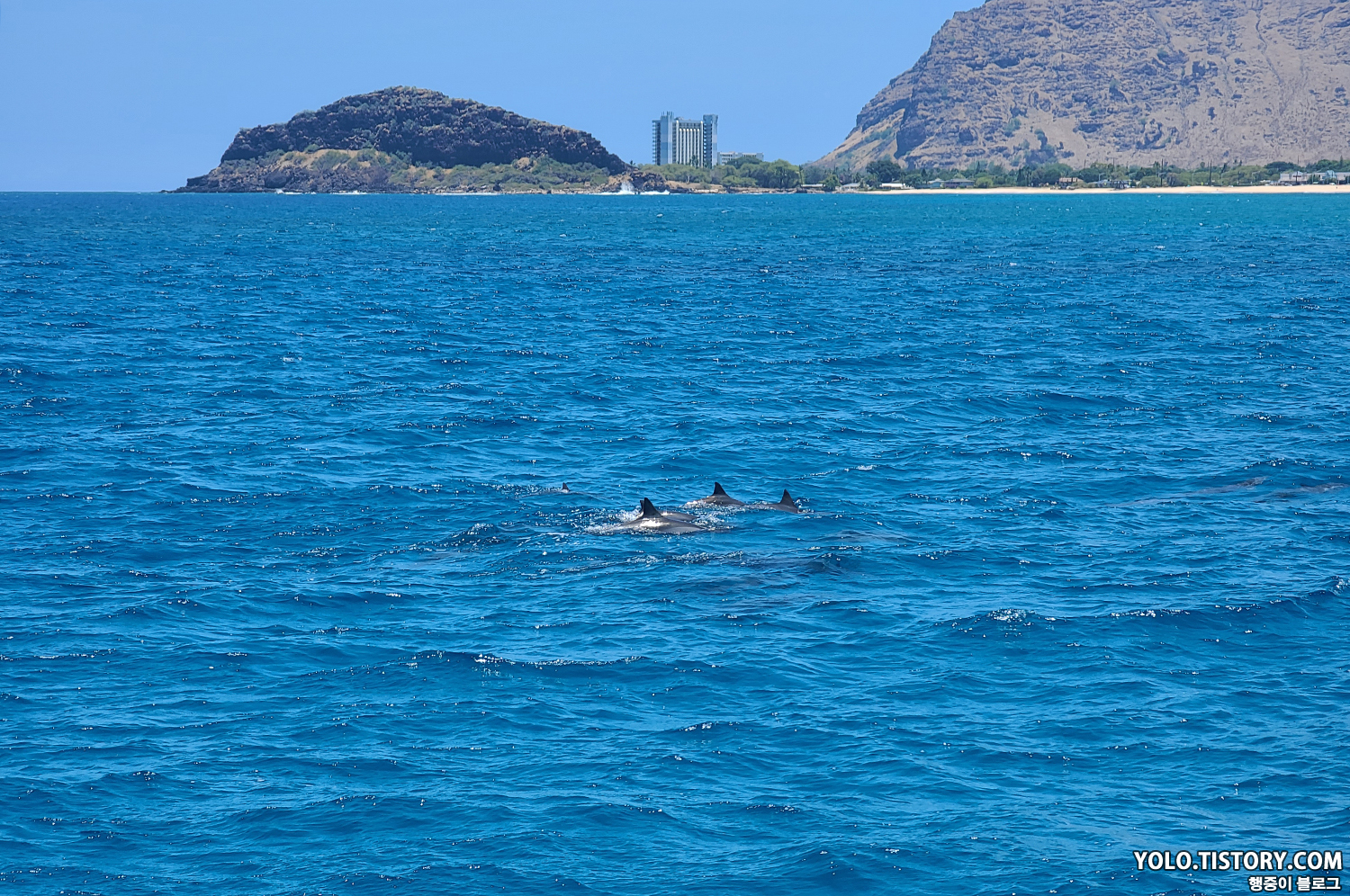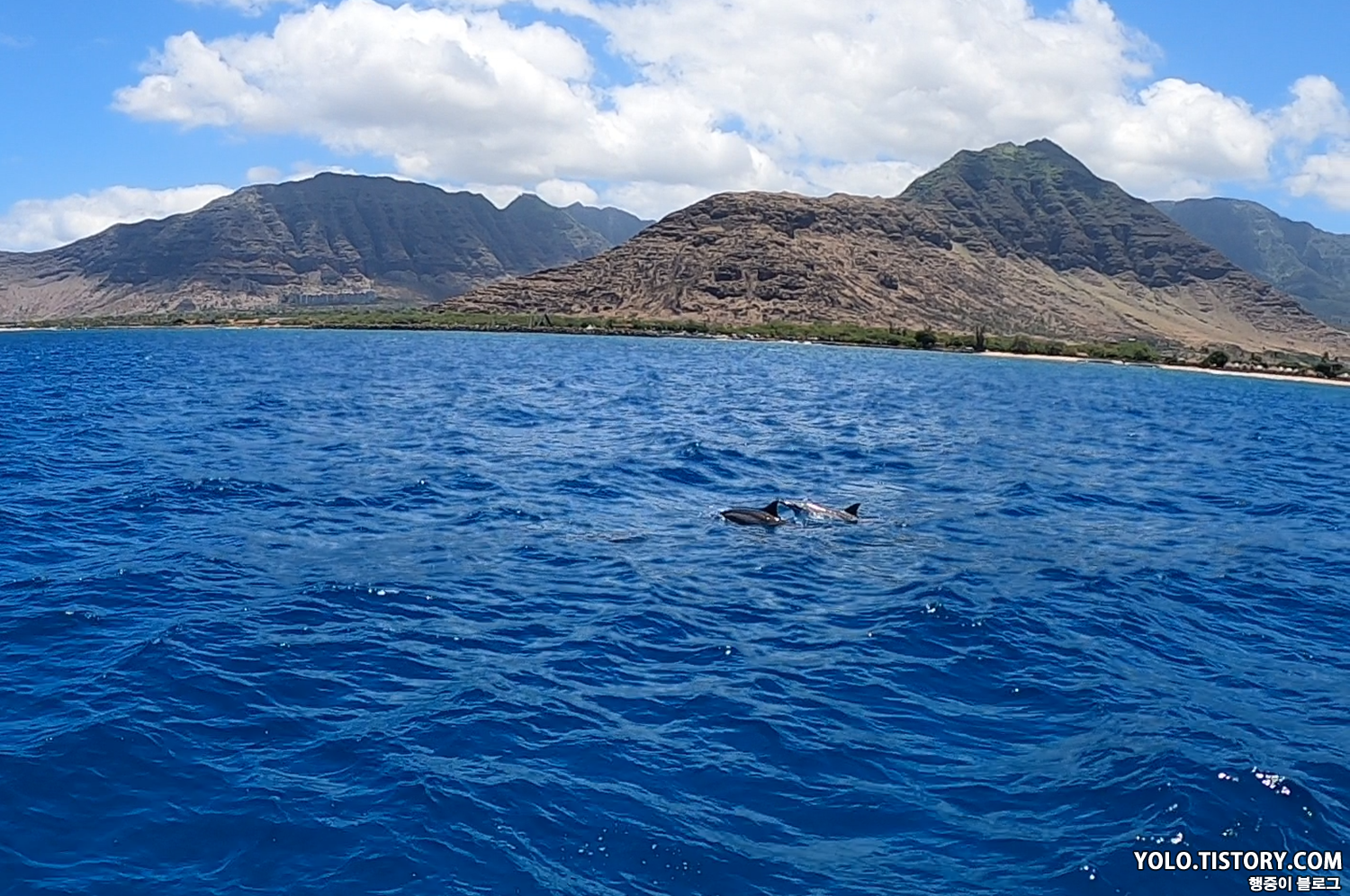 배가 출항하고 난 뒤 30분이나 지났을까? 돌고래 떼가 보이기 시작했다. 10마리 정도 되는 돌고래 무리들이 헤엄을 치는 모습을 가까이에서 볼 수 있었다. 어떤 돌고래는 물 위로 튀어올라 묘기도 부렸다.