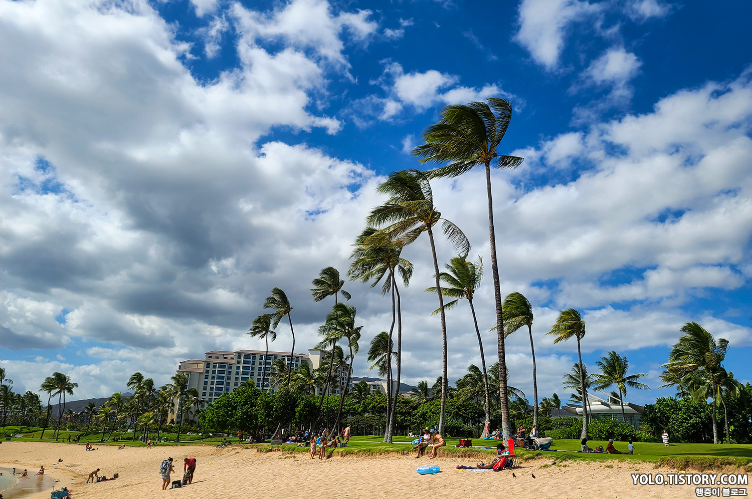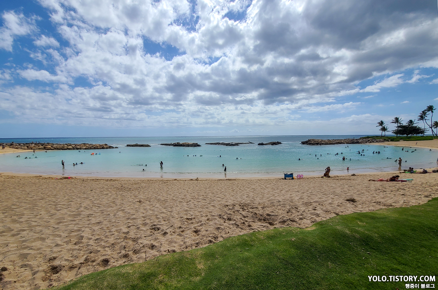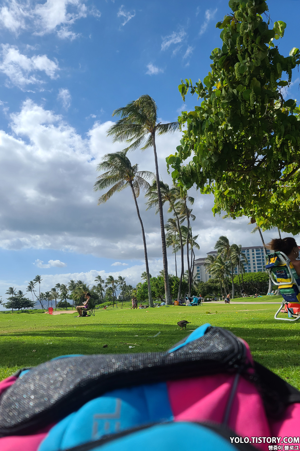돌핀앤유 투어가 생각보다 빨리 끝나서 근처에 위치한 코올리나 해변으로 갔다. 코올리나 해변은 메리어트 코올리나 비치클럽 내부에 위치한 해변이지만, 무료로 개방된 해변이다. 해변 공원 바로 앞 주차장은 무료인데, 마침 자리가 있어서 다행이었다. 물도 얕고 점진적으로 깊어져서 아이들이 놀기 좋은 해변이었던 것 같다. 날이 좋아서 태닝은 덤으로 했다.