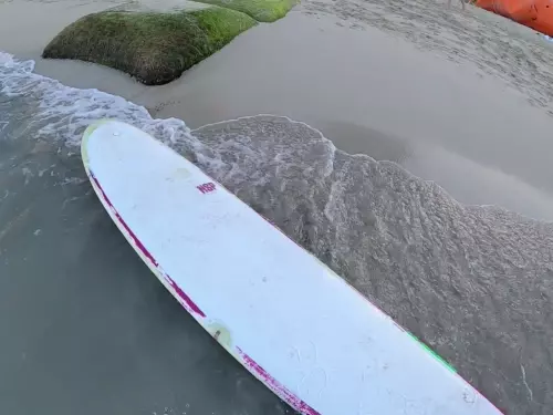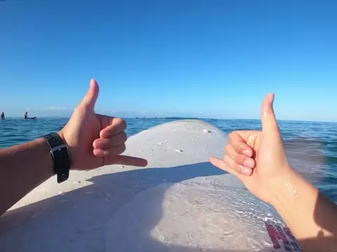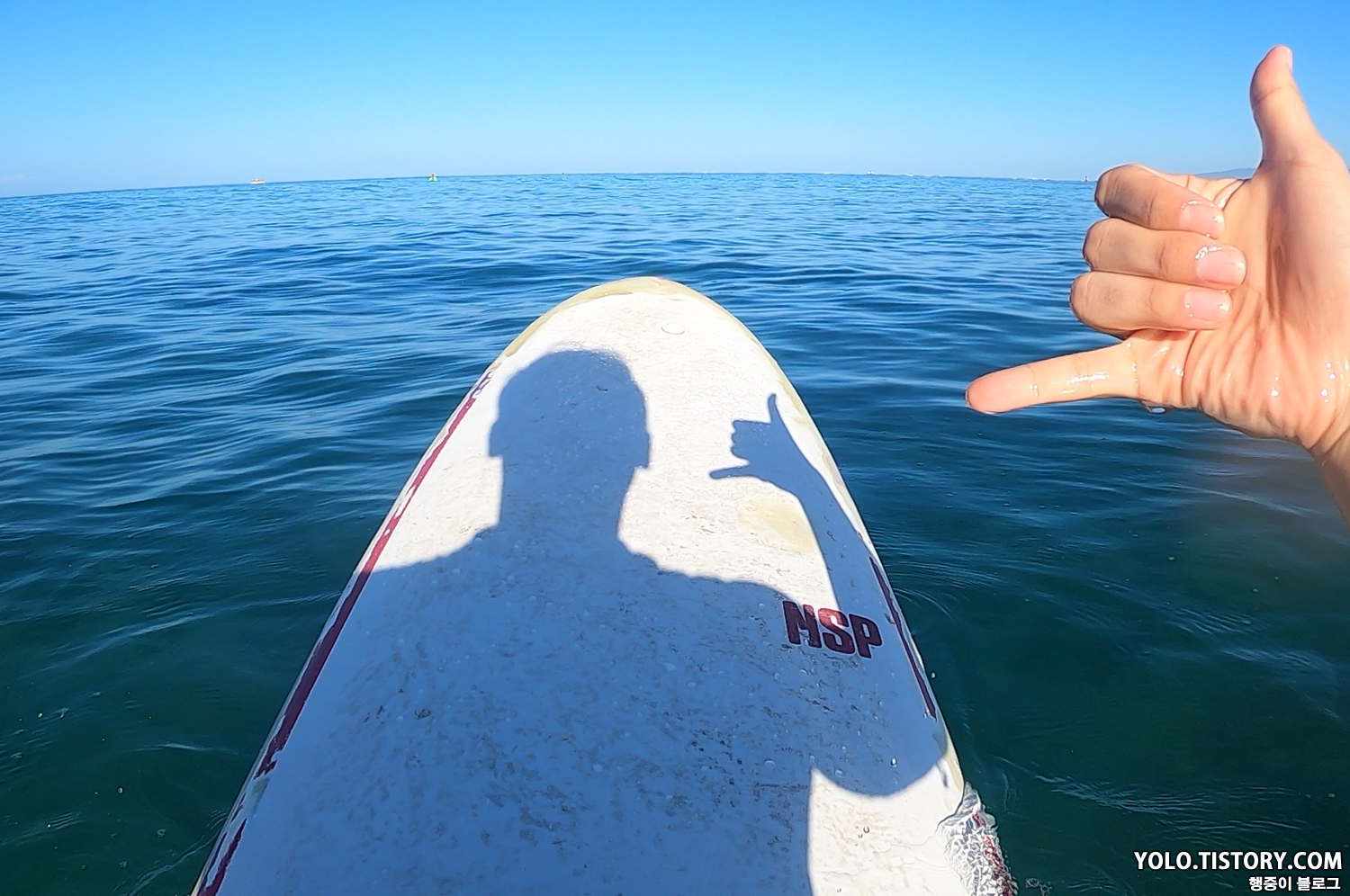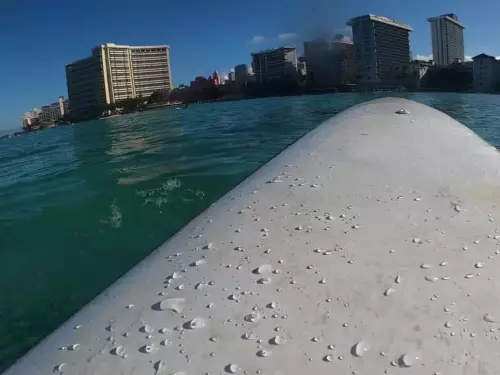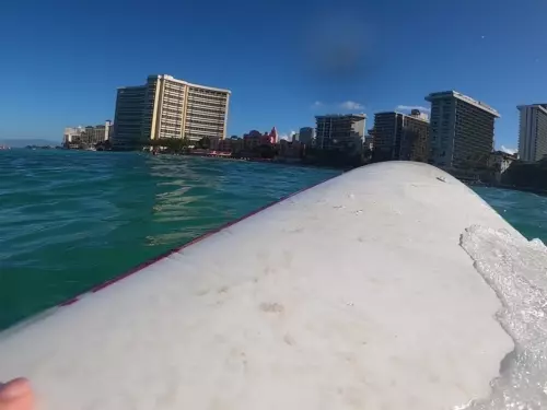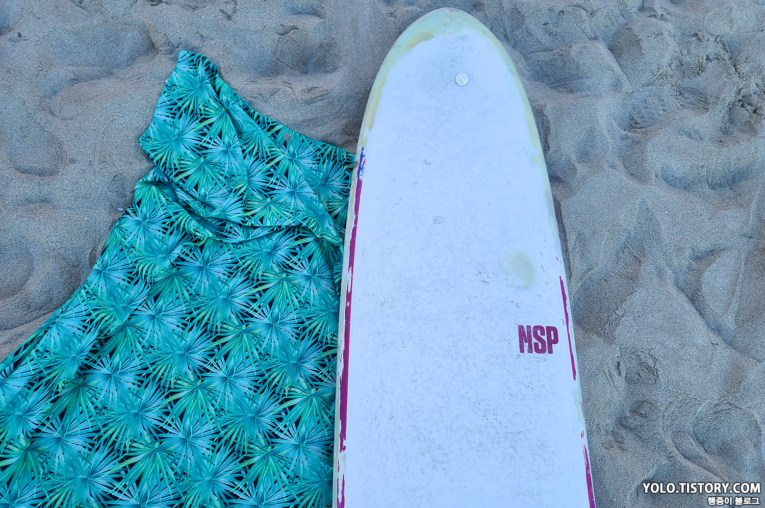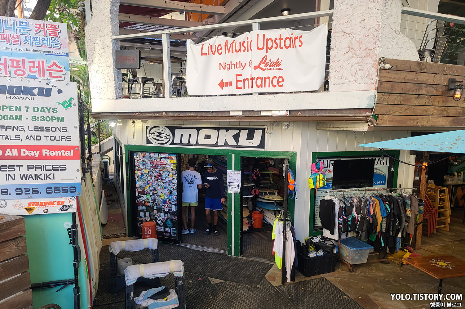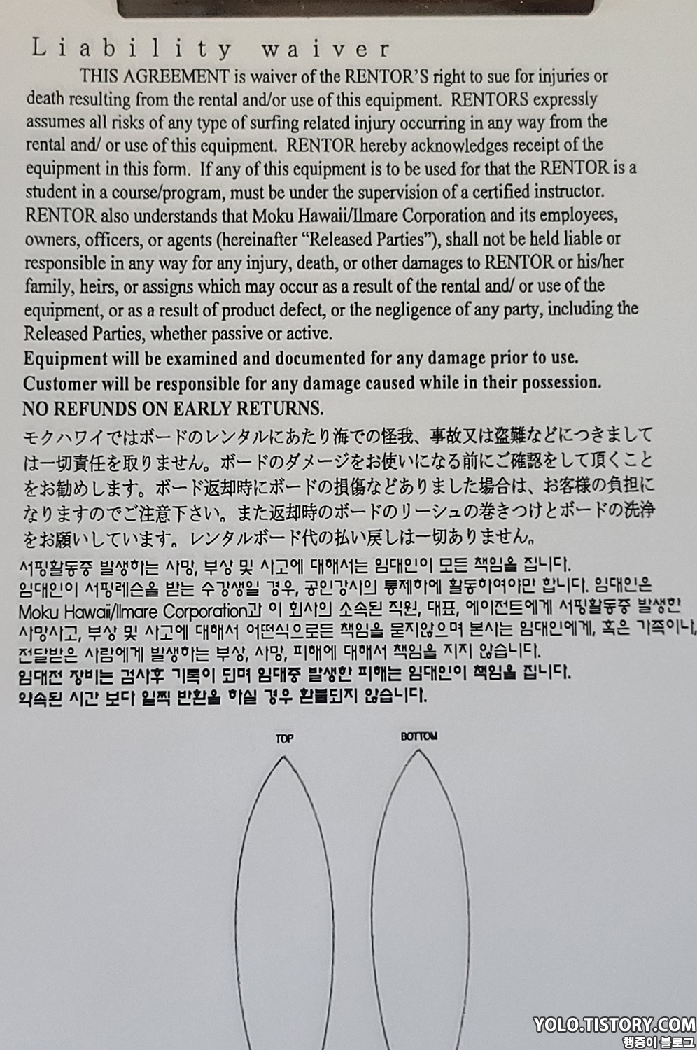 아침 6시 30분에 기상하여 대충 눈꼽만 떼고, 와이키키 해변에서 약 3분 정도 거리에 있는 MOKU라는 서프 샵에서 보드를 빌렸다. 해변 내에도 보드를 대여해 주지만 가격대가 조금 있다. 반면 MOKU는 2시간에 $10라는 저렴한 가격에 대여가 가능했다. 간단한 서류에 싸인을 하고, 직원에게 타기 쉬운 보드를 추천받았다. 스펀지 보드만 타다가 에폭시 보드는 처음이라 떨렸다. 와이키키 해변 바닥엔 돌이 많아서 맨발로 들어가긴 위험했지만 아쿠아 슈즈가 없어서 떨어지지 않겠다 다짐을 하고 출발!